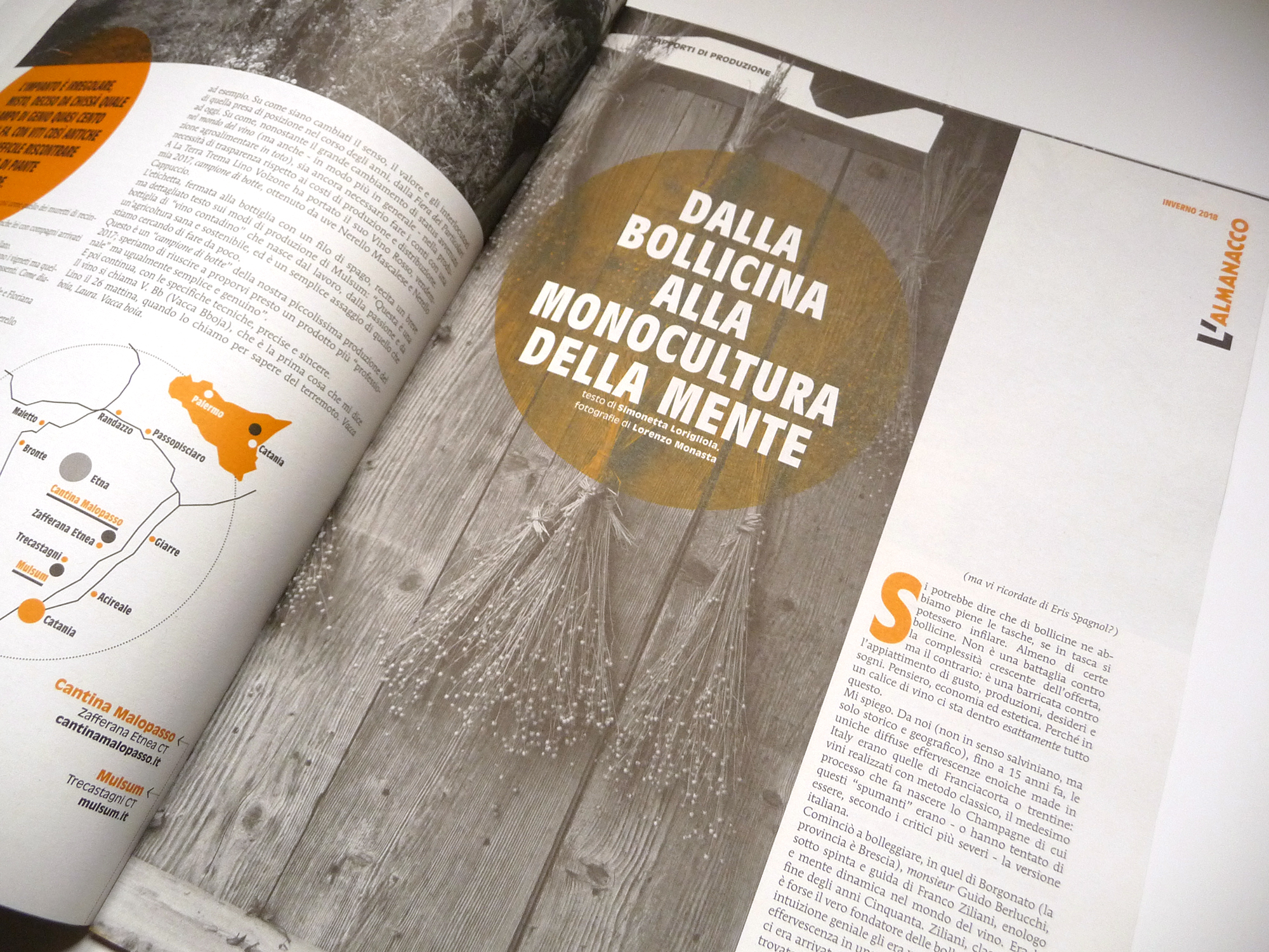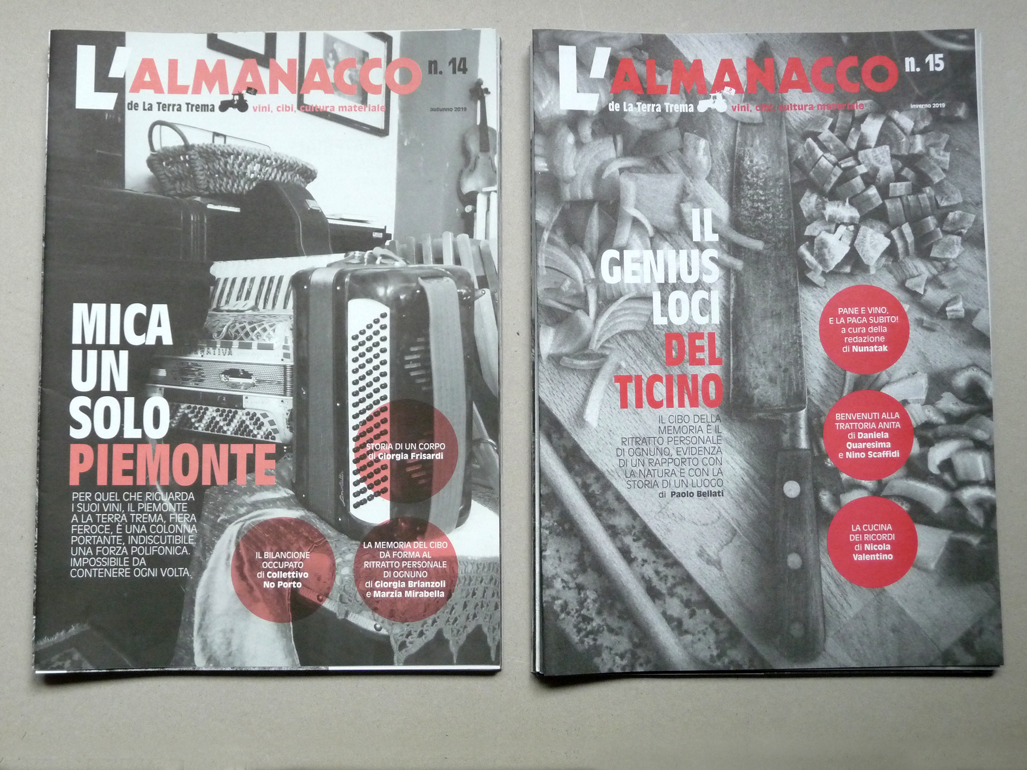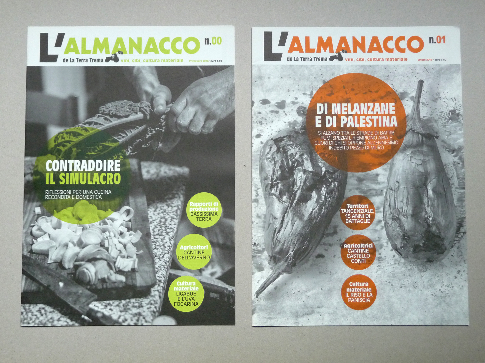 L’Almanacco is a quarterly magazine published by the association La Terra Trema. Each issue has 16 pages. For the best environmental sustainability, only two colors (black + one Pantone color) are used. Furthermore, the final format is designed to cause as little paper waste as possible.