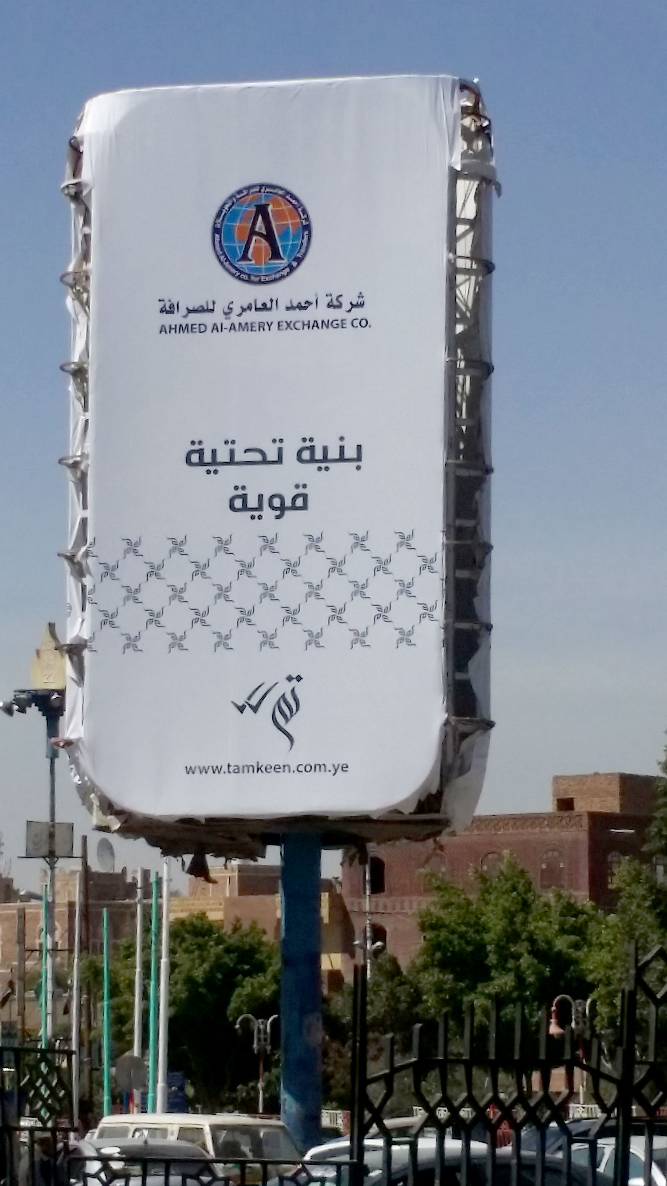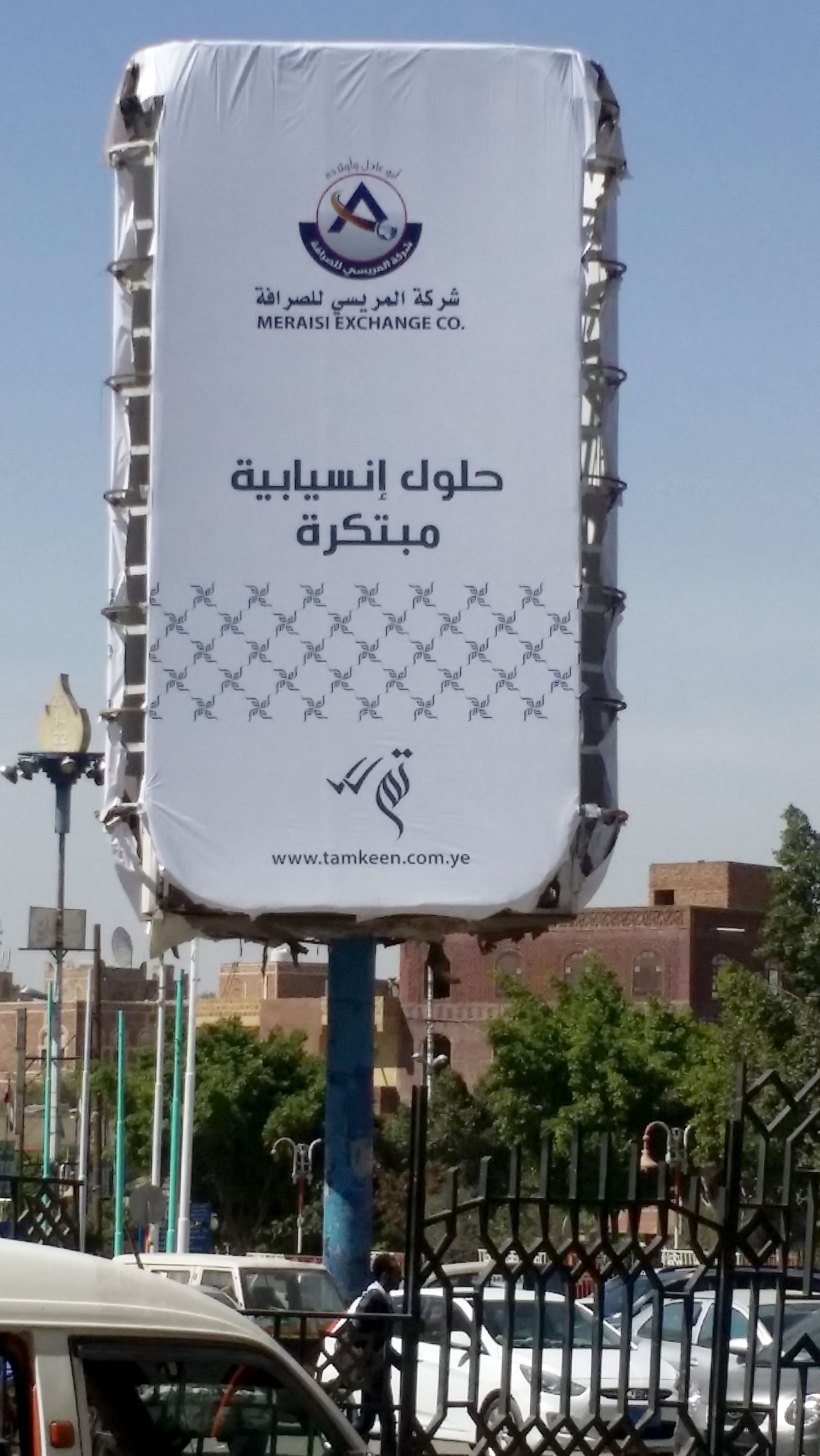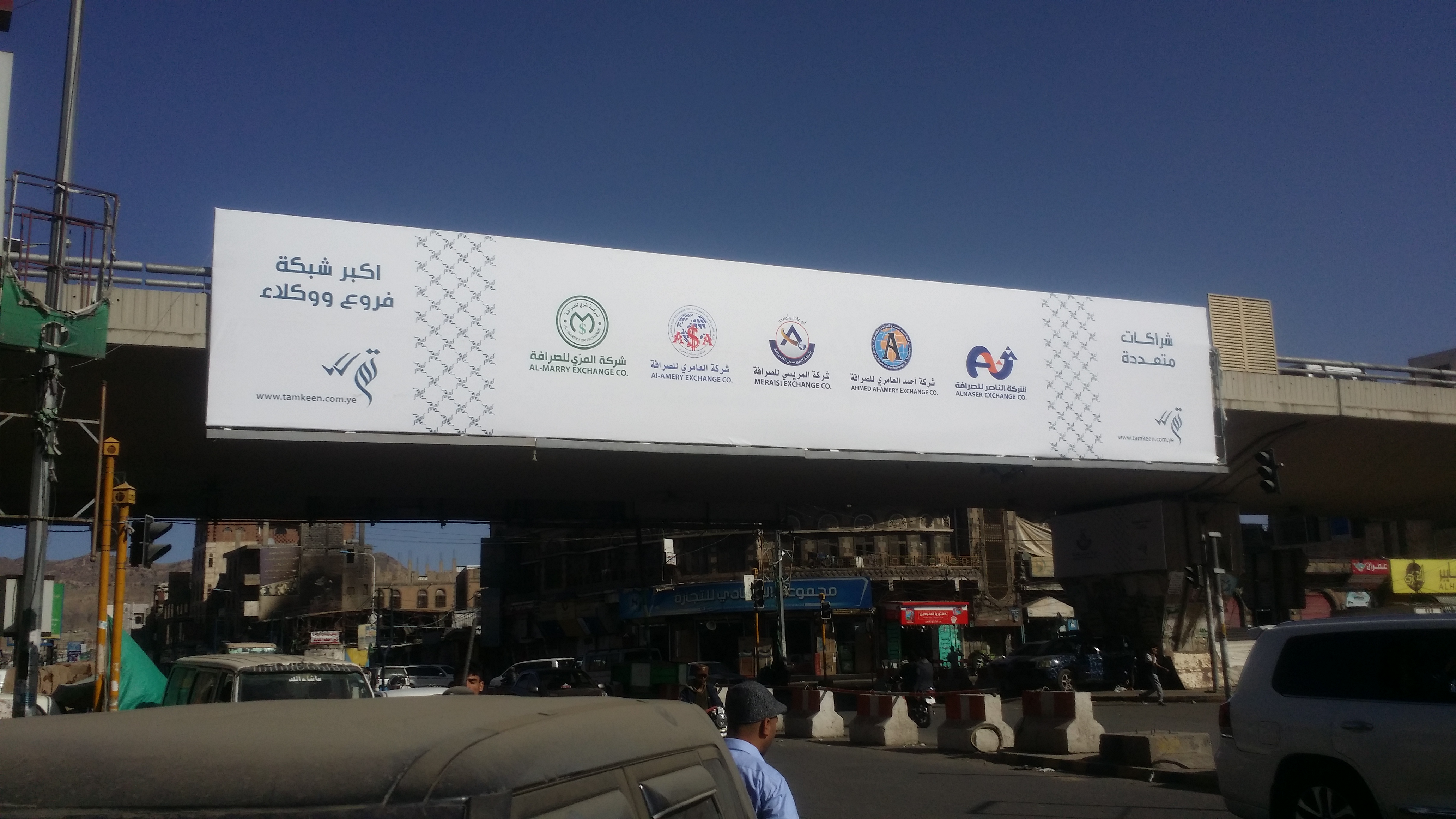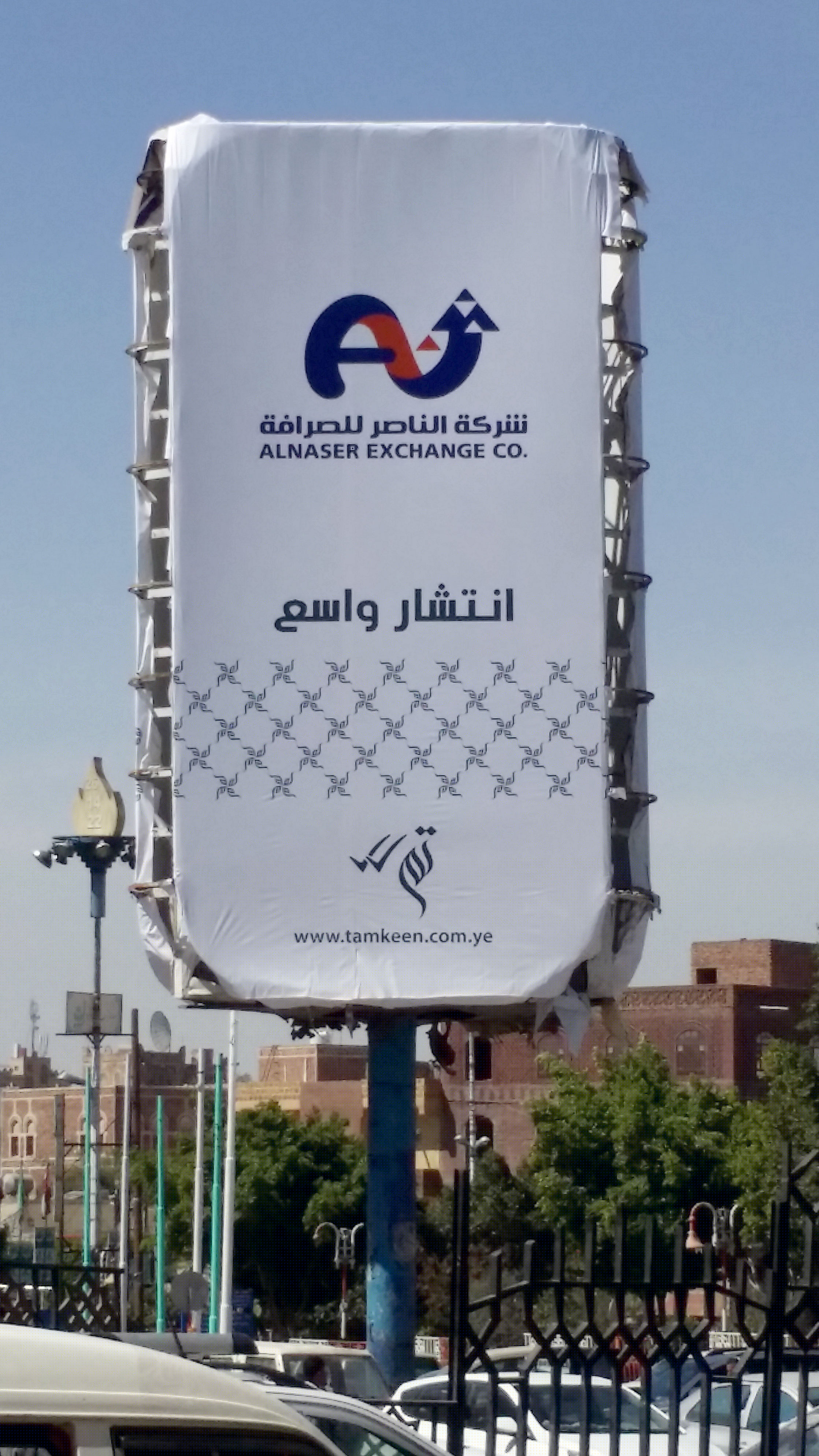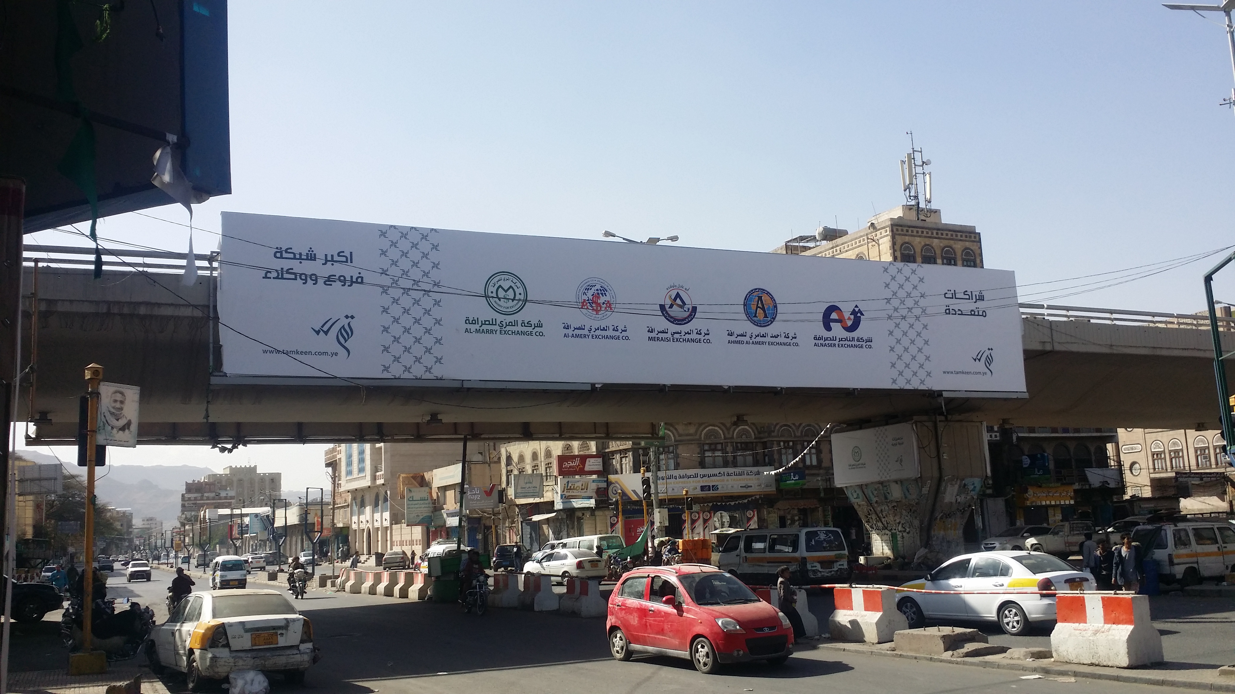 Shown in this post are a three-sided rotating sign board and three advertising banners, spotted in the streets of Sanaa. The primary font in use is Nasser. The word تم shown next to double checkmark translates to “done”. It’s shown in a typeface that’s similar to Bustan. However, the form of the dots don’t match Bustan’s. The names of the partner companies are set in a font named MCS Taybah S_U. The URL appears to use Myriad.