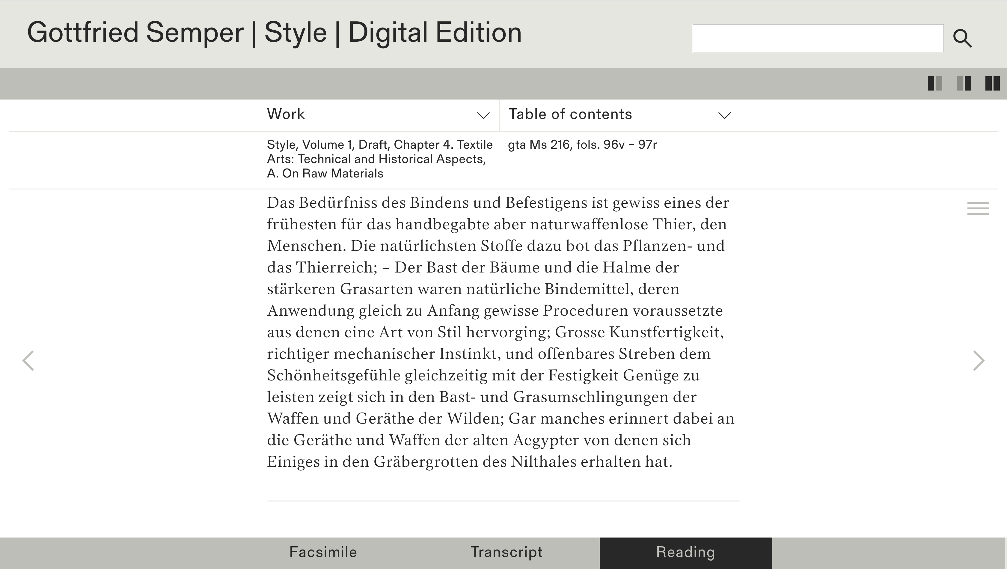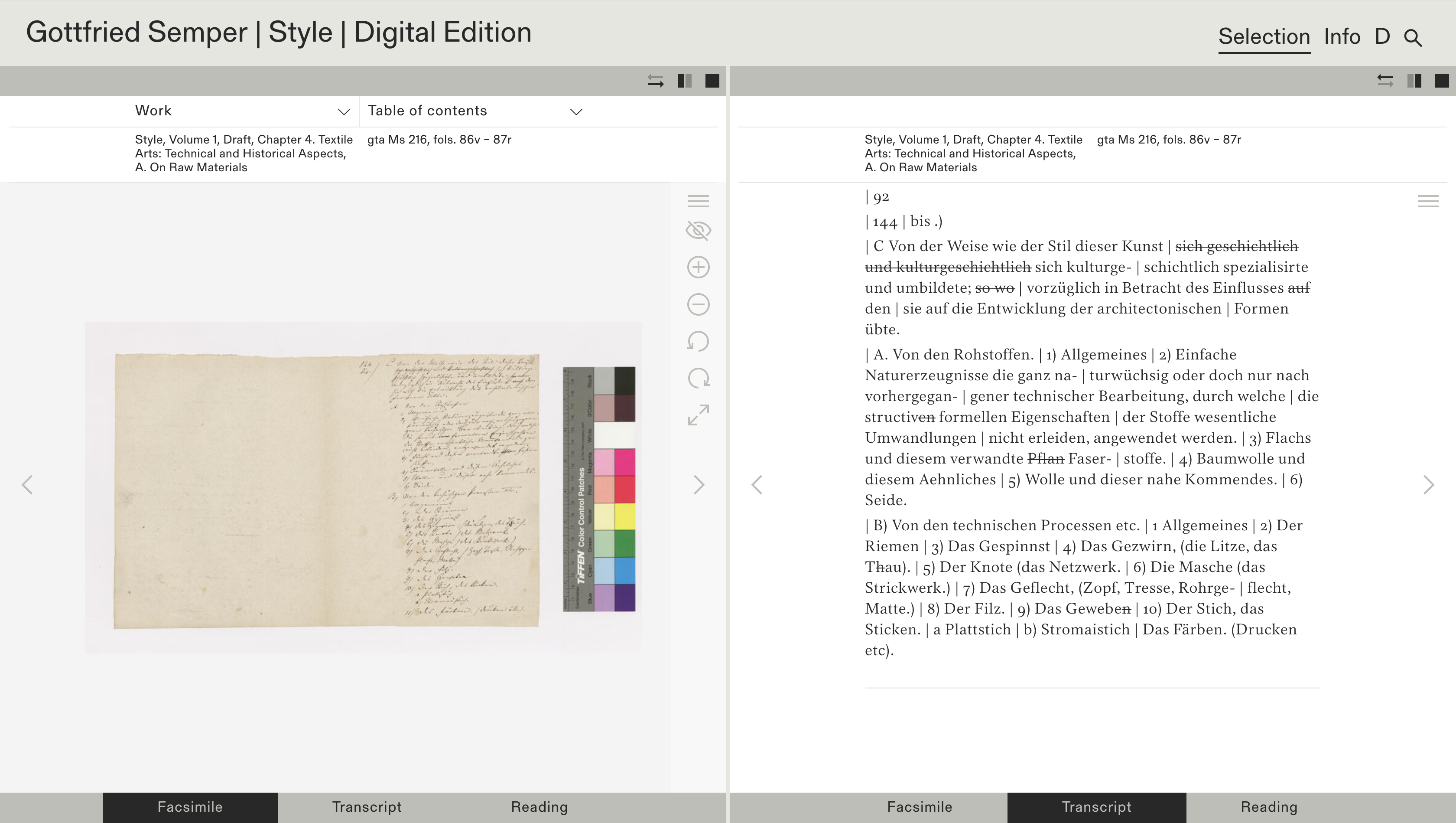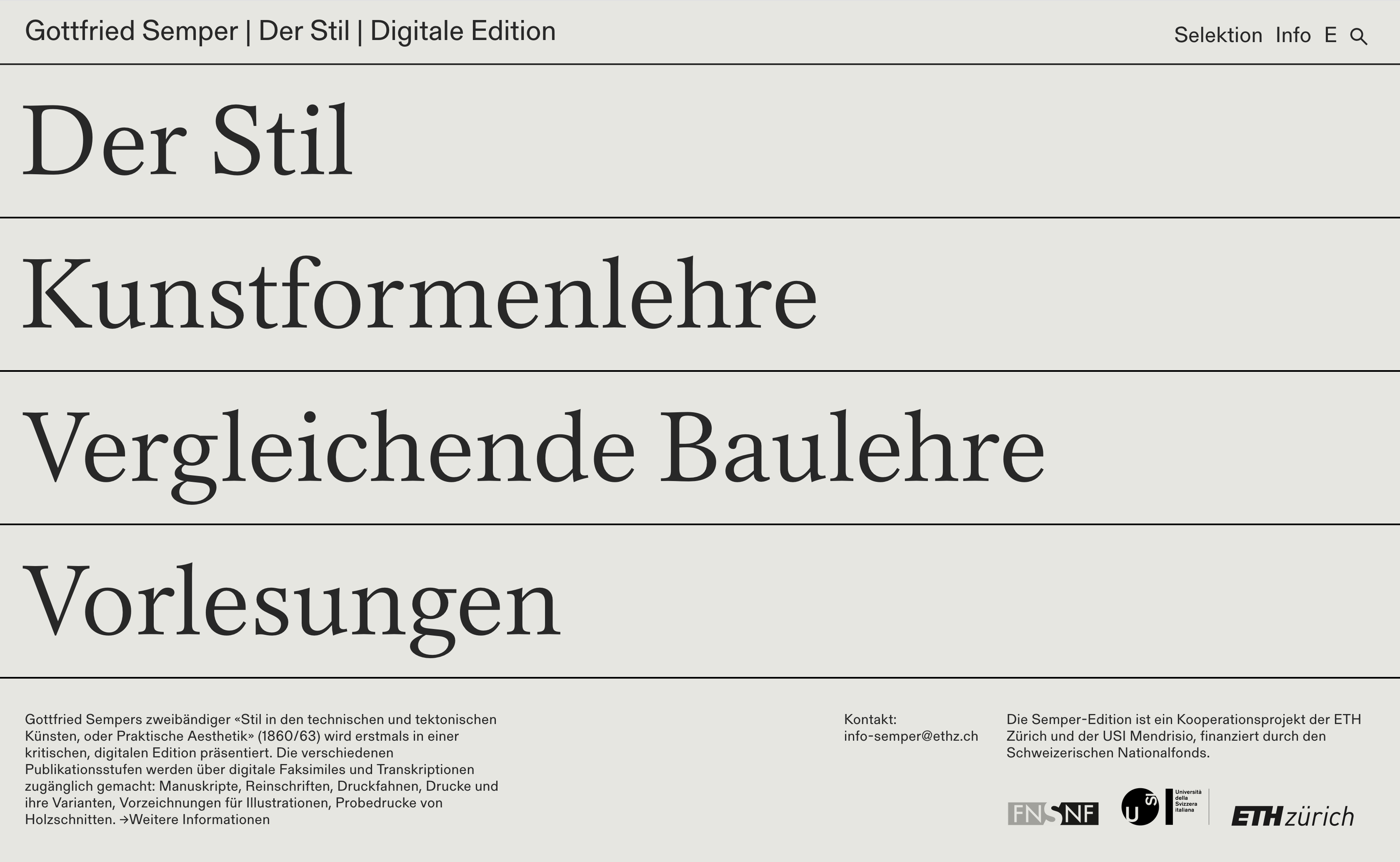 This digital publication – set in Lector FSL as well as Gerstner-Programm FSL – presents a critical edition of Gottfried Semper’s “Style in the technical and tectonic arts, or practical aesthetics.” This magnum opus of the German architect and theorist, published in two volumes in 1860 and 1863, is being made available together with its various versions for the first time on this site. Here the readers can access manuscript drafts and variants, fair copies, proofs, print versions, illustration sketches and lithograph proofs.