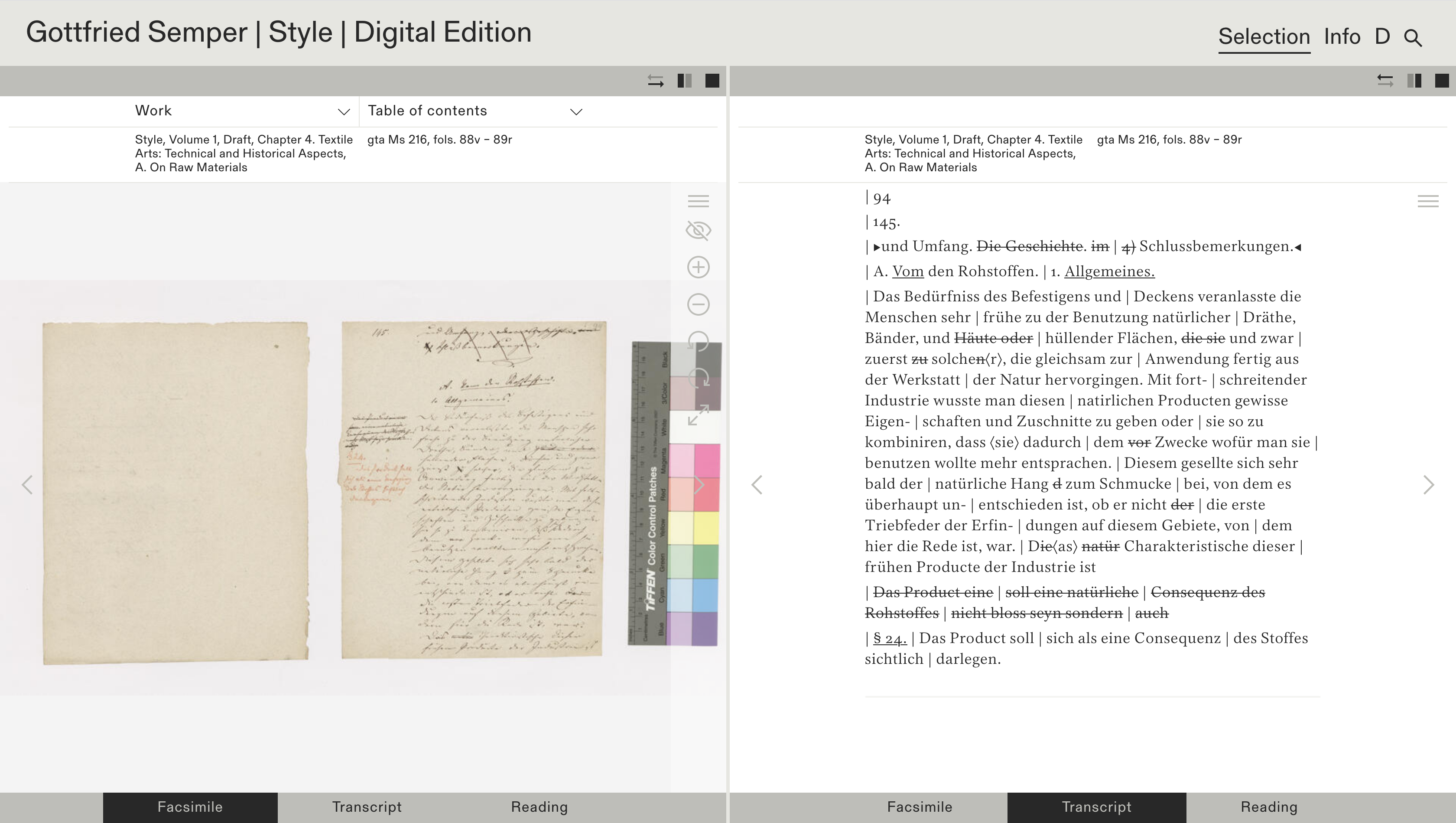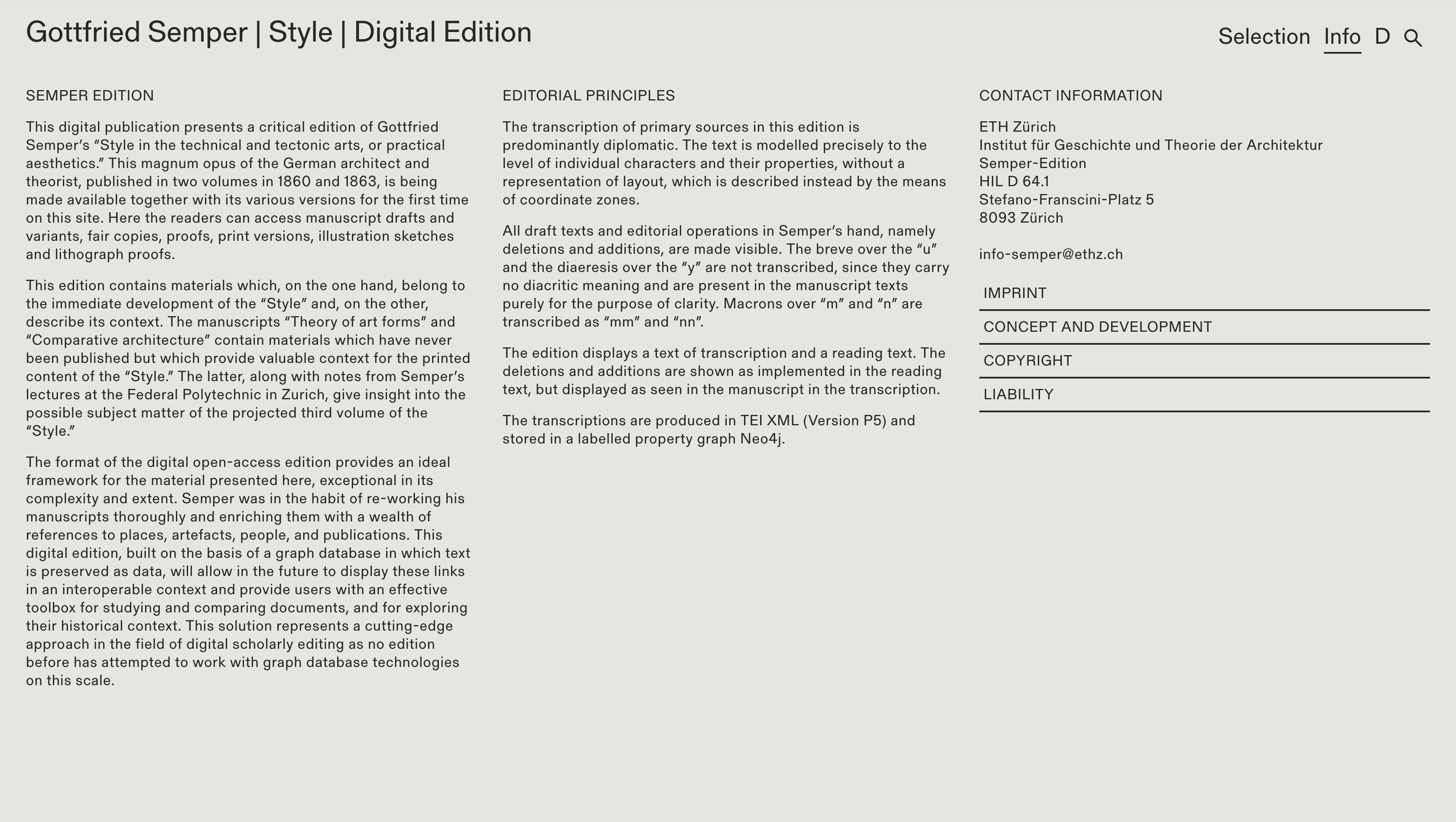 The format of the digital open-access edition provides an ideal framework for the material presented here, exceptional in its complexity and extent. Semper was in the habit of re-working his manuscripts thoroughly and enriching them with a wealth of references to places, artefacts, people, and publications. This digital edition, built on the basis of a graph database in which text is preserved as data, will allow in the future to display these links in an interoperable context and provide users with an effective toolbox for studying and comparing documents, and for exploring their historical context. This solution represents a cutting-edge approach in the field of digital scholarly editing as no edition before has attempted to work with graph database technologies on this scale.