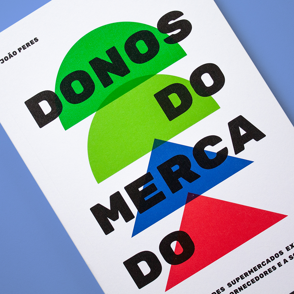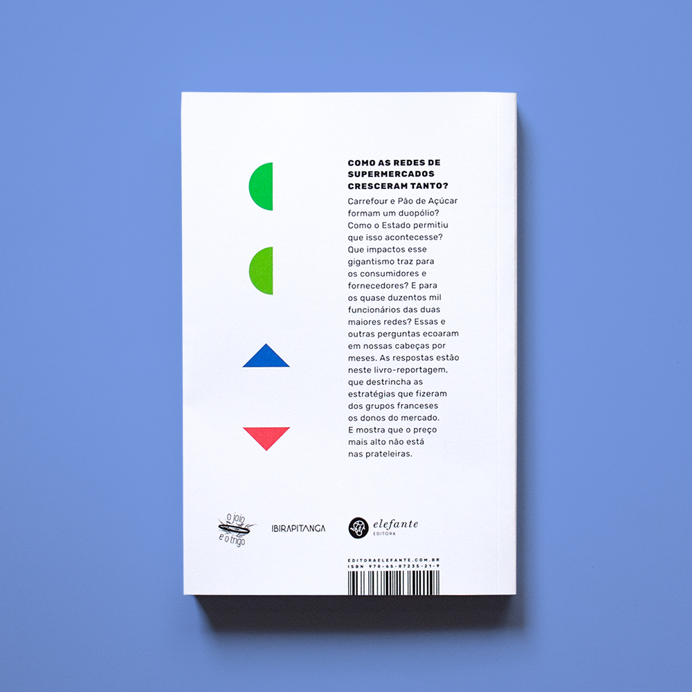 Arquivo was commissioned by Editora Elefante editors Tadeu Breda and Bianca Oliveira to design the cover. We chose Rubik, using its regular width and the monospaced version – the same fonts that are used on the O Joio e Trigo website. A set of abstract geometric shapes is used for the illustration that refers directly to the logos of the supermarket companies analyzed in the book. The two green semicircles allude to Grupo Pão de Açúcar and the blue and red triangles refer to the brand of the French multinational Carrefour.