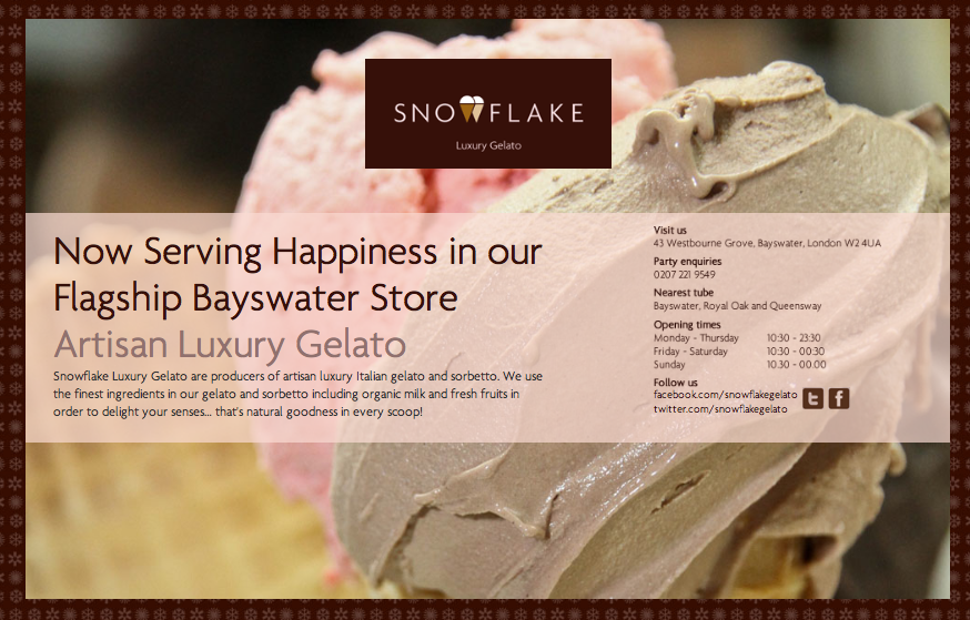 Snowflake Gelato Contributed by Webtype on May 23rd, 2013. Source: snowflakegelato.co.uk License: All Rights Reserved. Snowflake Gelato is a UK-based artisan gelato shop that uses Agenda on its homepage. Typefaces More about AgendaGet Agenda Formats Web (5623) Topics Food/Beverage (3059) Tagged withgelato (1)ice cream (63) Artwork location United Kingdom (3292) London (1820) In SetsWebtype (Webtype) (241) Post a comment Name Email – will not be published Website Your response Submit Comment More Agenda in use The Onion: “U.N. Acquires Nukes”unknownContributed by Sam Berlow Look At Me DVD coverContributed by Sam Berlow Star magazine2016Magazine StaffContributed by Greg Thompson Sponsor More in Food/Beverage Boldlyc. 2023WØRKSContributed by Roy Cranston Staff Pick Stonemill Slow Crafted Bakehouse2016unknownContributed by Florian Hardwig Reval Café TallinnunknownContributed by Olivia Harmon Cry Baby2022Connor MikitaGreat IndoorsContributed by Florian Hardwig Staff Pick More in Web Turner Duckworthc. 2022Turner DuckworthDaniel IoannouContributed by Daniel Ioannou Späti Holzbau identity and collateral2018Daniela SavoldelliWhite Stone DesignContributed by Kontour Die Praxis – Therapie & Training2021hellofarm design studioContributed by hellofarm Design Studio Your Future London website2021Studio CronicaContributed by Sergio Cameira Staff Pick More Fonts In Use 12 Matchac. 2024Base DesignContributed by Bold-Decisions.biz Staff Pick The Douglas Hyde2021Bureau BonanzaContributed by Bureau Bonanza Staff Pick LlavorsSenyor EstudiContributed by Lluís Serra Staff Pick Design Museum identity (2003, 2016)2016Graphic Thought FacilityStudio Fernando GutiérrezContributed by Stephen Coles Blog