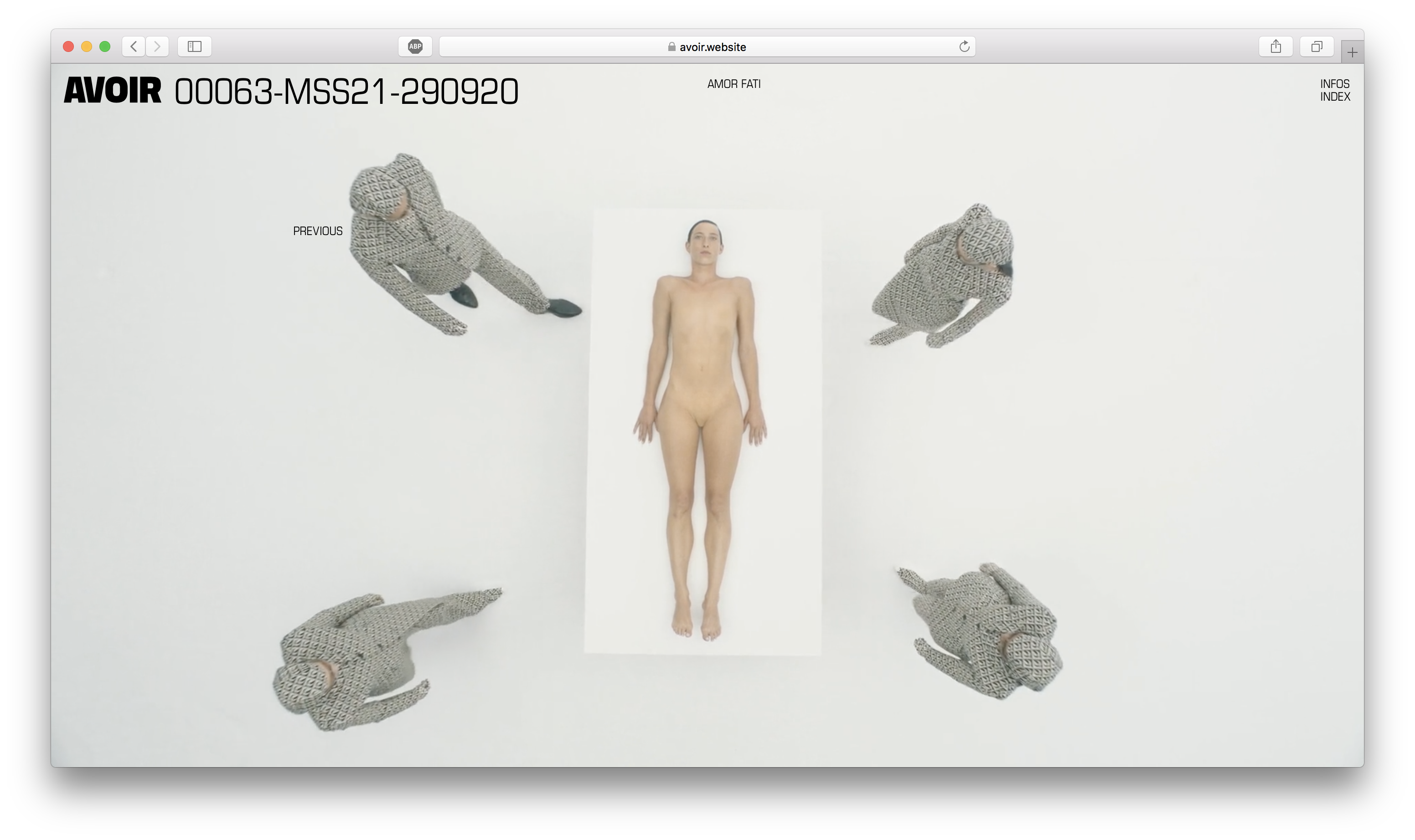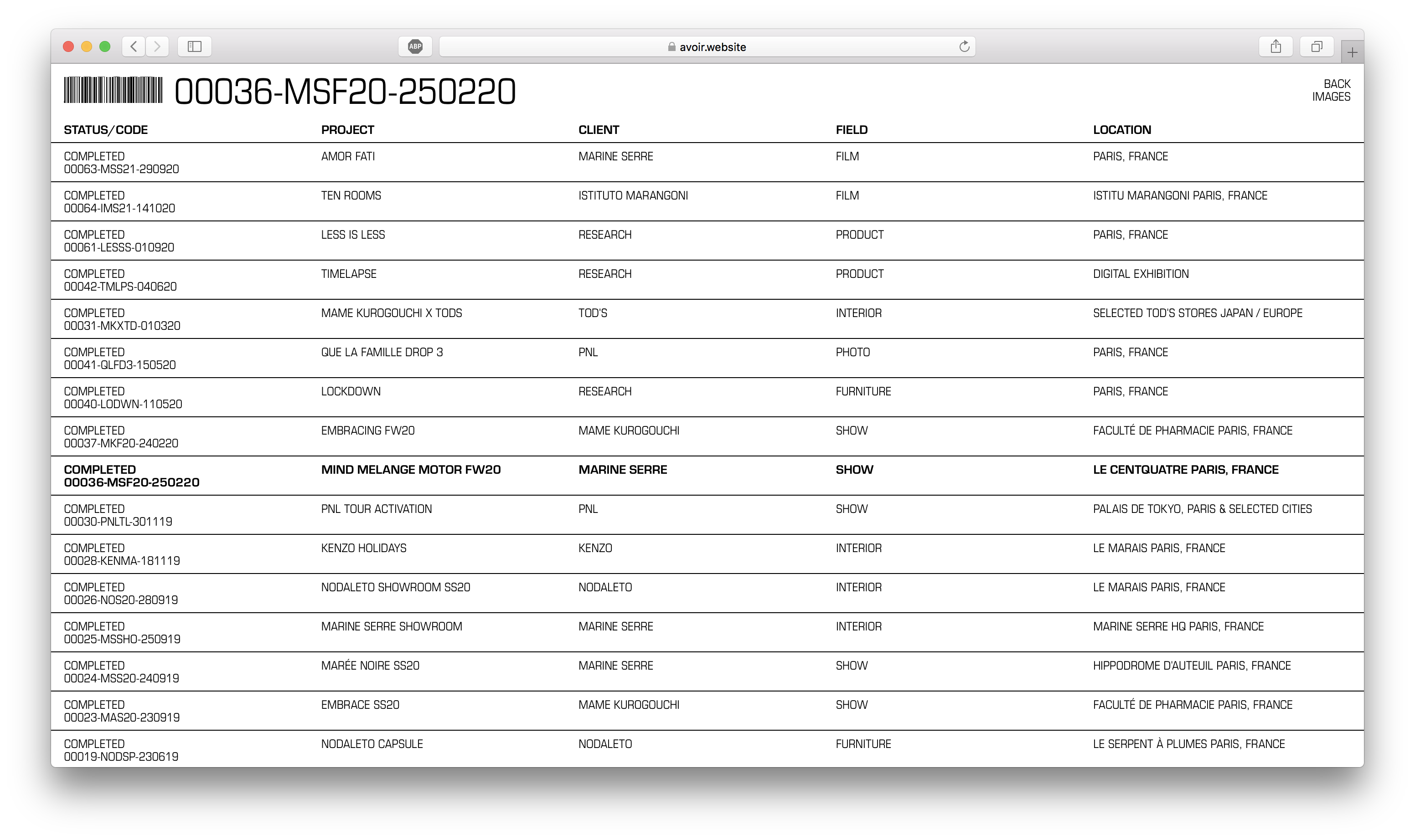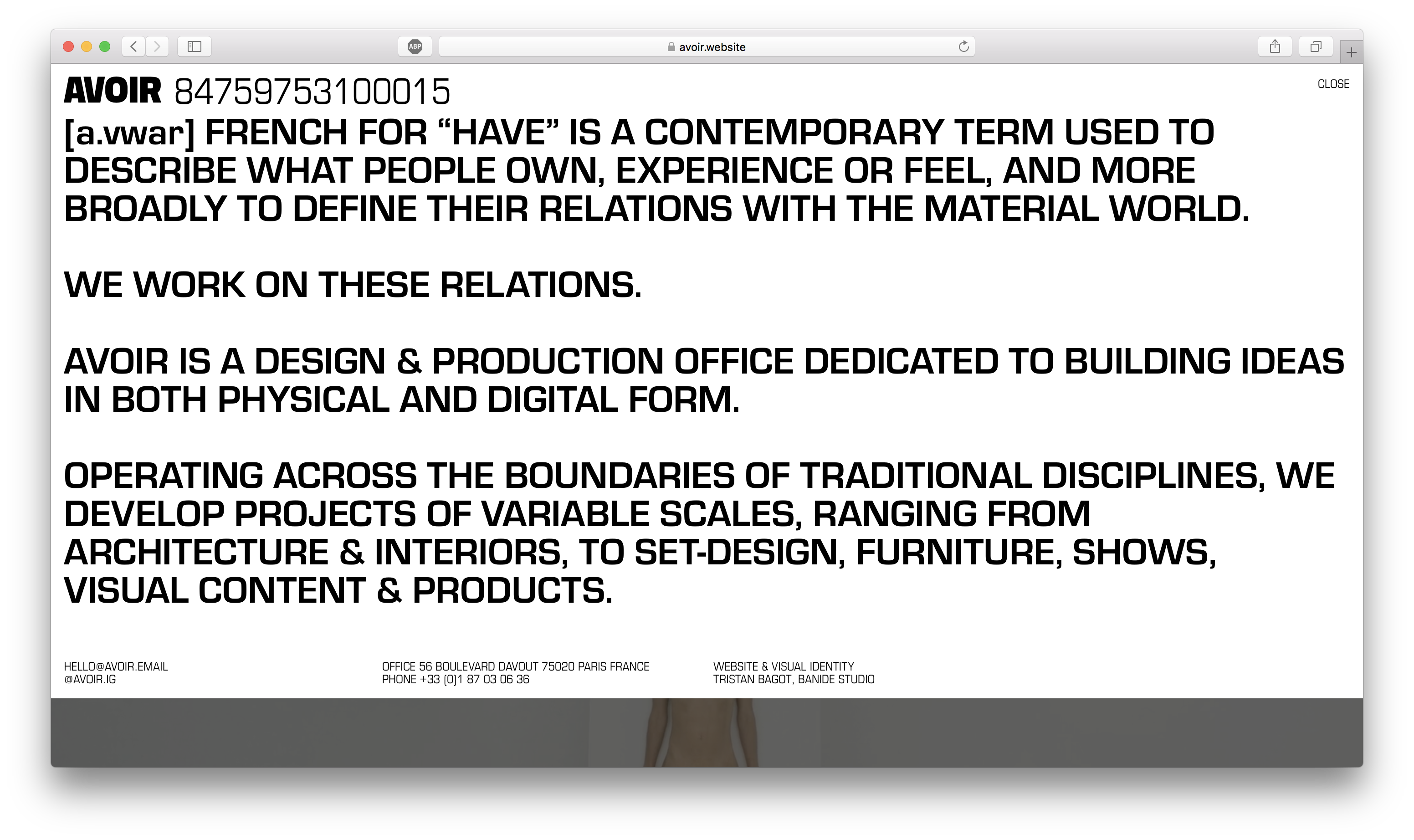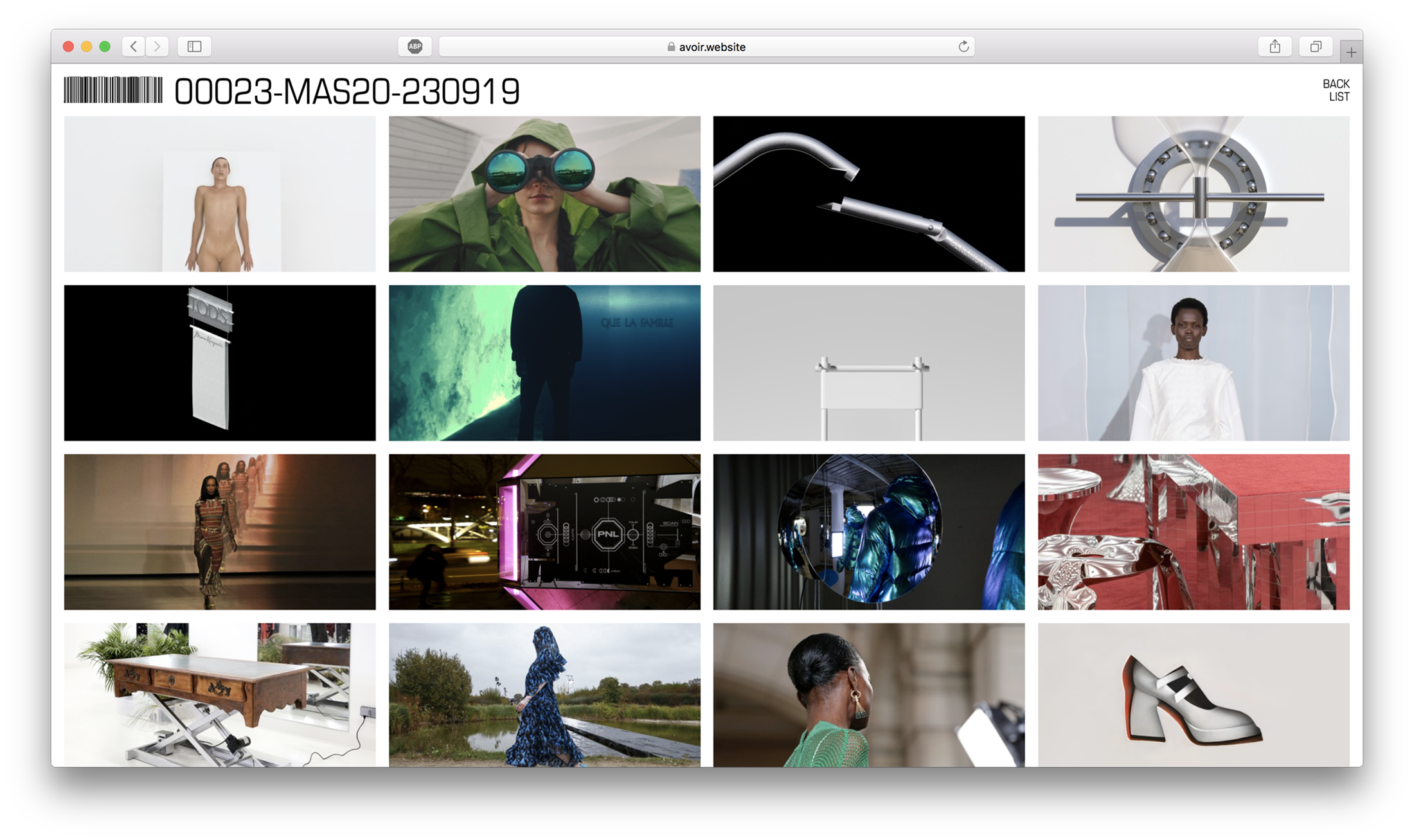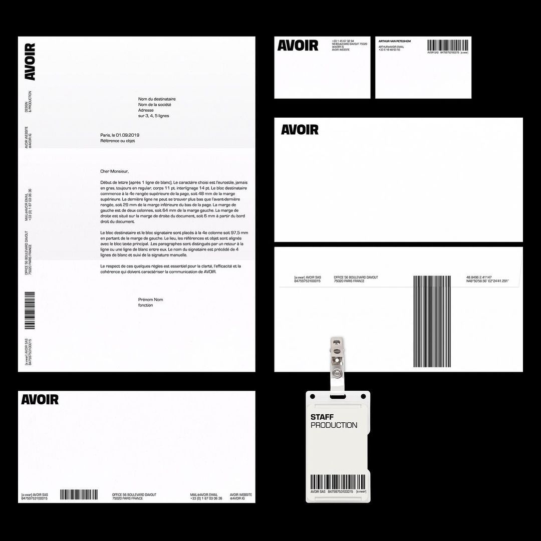 Based on this assertion, the identity for Avoir conceived by Jules Banide together with Tristan Bagot invests the potential of barcodes as ultimate logotype: hyper-identifiable, always identical yet at the same time always different, and of course, applied to whatever may be considered as a product, and thus, whatever can be possessed. That’s why Avoir as an agency has its own barcode. And for each of their works a new barcode is generated in real-time, adding up to the database of works. This leads to an indexical approach of their website, where hovering over an item immediately displays the reference and barcode associated with each project. The identity is supported by a radical typographic treatment: Media Sans Black from Production Type is used only for the logotype, in order to differentiate the office from their productions. The core typography uses Eurostile in caps only and mostly in a small size, in reference to technical leaflets and catalogue aesthetics. While Eurostile takes us to a world of lists and properties, Media Sans brings more sensibility to the bold caps. It seems to take up the aspect of avoir related to how we experience the world: the slight calligraphic touch that we find in the typeface’s contrasts – similar to Excoffon’s Antique Olive – remind us of the human gaze behind all production.