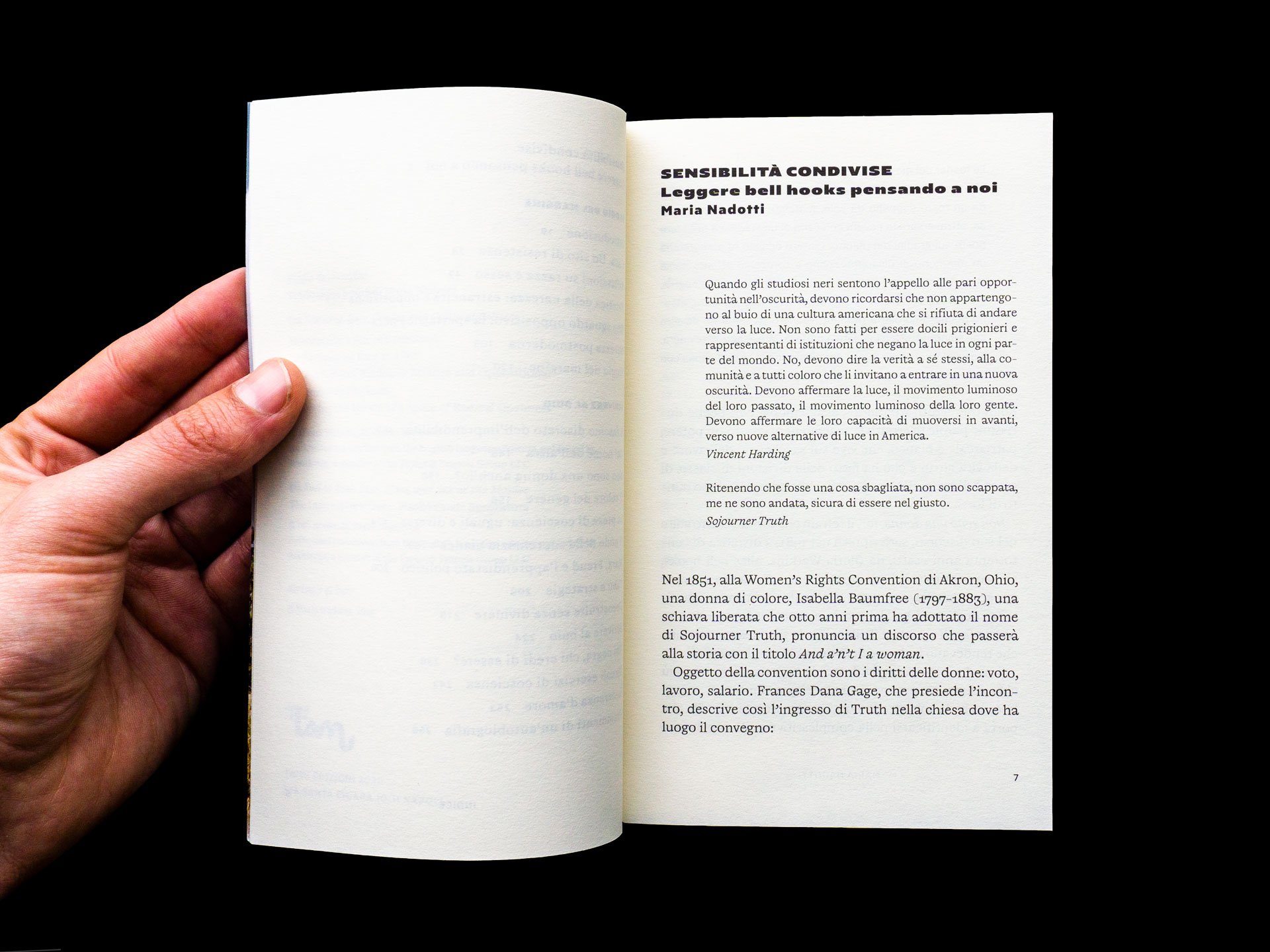 In “Scrivere al buio”, a critical and at the same time intimate dialogue with Maria Nadotti, the key themes of the thought of bell hooks, including the contestation of that white feminism that by representing women as a single “caste” denies the differences between women themselves, are tested on ordinary topics: family and couple relationships, education, the use of money, the practice of writing. Feminist thought arises from the personal experience of oppression and must therefore speak to women of less well-off status, not close in a language for the few that allows the maintenance of the status quo.