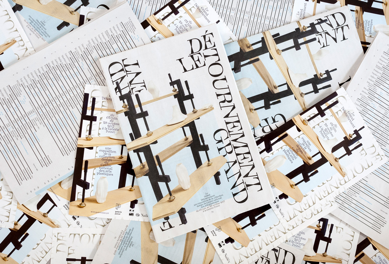Exhibition catalog for Le grand détournement (“The great diversion”), an exhibition by the Centre national des arts plastiques (Cnap) held at Galerie Poirel, Nancy, France. The exhibition was curated by Juliette Pollet and David de Moutis. The catalog was printed on 52g/m² newsprint in an edition of 8,000 copies.