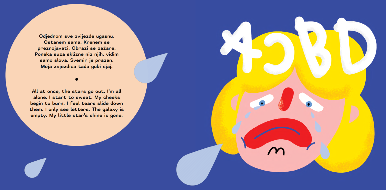 Zvijezda koja čita / The Reading Star is the second picture book in our series. It explores the challenges of struggling readers in a classroom environment. Like the first publication, the story was written by Ula Reić. The colourful illustrations are made by Rina Barbarić.