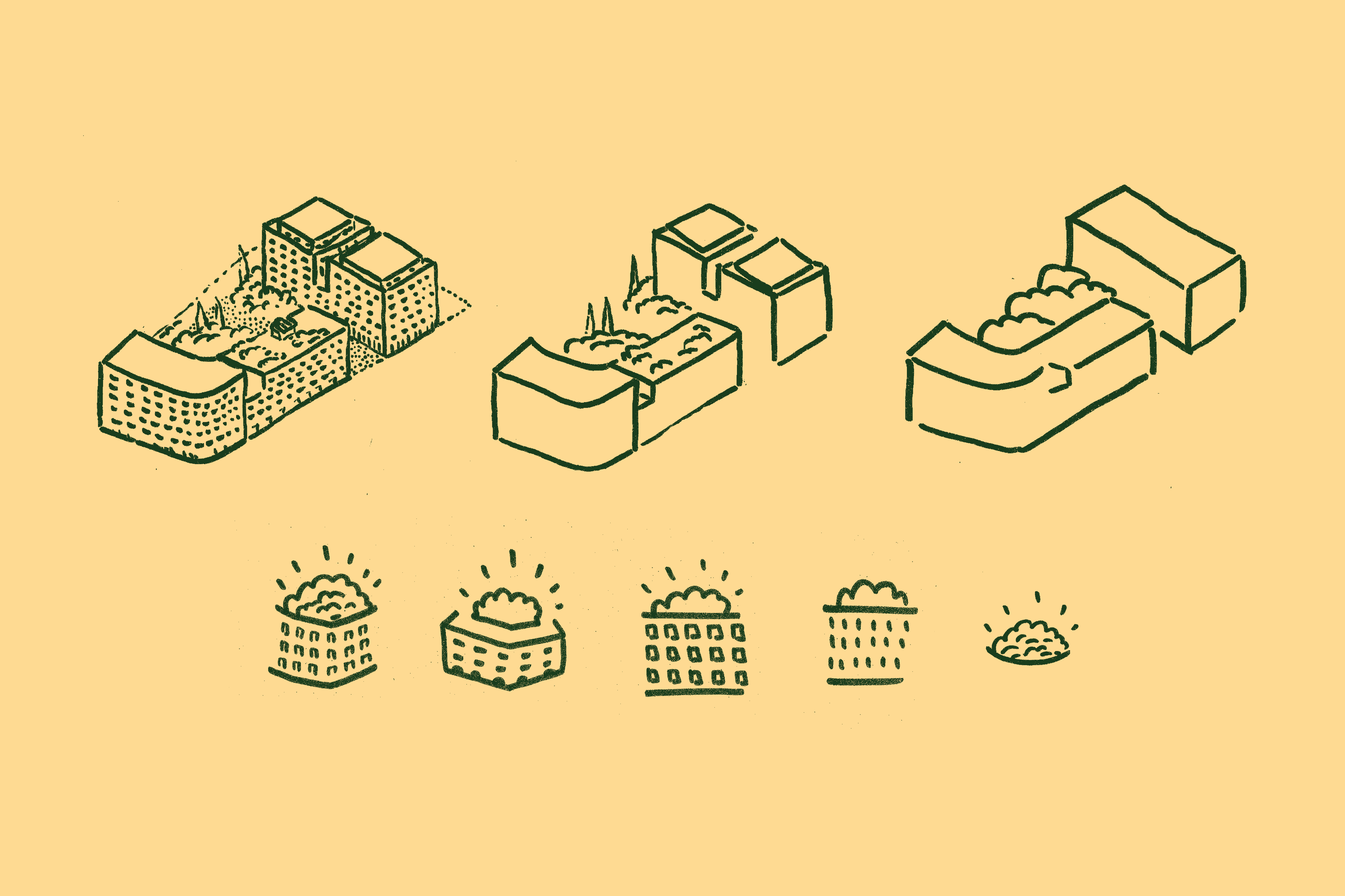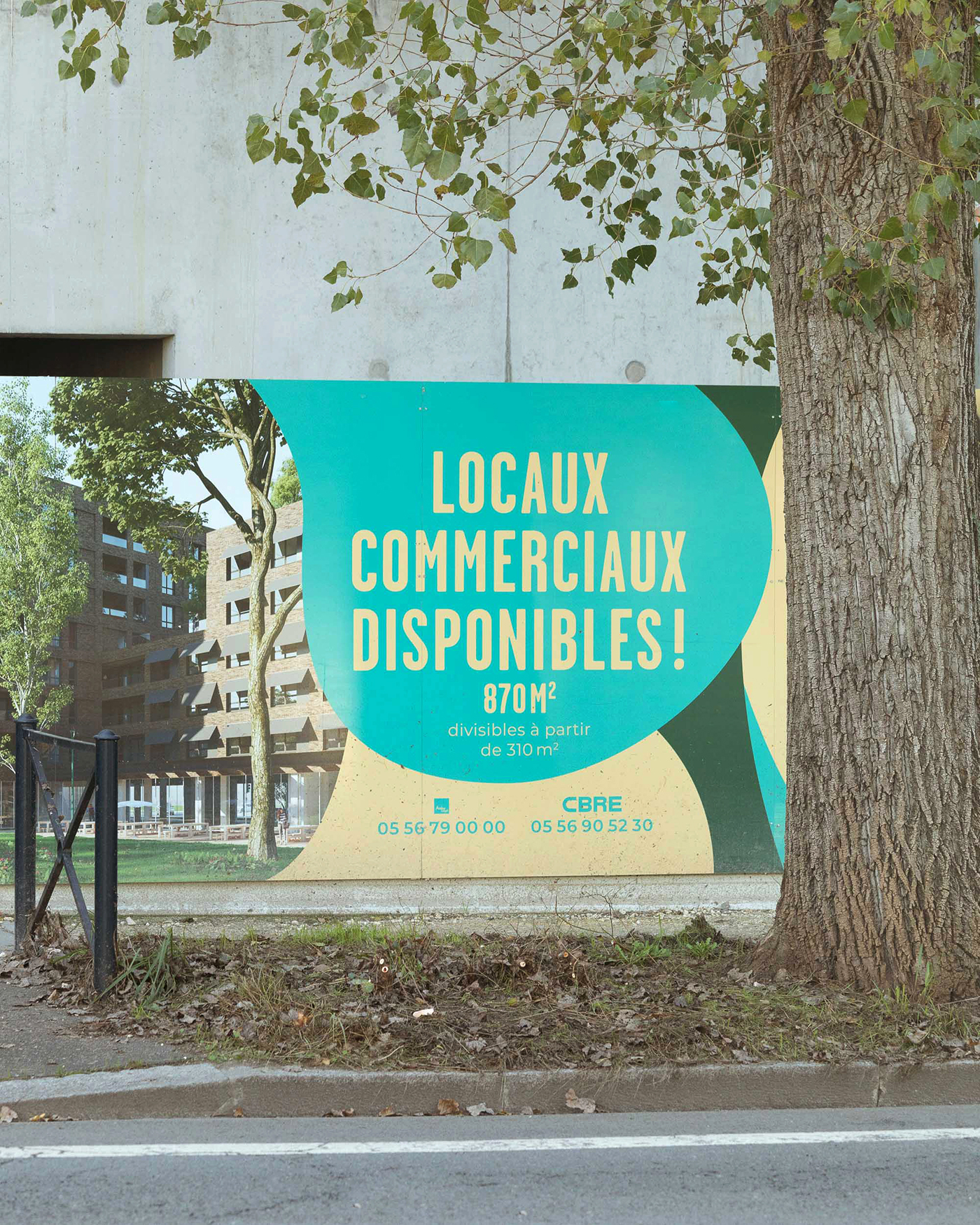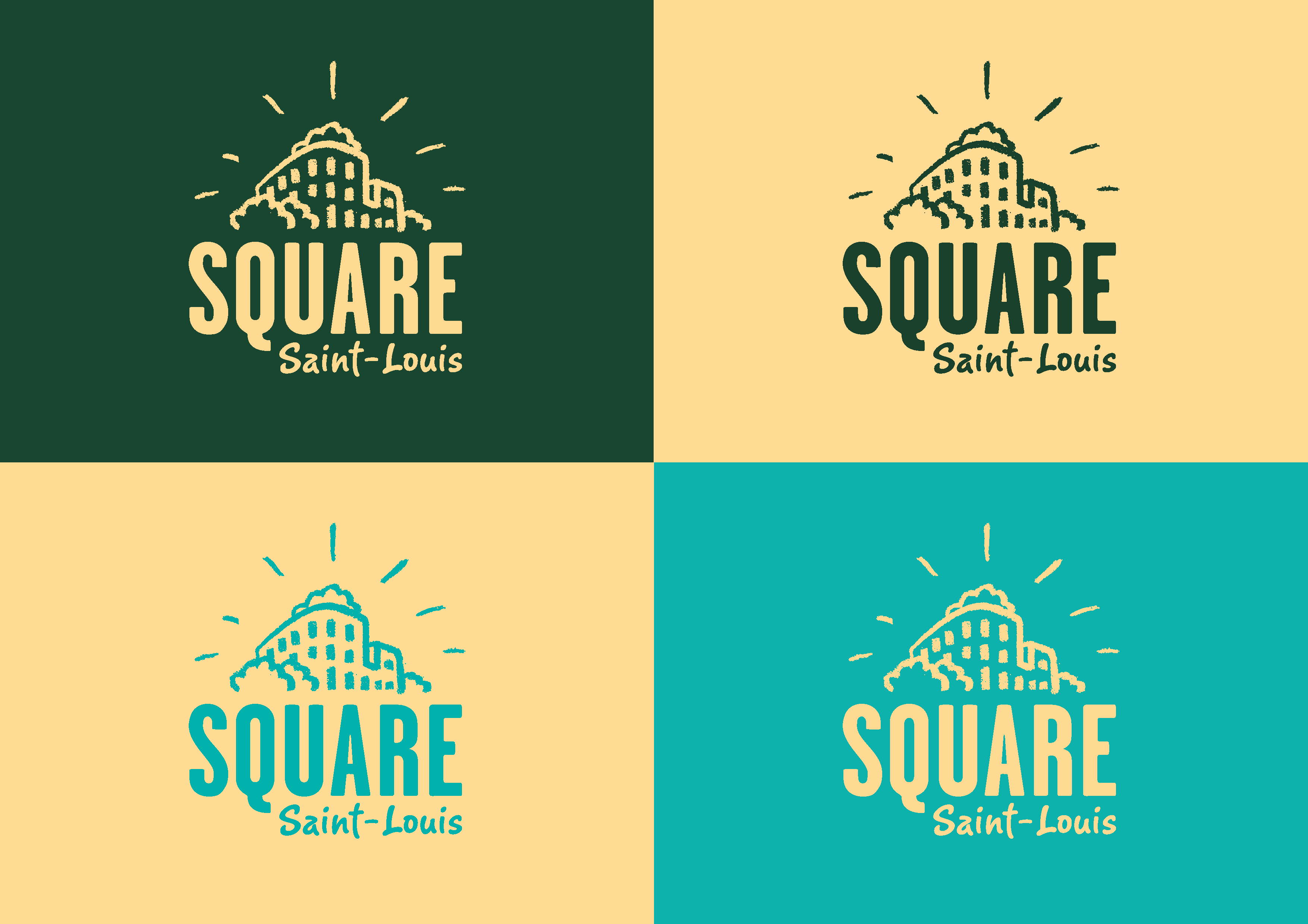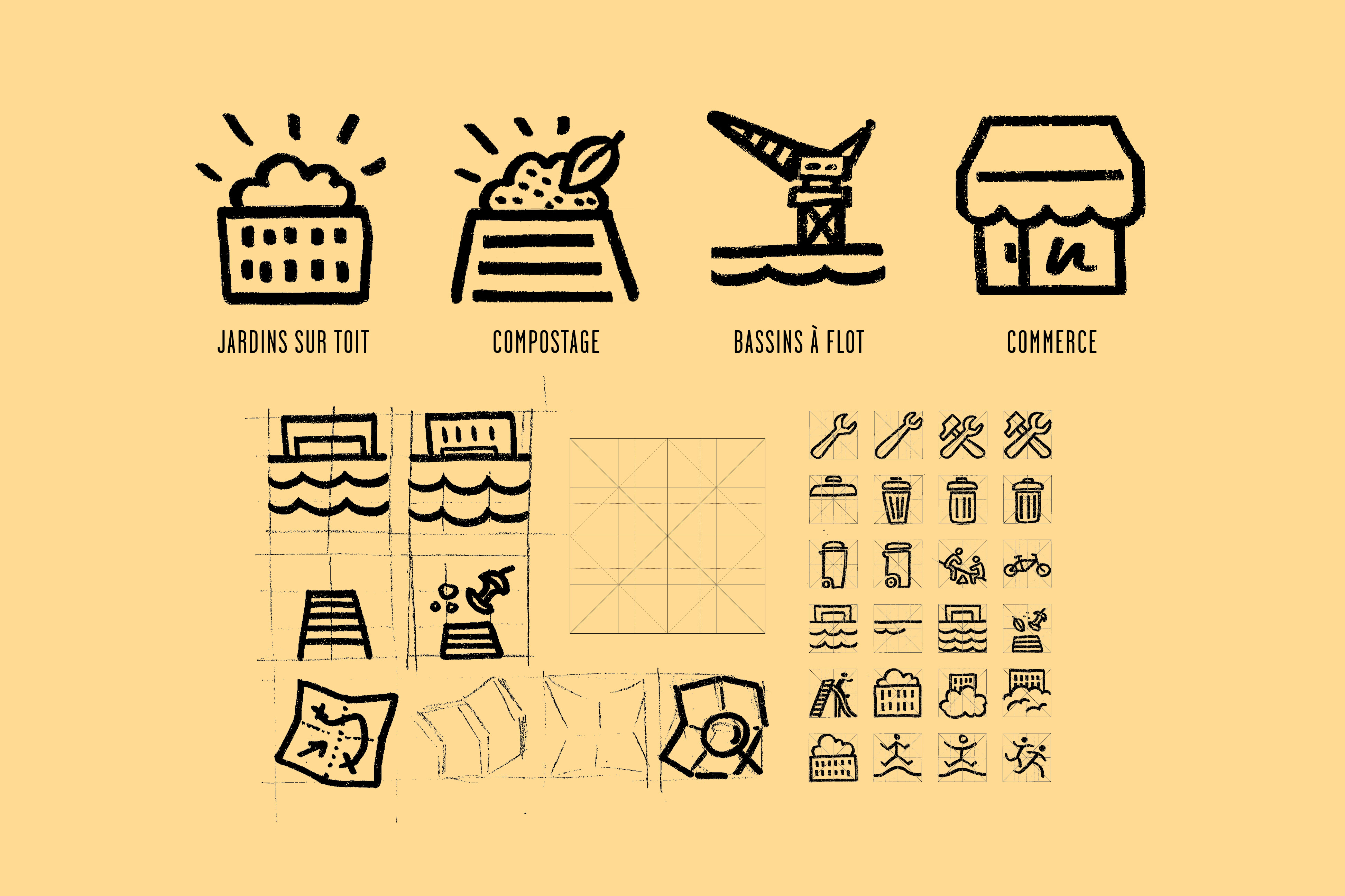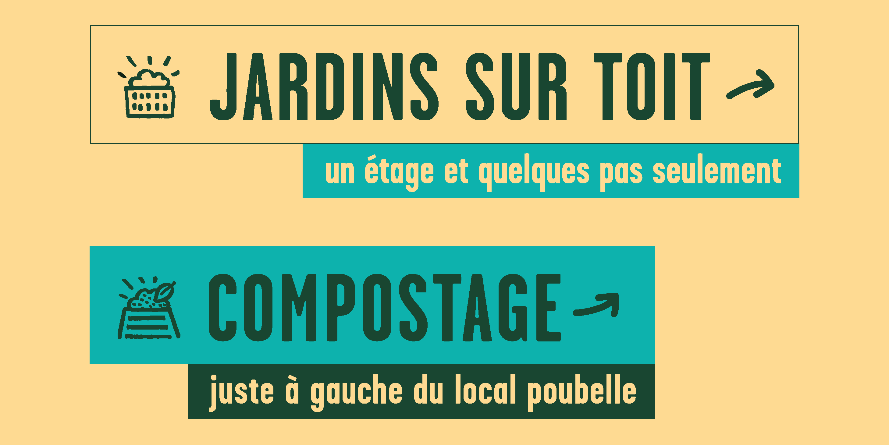 To represent this energy and the block’s park, we worked on a warm and dynamic identity, close to inhabitants. The logo represents this idea of conviviality around a green and open block heart. It also reassures about the possibility to live together and about the global animation of this new residence. Little by little, we have symbolized the main ideas and played on the recognizable elements of the building like this round angle and the trees jutting out above the buildings. Once this graphical foundation established, I played with several declinations like hoardings or a series of pictograms useful for future signs.