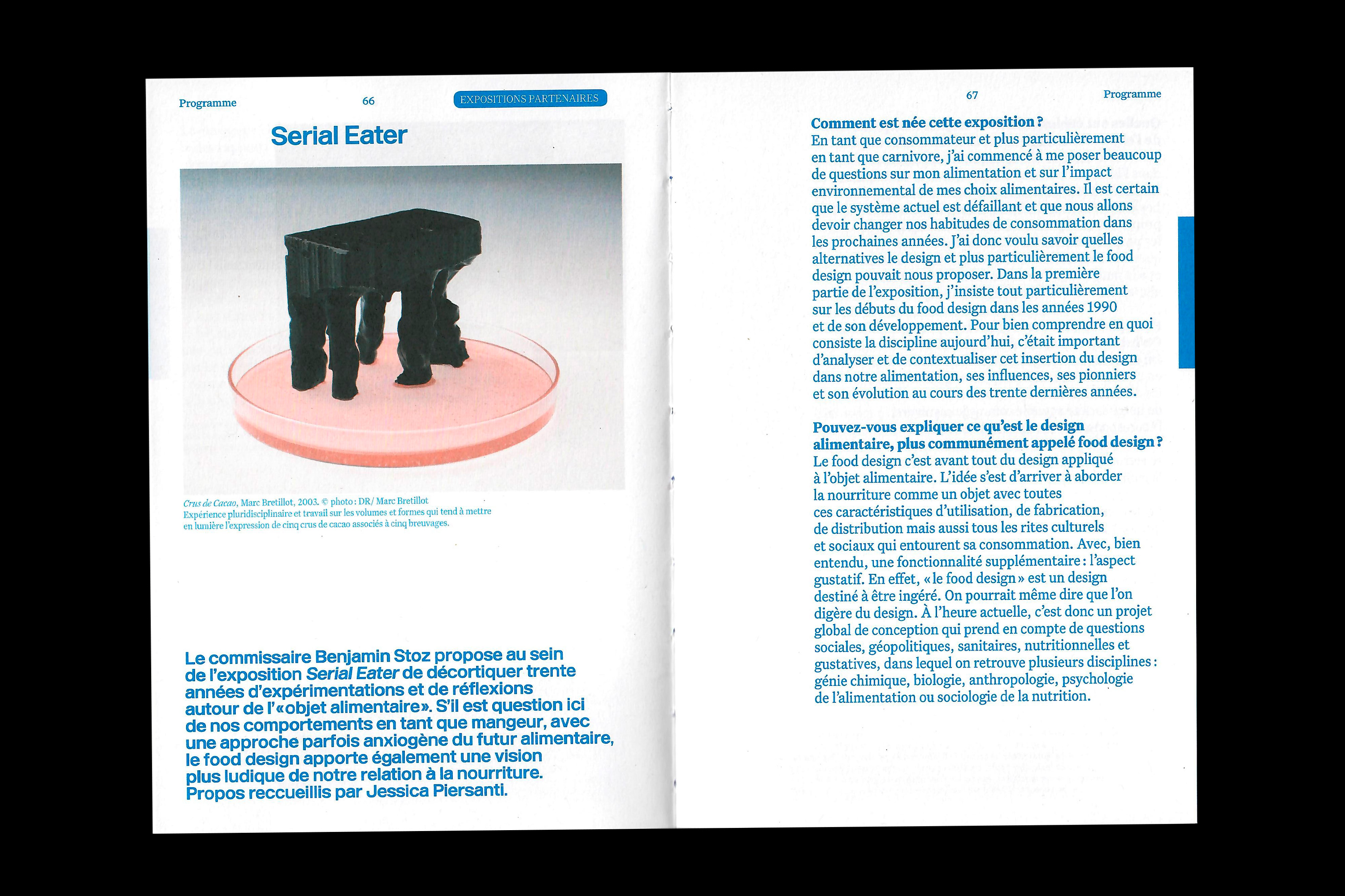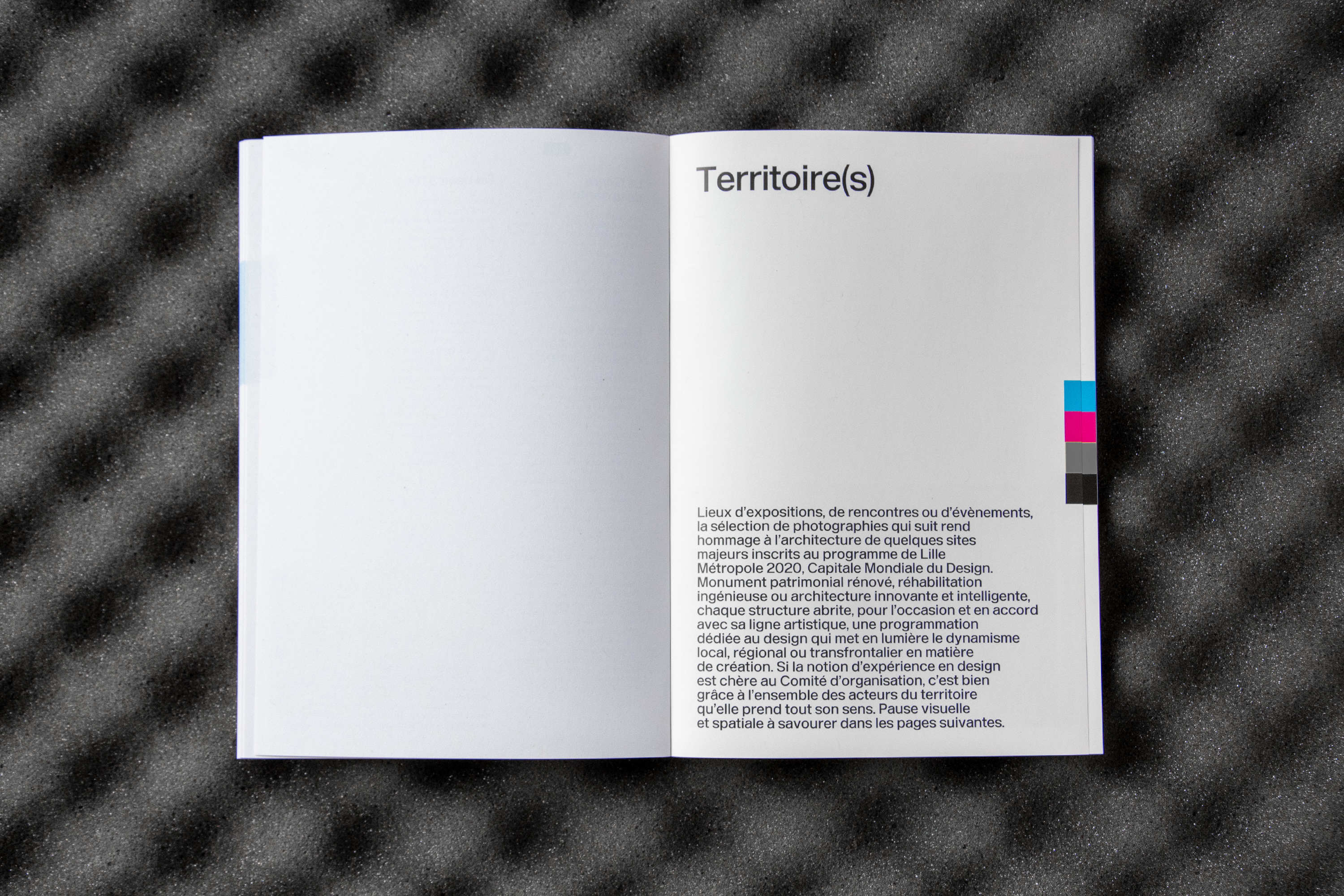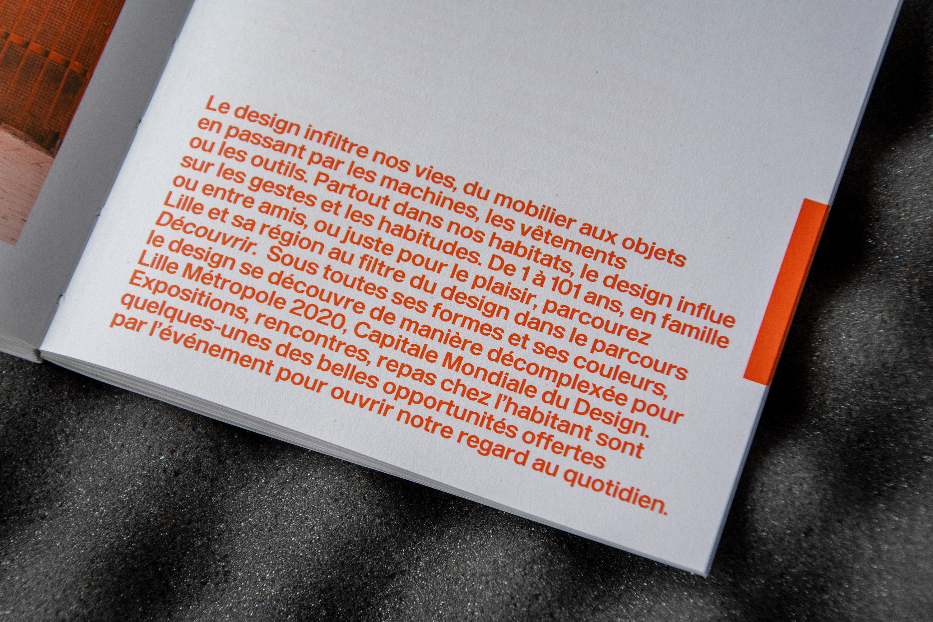 The catalog Design is capital is a restitution of these actions as much as an exploration of Lille’s background as a city rooted in design issues. The graphic designers of Large worked on an object that would show the simplicity and evidence of a well-designed object, something that doesn’t have to be deciphered to be understood immediately. The use of blue, white and red is a reference to the French flag, anchoring the city of Lille in a national territory. At the same time it’s a deliberate return to primary colors that are at the basis of the color spectrum. This association offers great legibility and is used in the book as indicator for the different sections, made visible directly on the fore-edge.