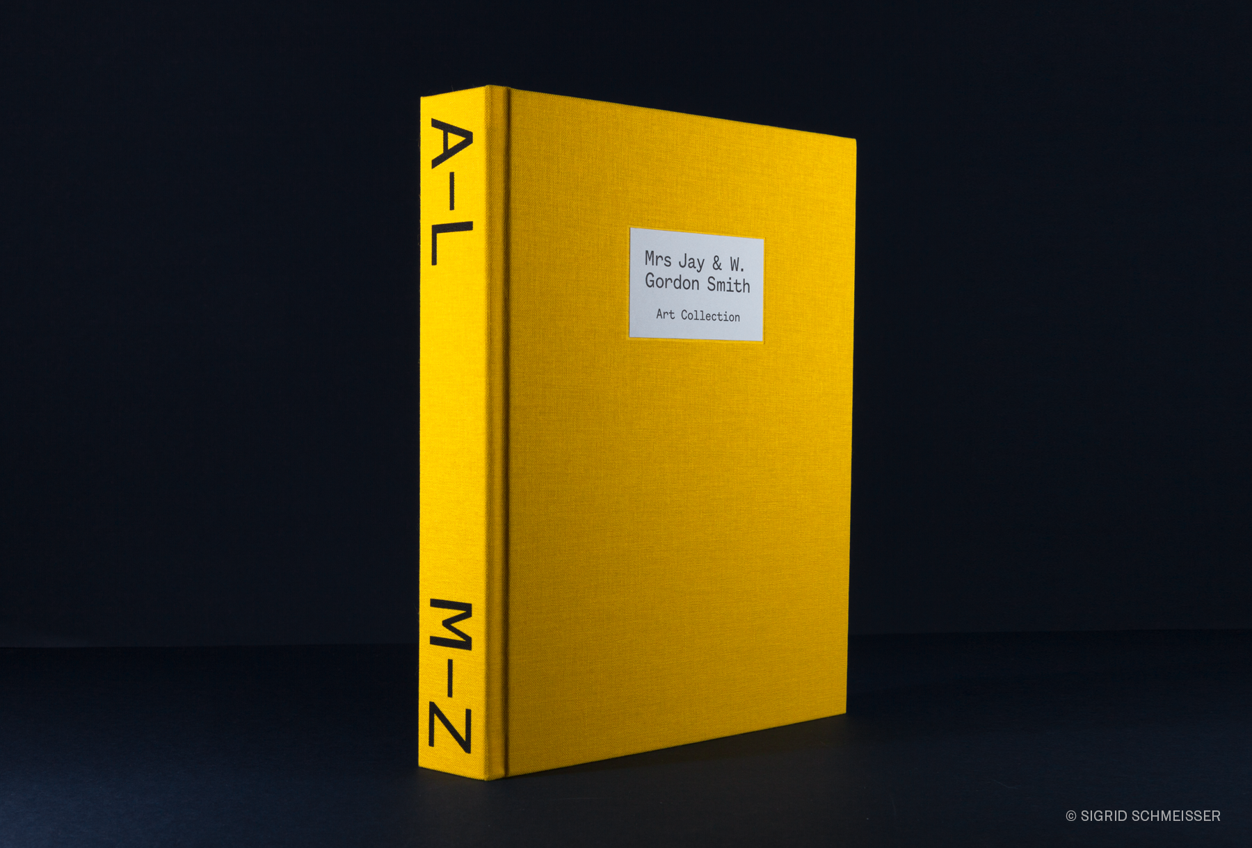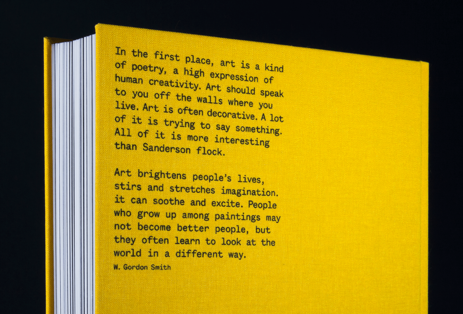 The luxurious yellow Brillianta bookcloth cover is label-embossed and has been screen-printed on the spine and back. Further, the back cover features an excerpt from W. Gordon Smith’s piece on “why one should collect art”.