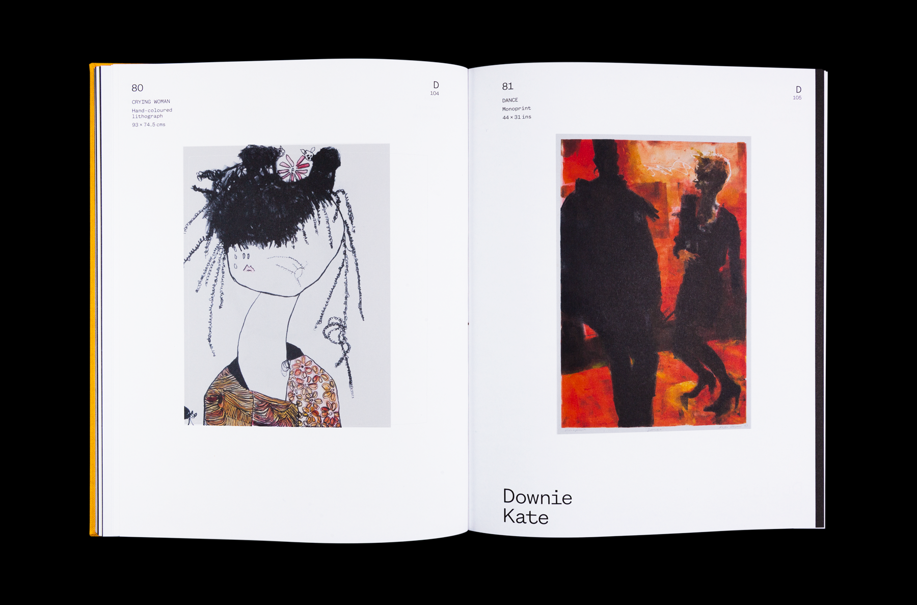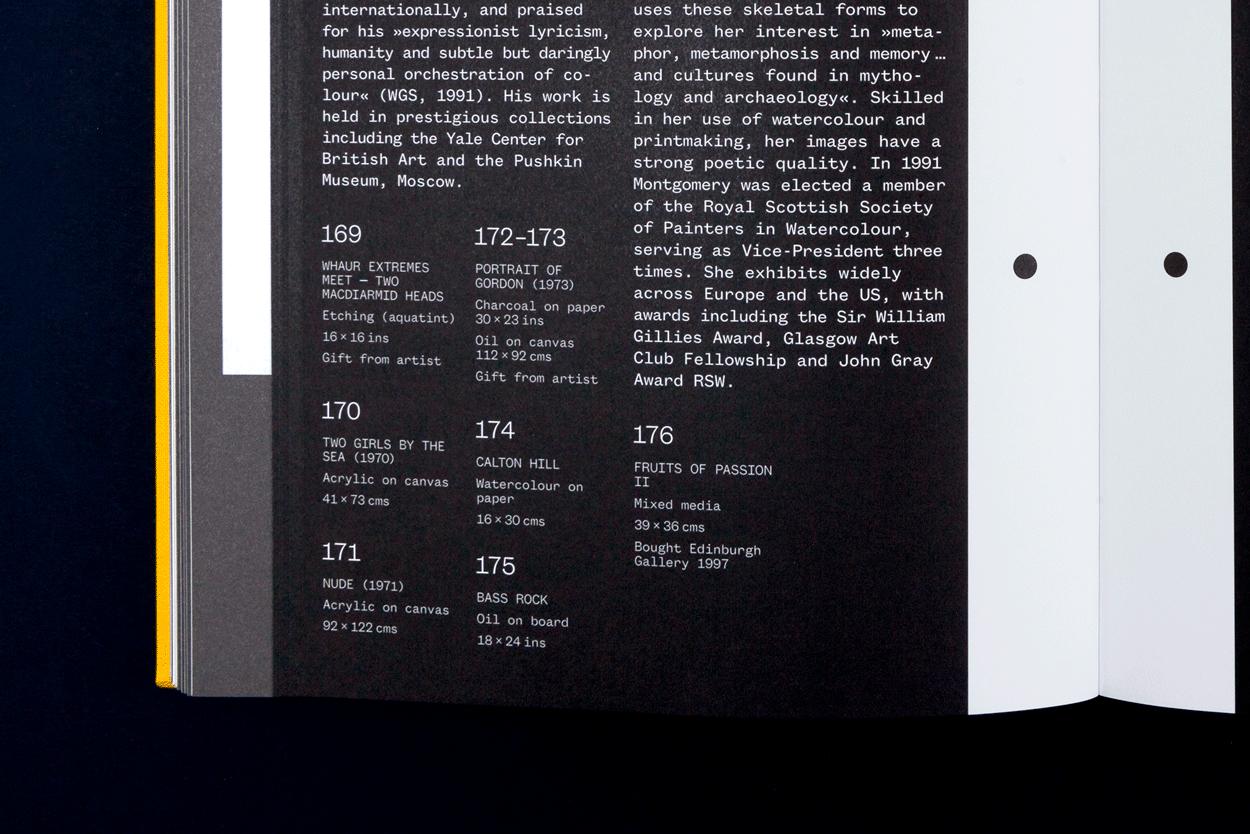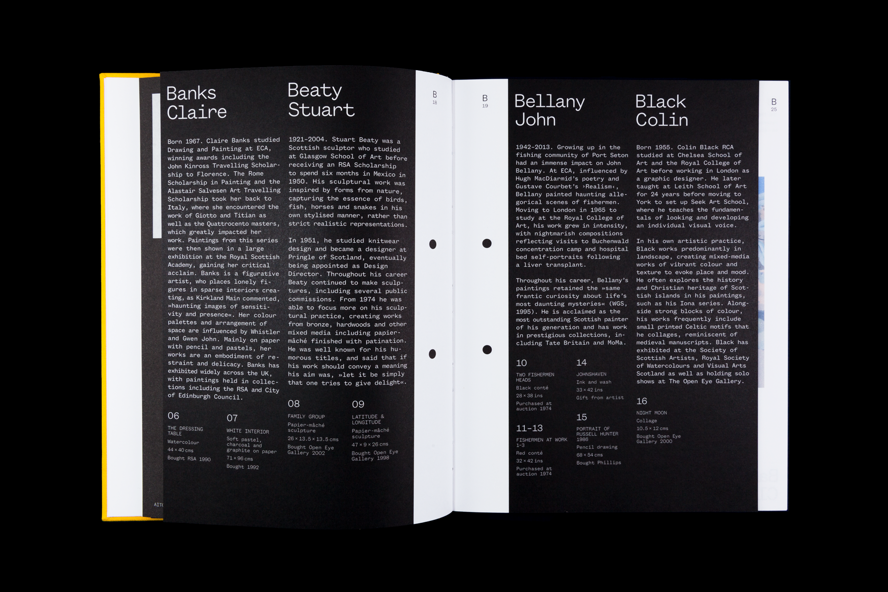 Mimicking an art reference book, the catalogue features index-cutting, special yellow paper for the table of contents and high-quality Lessebo Design paper for the biographies and artwork pages. Inspired by W. Gordon Smith’s typewritten exhibition reviews, the typeface family Founders Grotesk Mono has been applied in a carefully maintained typographic hierarchy throughout the book to convey the genuine look and feel of a reference book with a modern twist. Great care has been taken in the lithography process to accurately reproduce the eclectic artwork collection spanning a great variety of media.