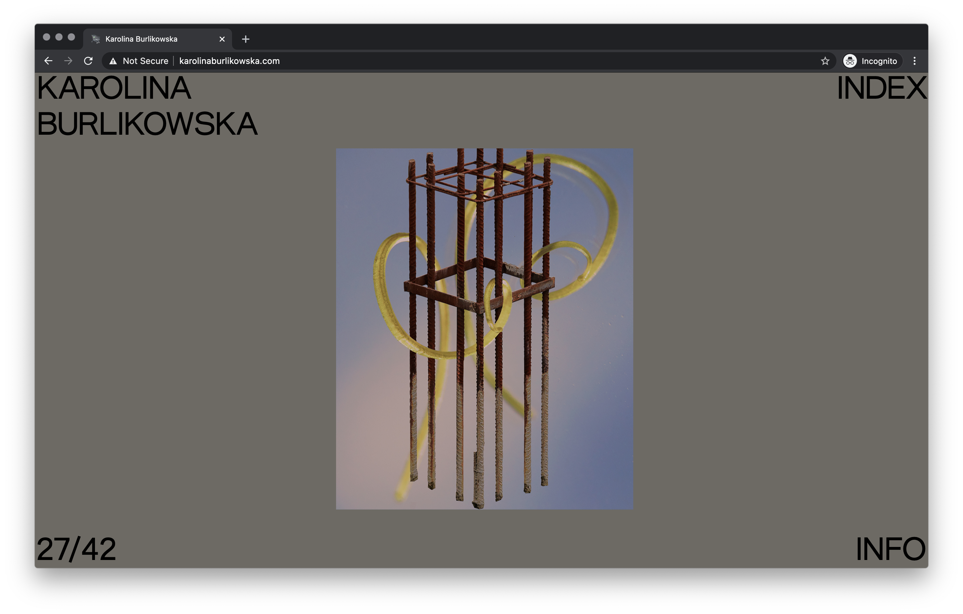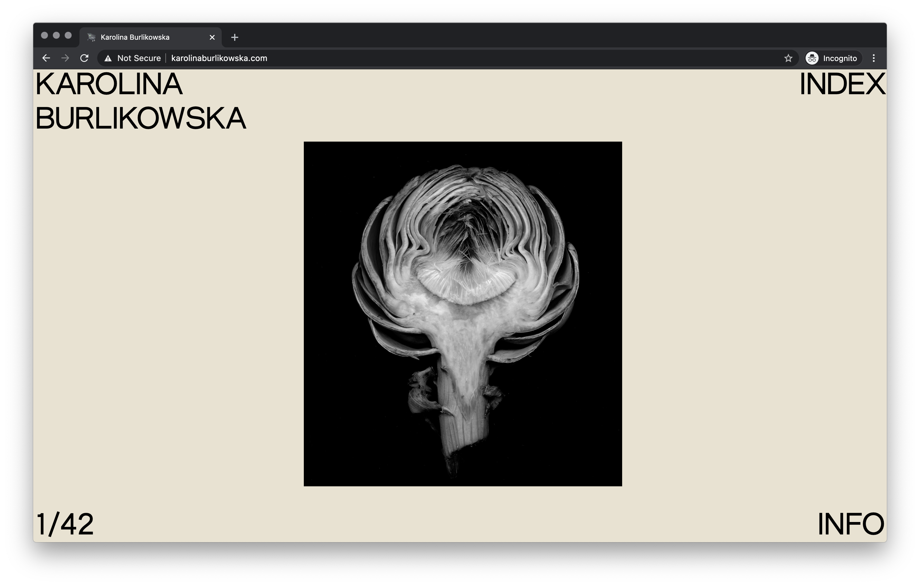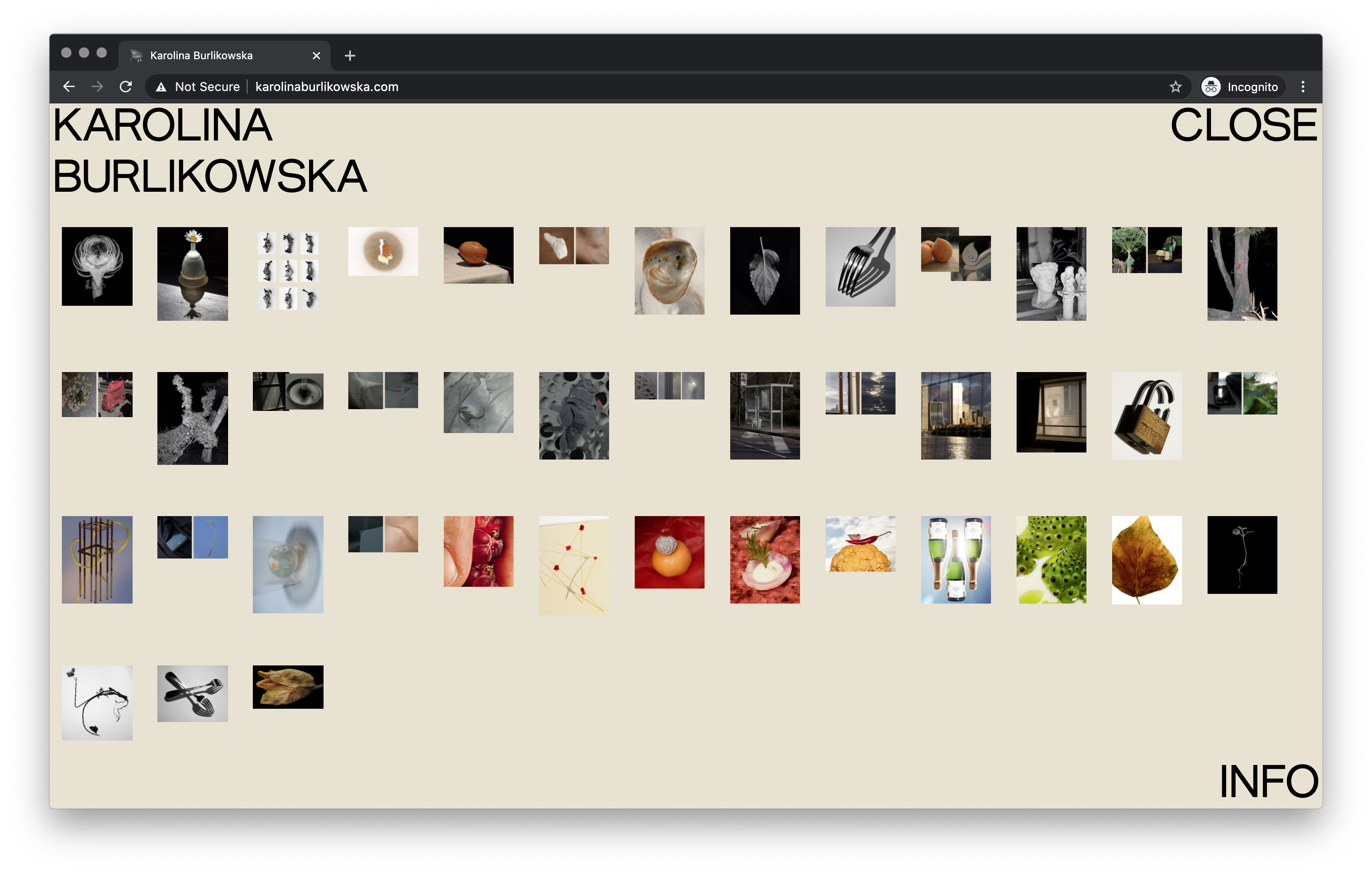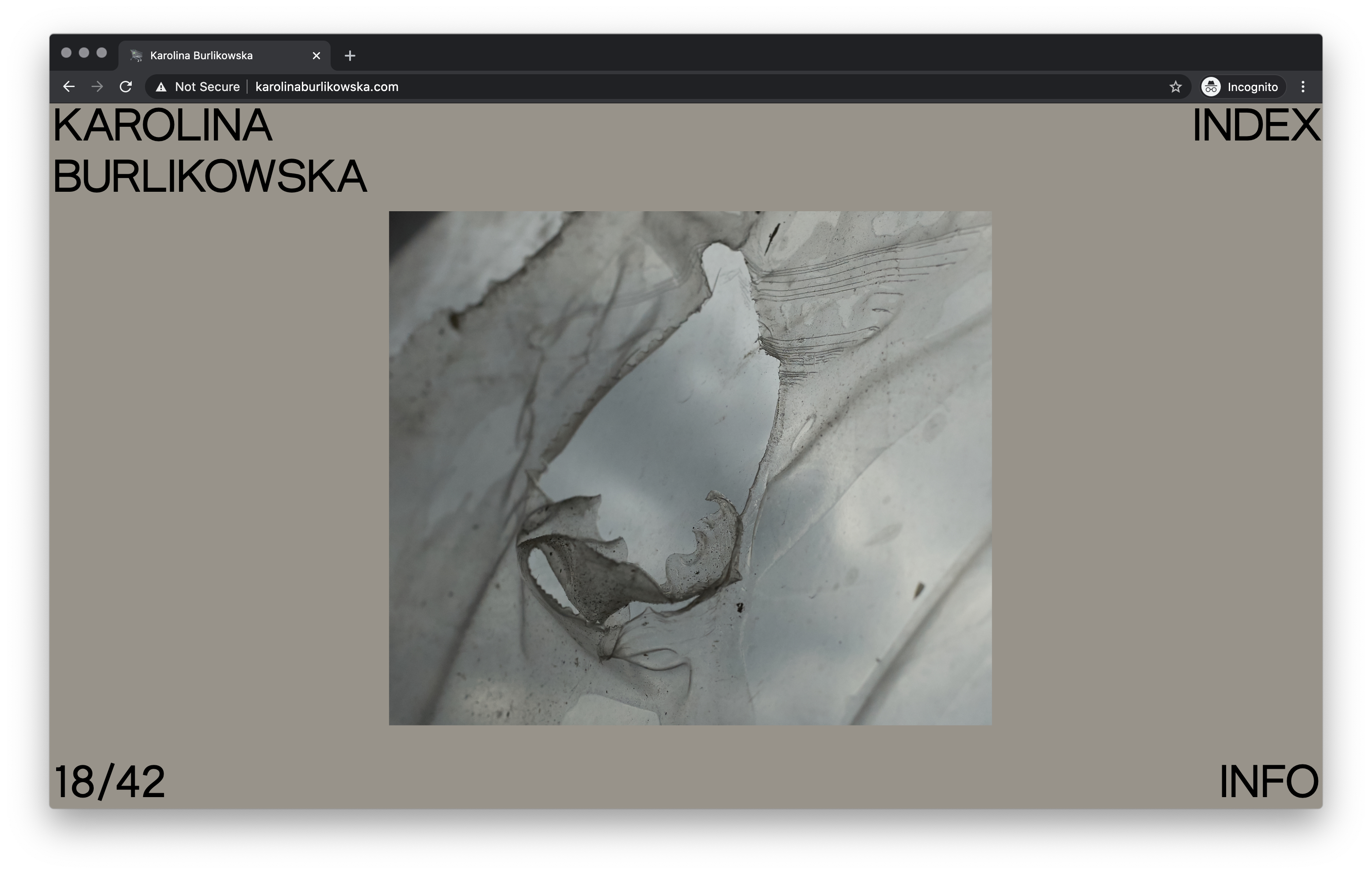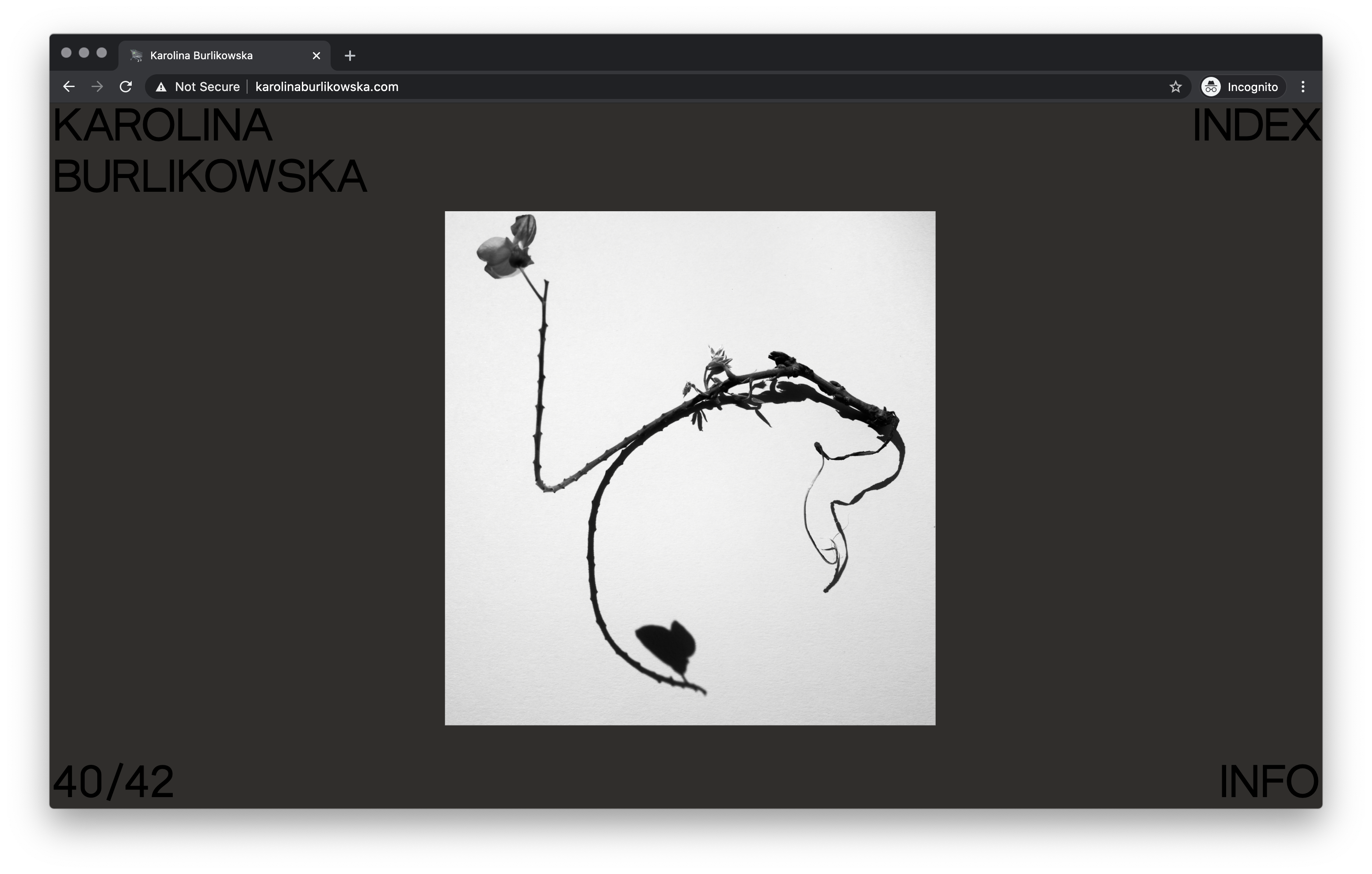 Website for London-based photographer Karolina Burlikowska. Karolina requested a very simple one-page structure and no scrolling, so we decided to create an infinite gallery with an index navigation page and minimal text. Following the idea of simple but with character, we decided to associate a gradient background getting deeper and darker while progressing in the selection.