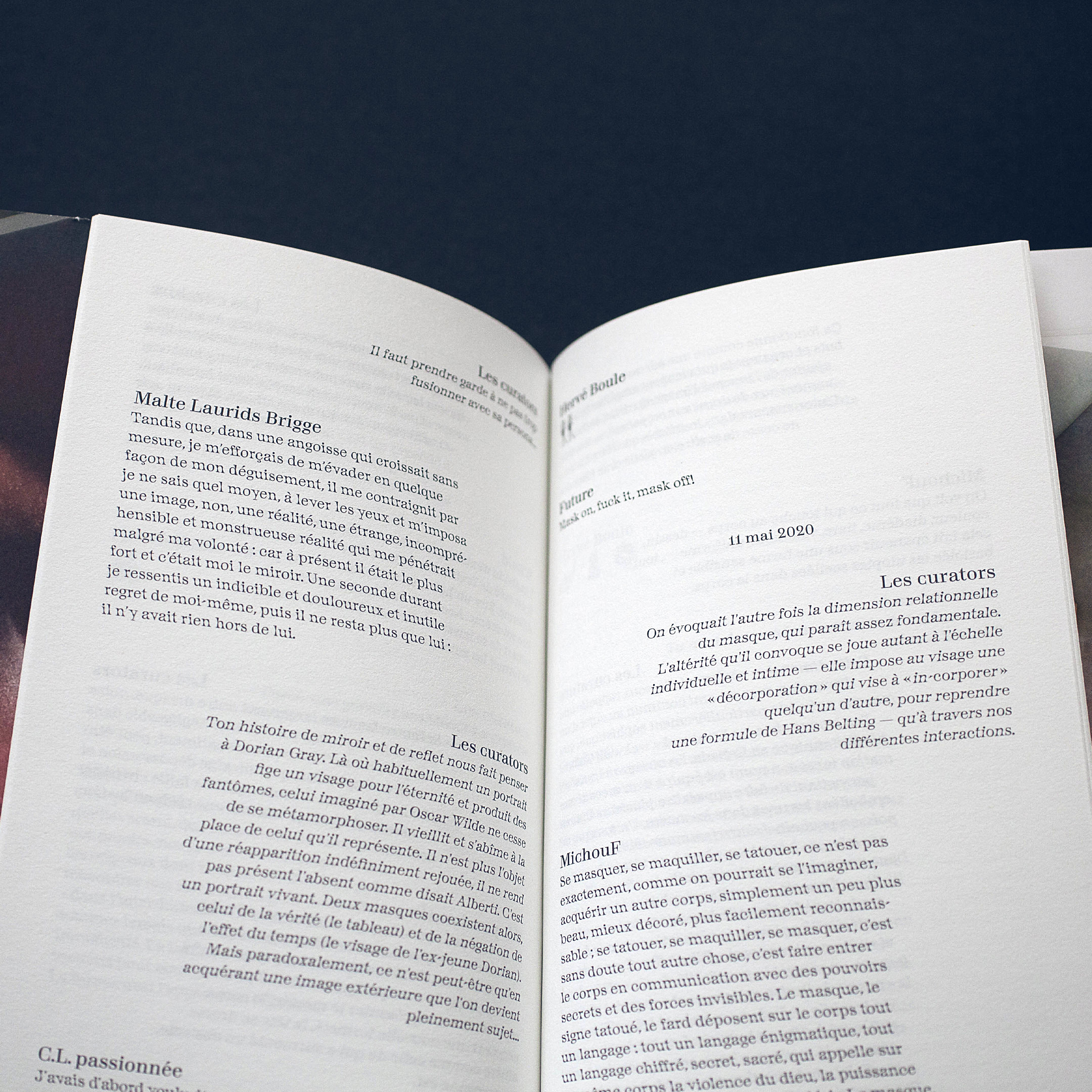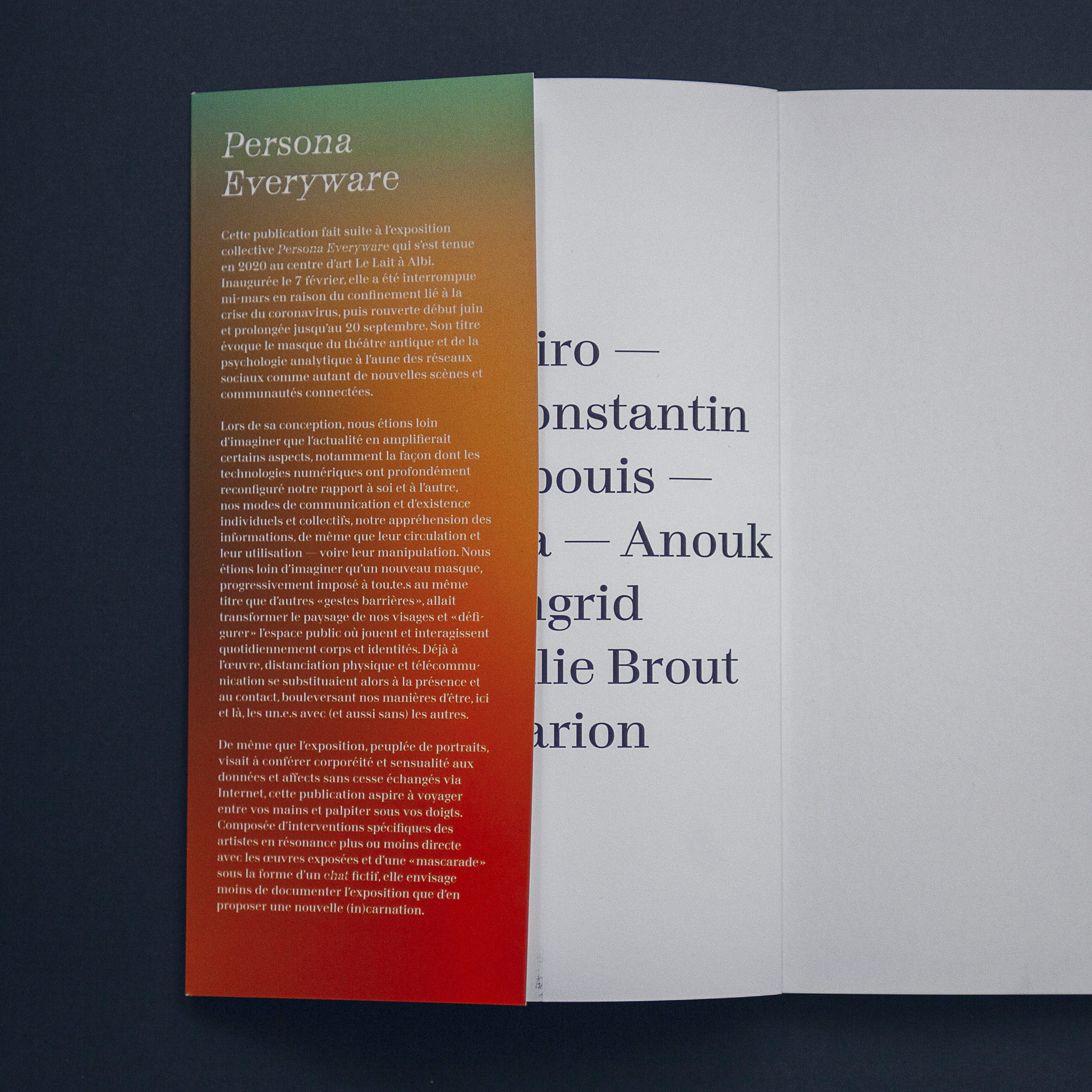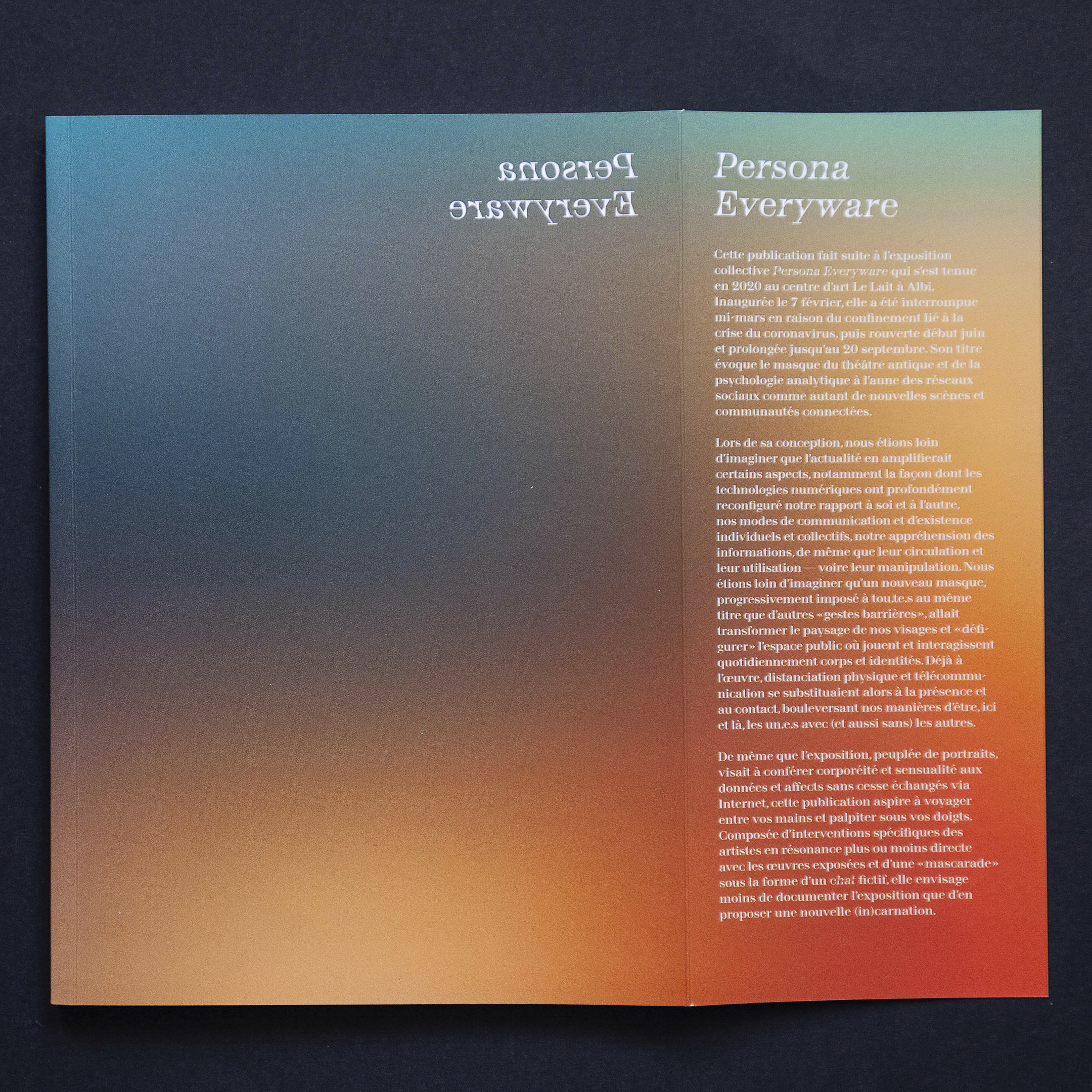 This publication follows the group show Persona Everyware, which was held in 2020 at Le Lait art centre in Albi. It opened on 7 February, but was closed in mid-March because of the lockdown associated with the corona virus crisis. It then re-opened from early June to 20 September. Its title conjures by the mask in ancient theatre and analytical psychology based on the social networks, as many new connected scenes and communities.
