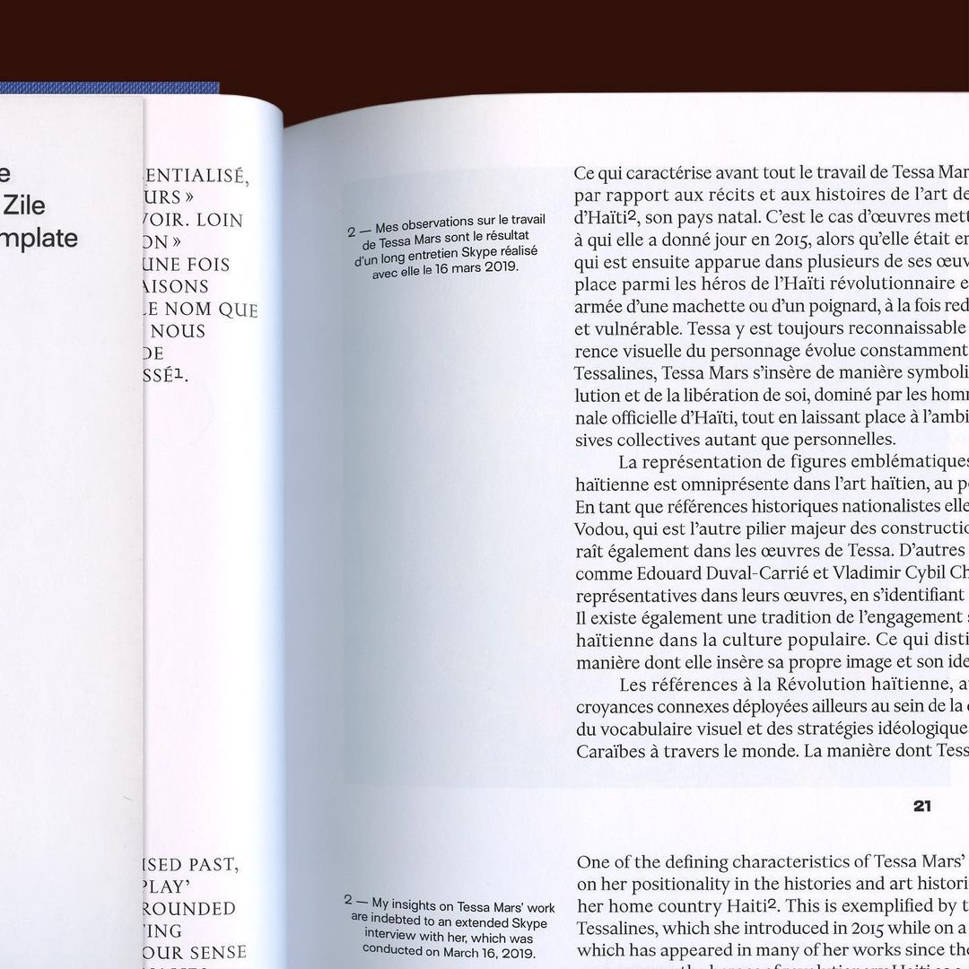 Tessa Mars is a Haitian contemporary visual artist, born in 1985 in Port-au-Prince. Her work focuses on Caribbean identity, how this region’s history was shaped by violence, and questions the status of women and their bodies in this legacy. Île Modèle, Manman Zile, Island Template is the catalog of her exhibition presented at Le Centre d’Art in Port-au-Prince from May 31 to June 29, 2019.