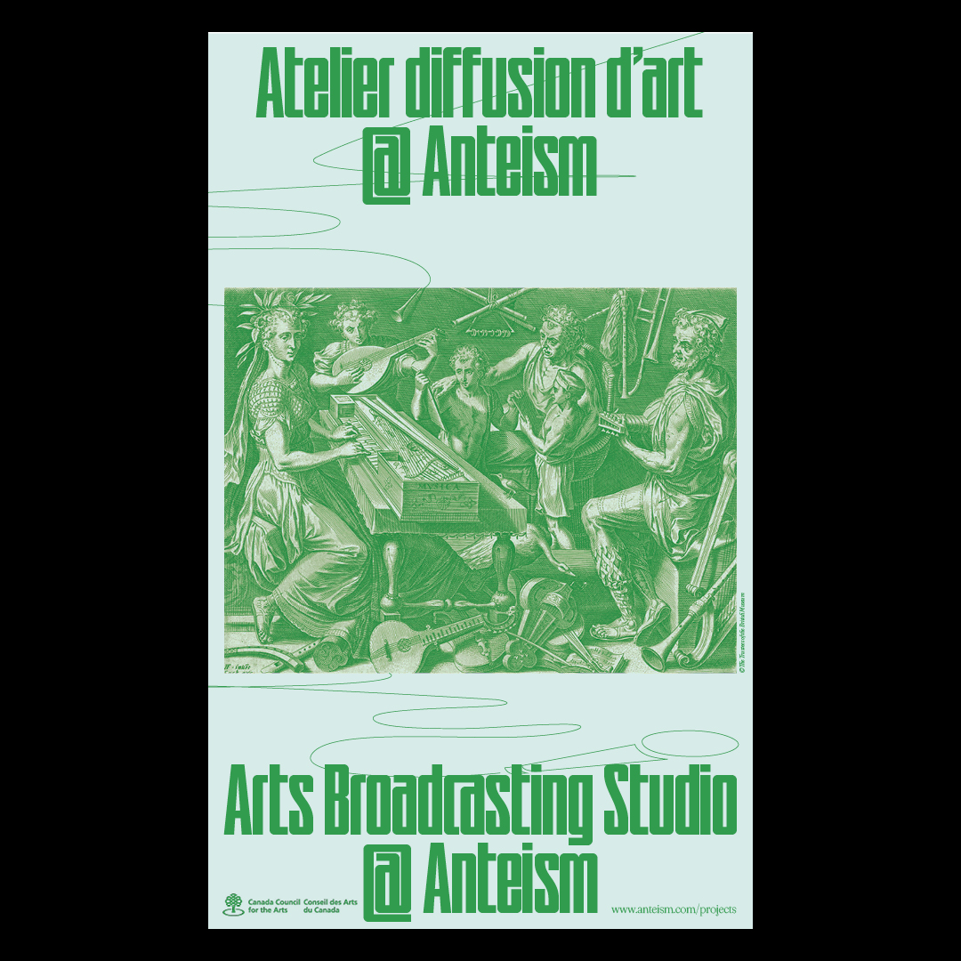 Visual identity for the Arts Broadcasting Studio at Anteism, a Montreal-based gallery and publishing house. Intended for local artists, the initiative of the project consists of offering the space and providing equipment for broadcasting performances, podcasts, concerts, etc. The clean line drawings are contrasting with the texture of the engraving from the British Museum, and brings a contemporary touch to the visual. This nuance is amplified by the choice of the typefaces: WT Skrappa, a strong and straight lineal, and Fraunces, a fluid, curved and thin serif.