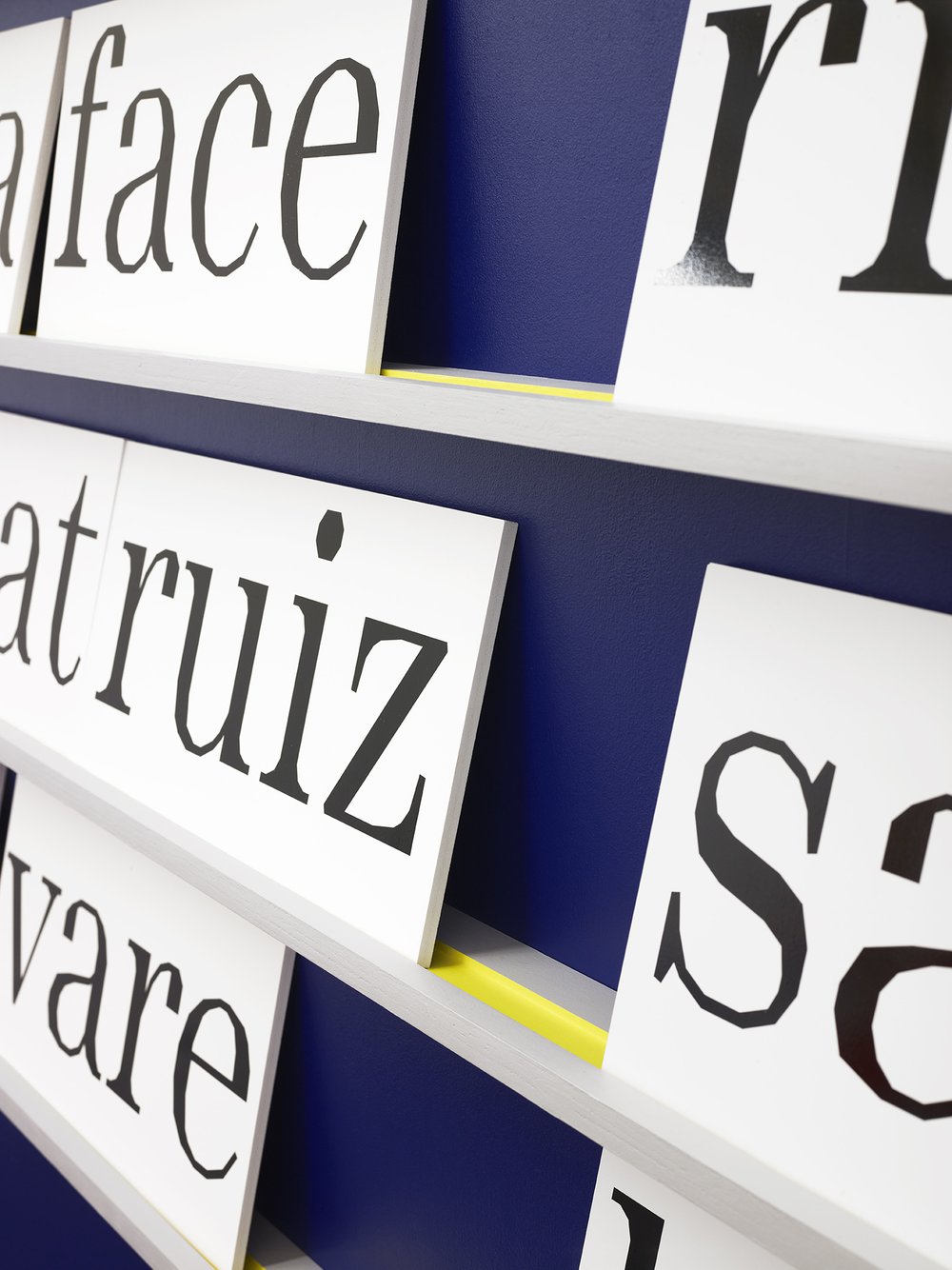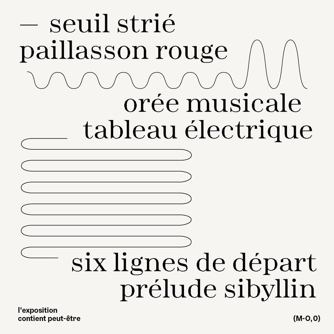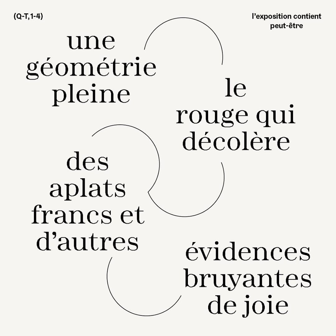 Sophie Cure is a graphic designer who likes to play with words: her whole practice is a questioning of the evidence of reading and semantics, as the title of the exhibition – which can be translated as “the semantic fields” – shows. To set the multiple words that surround her practice and that she plays with, Sophie Cure chose Minotaur from Production Type and Gräbenbach from Camelot Type. In Julien Van Anholt’s lexical shots, Minotaur’s wide eye encourages the reader to pay a closer attention to the word and its presence in space: each letter looks stressed by the fragmentation of its contour, and Sophie Cure uses this characteristic as a means to make letters and words visible not only as language but also as forms. The association with vectorial lines linking in different ways the words dispersed in the square format brings us back to some aspects of visual and concrete poetry, where the visuality of the poem is indissociable from its content. The semantic play at work within the exhibition, as can be seen on the few mysterious pictures that were taken of the inside, is here experienced through the attention given to letters and their spatiality.