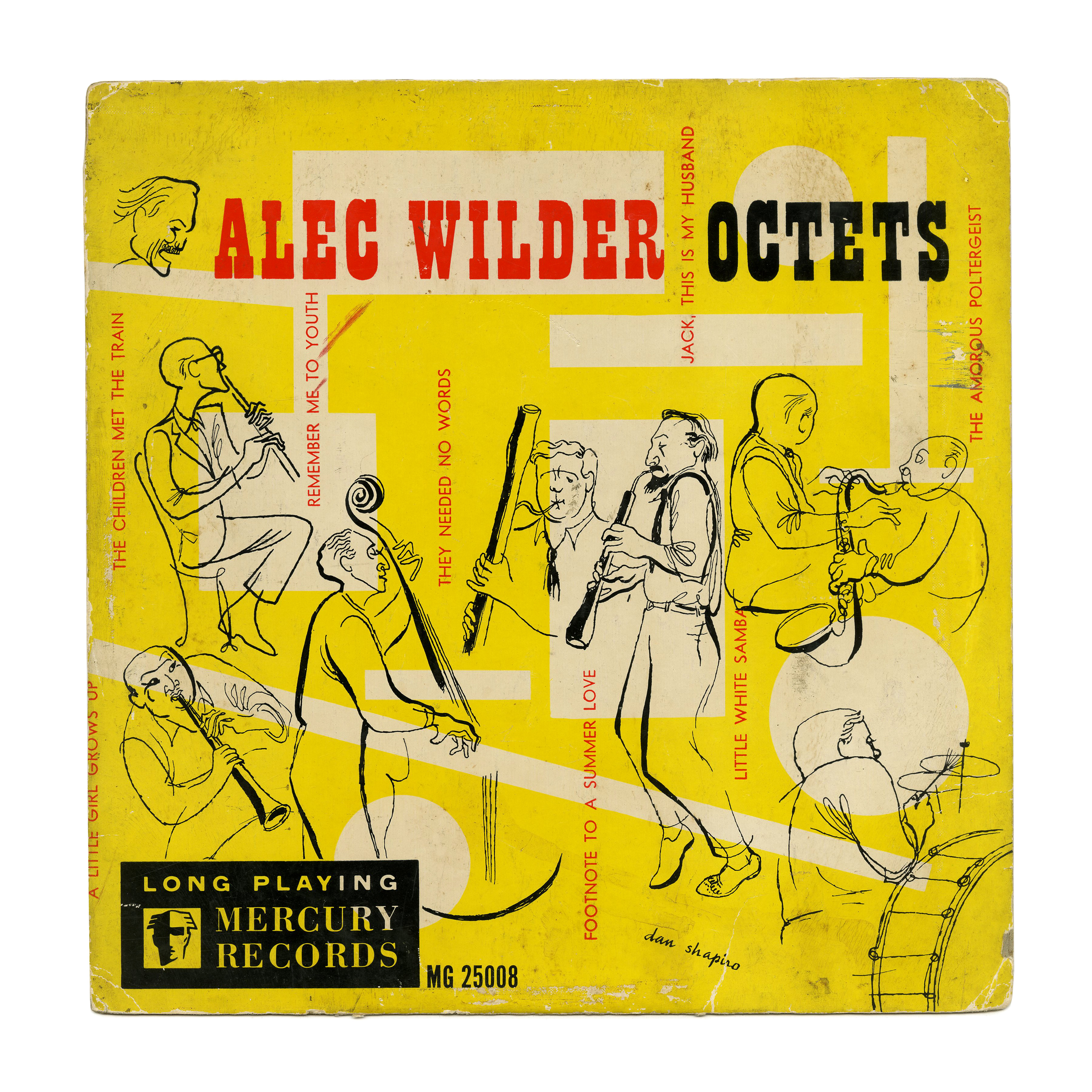 Self-titled album with avant-garde jazz by the Alec Wilder Octet, which in addition to composer Alec Wilder included his Eastman classmate Mitch Miller on oboe. It was released on Mercury Records in 1949, with cover illustration by Dan Shapiro. The track names are shown in rotated lines set in red Vogue caps. The album title uses Playbill.