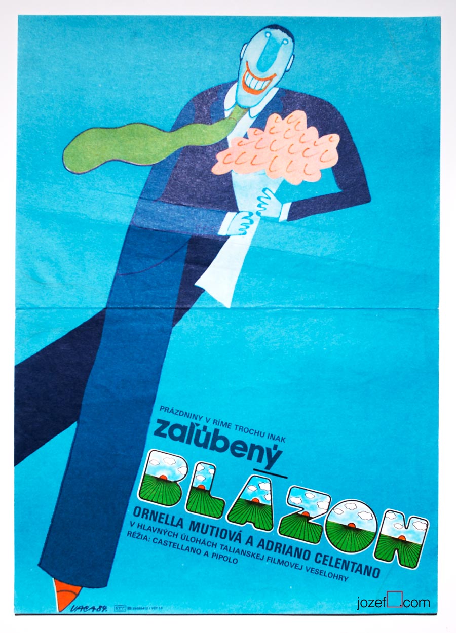 The poster design by Karel Vaca for the Czechoslovak release of Innamorato pazzo features a four-colored rendition of the ever-sanguine Astral. It’s paired with ITC Avant Garde Gothic with custom diacritics, including a vertical acute and a triangular háček. Czechoslovakia was a state with two official languages, Czech and Slovak. The poster hence was produced in two language variants.