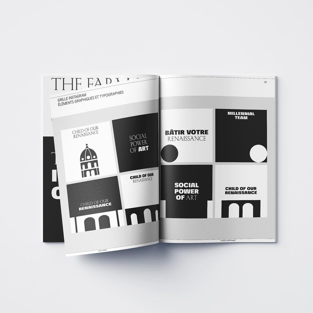 To rebrand their agency, The Farm collaborated with Label Famille, an interdisciplinary group of creators, whose diversity seduces clients for wide-range projects. Studio des formes, part of the group, was in charge of the graphic design of The Farm and expressed their work philosophy through a simple yet aggressive design principle. The whole identity relies on the polarity between black and white, a polarity that we find again in the contrast between the two fonts that were paired for this project: the elegant inscriptional Kessler from Production Type and the impactful and black Fivo Sans designed by Alex Slobzheninov. This contrasting duo illustrates the motto of the agency: “A simple digital agency for a hard culture”. While Kessler can refer to more classical aspects of culture, and mark it as a patrimonial legacy, Fivo Sans brings it back into the contemporaneity of a digital communication world where one needs to claim one’s place in order to be visible. Besides, the use of simple geometric shapes to illustrate or punctuate different quotes or information to posts on social media is also a means to evoke clarity, the one that comes with rational representation but also, with a lighting that makes all contrasts harsher. To shed light to make something visible, and at the same time also, to not hide anything.