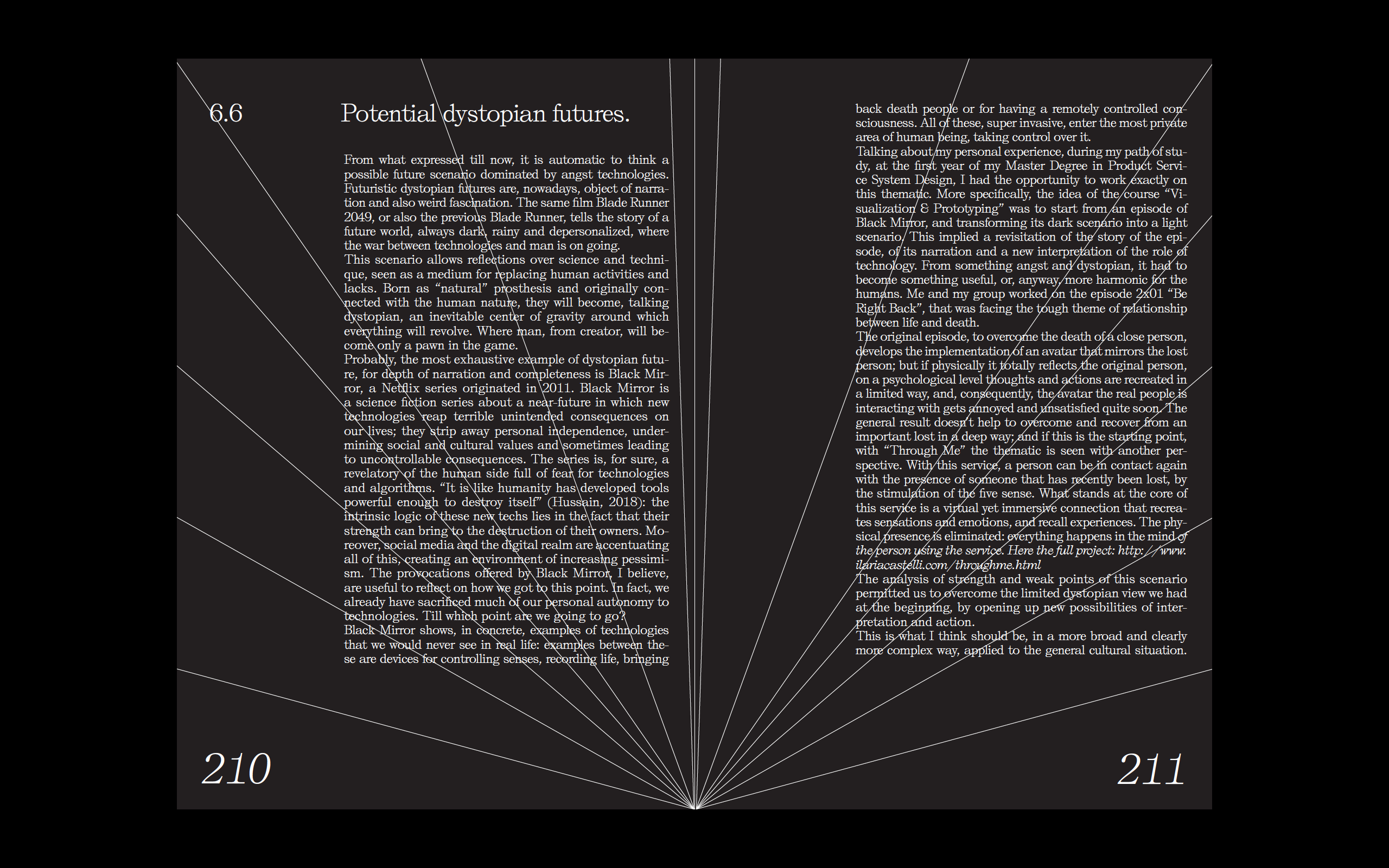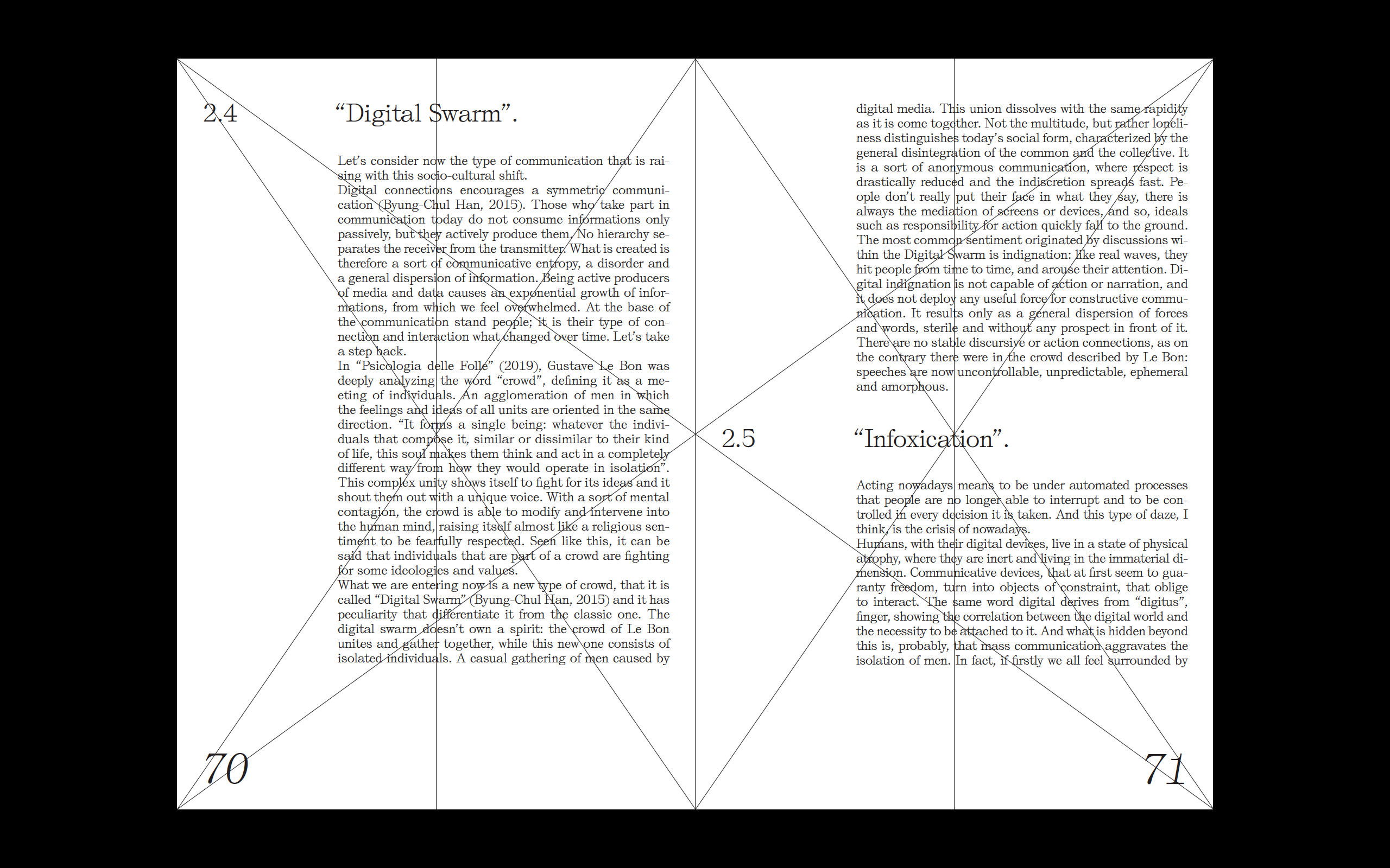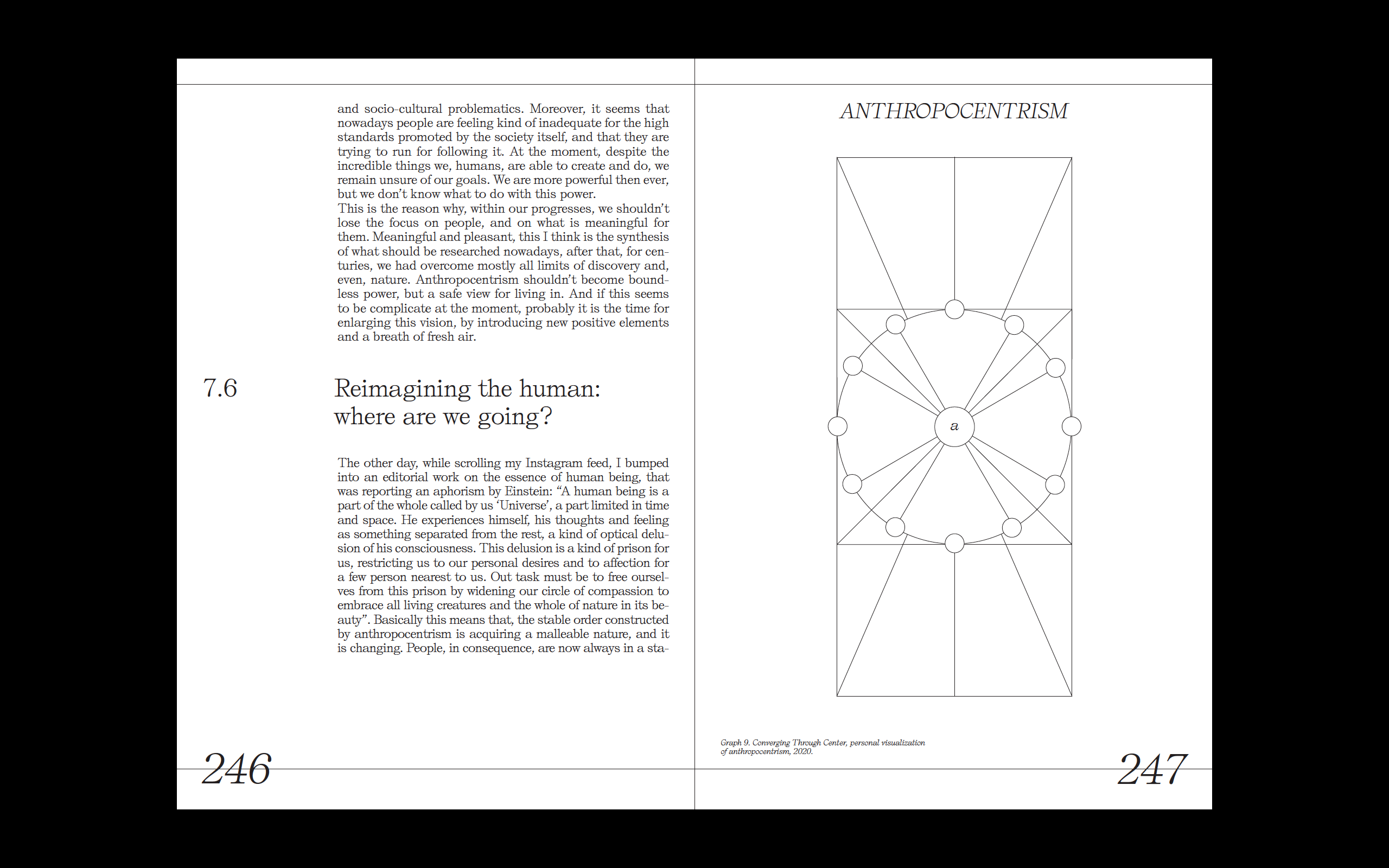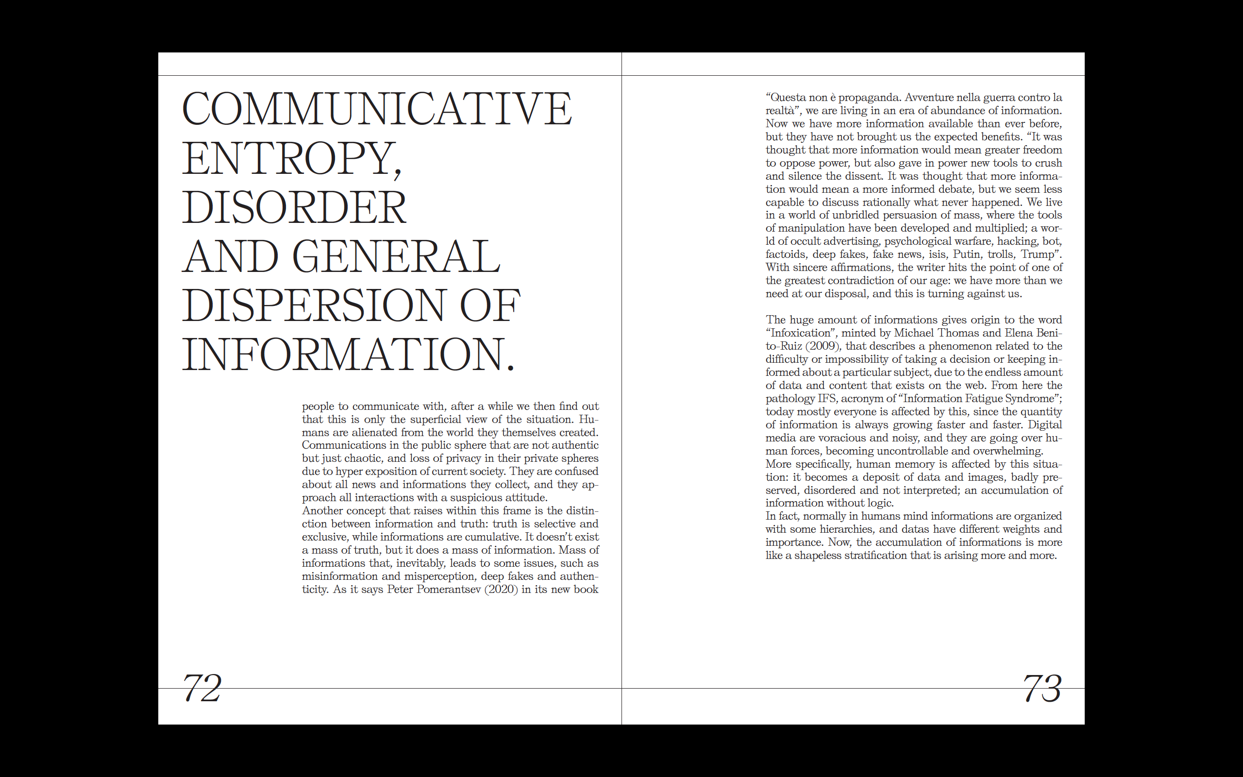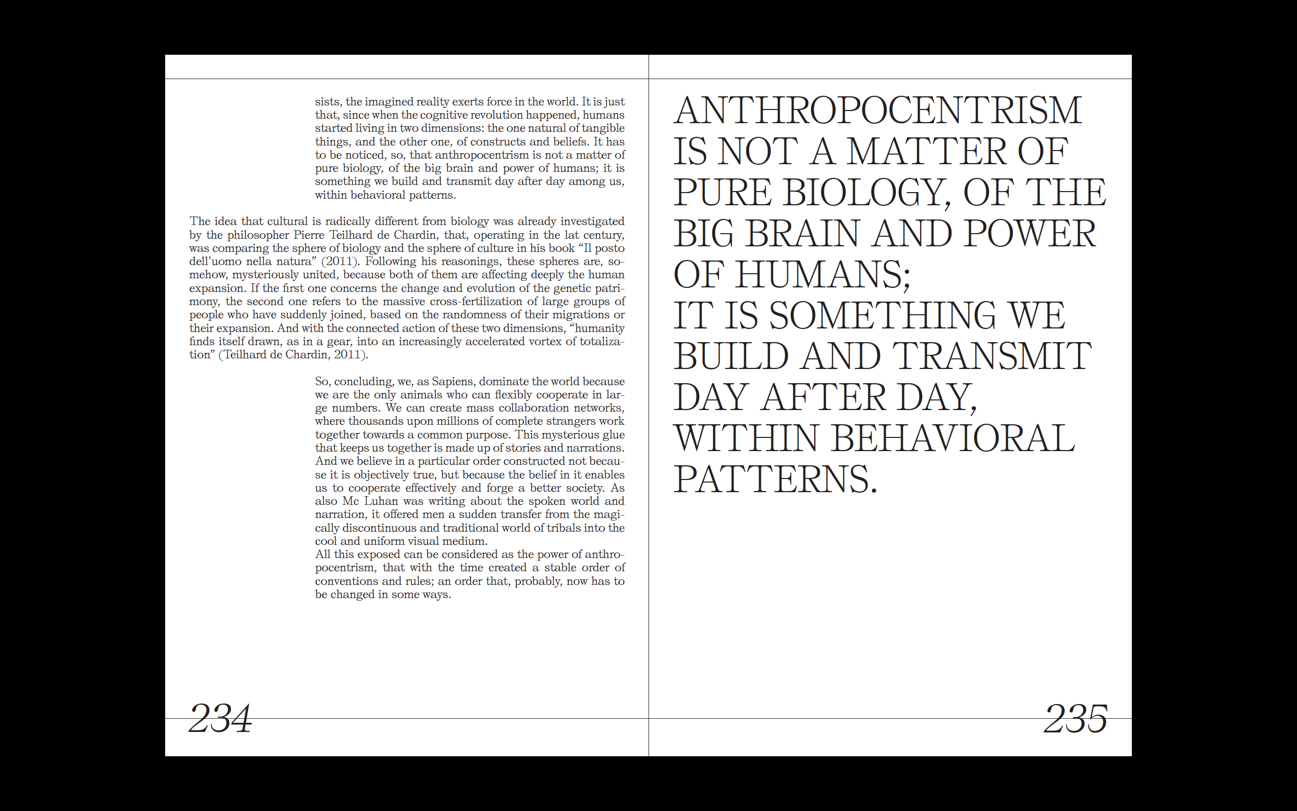 Graphically, the work is all built around constantly changing layout, black and white, emphasizing interconnections between topics and specific elements. For the typography, a single font is used throughout: Self Modern from Bretagne. As the name itself tells, the font merges pretty well a philosophical and literary approach and content, that tells about humanity and the human genre, revisited with a modern key, open towards the future. Self Modern has a well defined personality, it’s versatile and suitable for both long texts and for short titles.