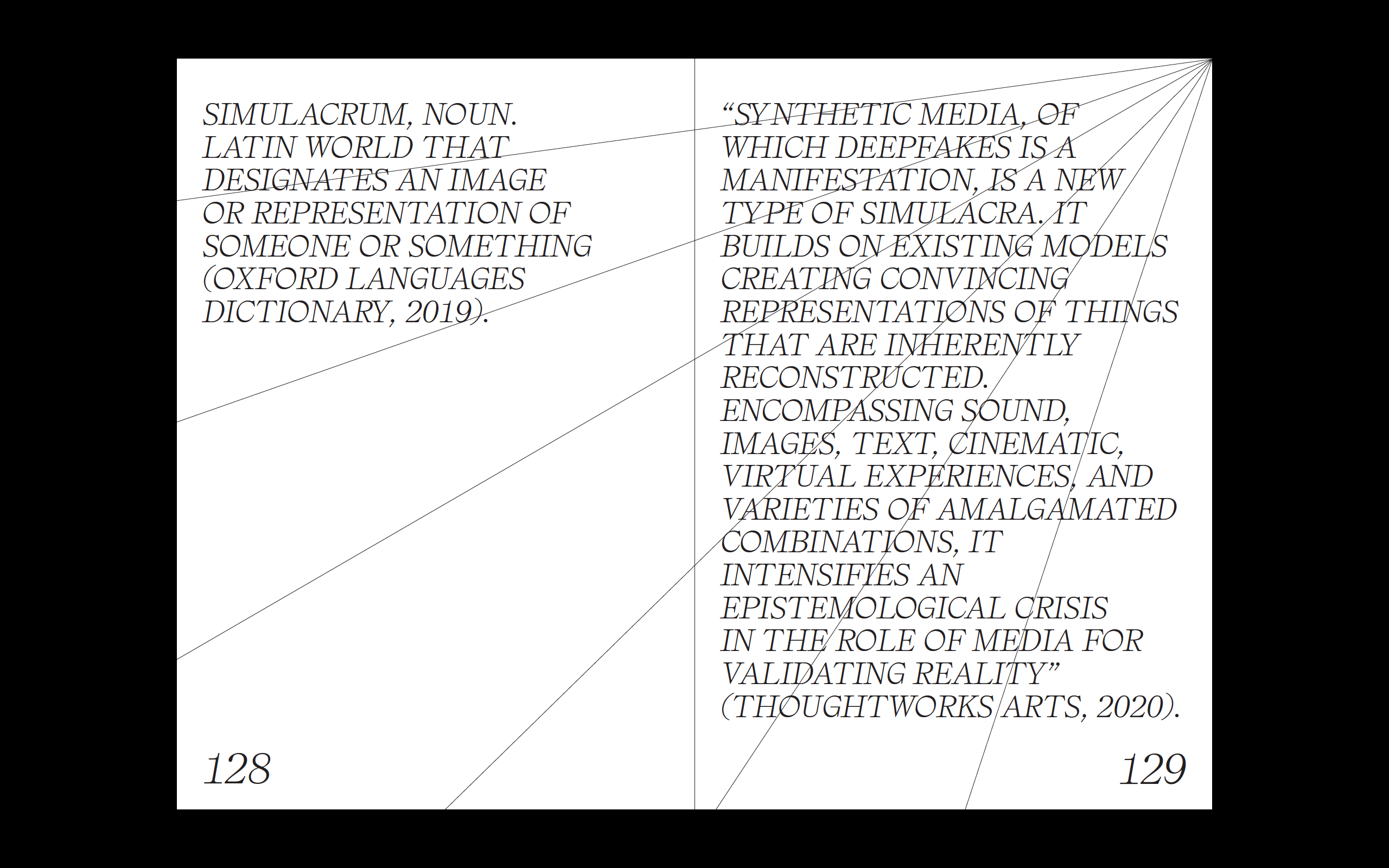Simulacra is a research of speculative design between ethnographic research, case studies and a phenomenological approach, that starting from the socio-cultural shift of our contemporary age, investigates the role that emerging technologies, such as synthetic media, play on a social, ethical and aesthetic level. Furthermore, it analyses what correlation there is between these, man and other organisms, showing the need to abandon an anthropocentric point of view, in order to embrace new perspectives of decentralized action, in a new post-human ecology. Particularly, the technologies and tools that we are creating nowadays are changing a fundamental part of our existence: the lenses through which we view and interact with the world. We are literally beginning to see the world through a new set of eyes and ears: things that were previously invisible become visible. The world of today is the world of simulacra, where media are autonomously created, distributed and spread without having a visual respondence in tangible references, acting and existing only in the digital realm, but still creating consequences on the material one. What can now be considered real, or fake? The ethical implications that this research brings with it, namely, the importance of relationships of trust and awareness, are also discussed. The aim is to analyze what are the weaknesses and what are the areas of possible growth. It will be investigated how, consequently, the role of design has to change and adapt: design becomes a bridge between known and unknown. With it is possible to explore the endless possibilities we have in front of us and that we can embrace. Design, we can say, acting as a cultural mediator and enhancer, could become the coordinator of a collective strength and intellect. It has to go beyond the pure rational and logical thought, in order to build beliefs for humans and non humans. Design can build awareness and meaning, it can become the catalyst of a collective consciousness, ready to face what is going to happen in the next future. In particular, the definition and search for a future of meaning and growth, avoiding dystopian futures governed by inhuman technologies and useless hierarchical constructs.