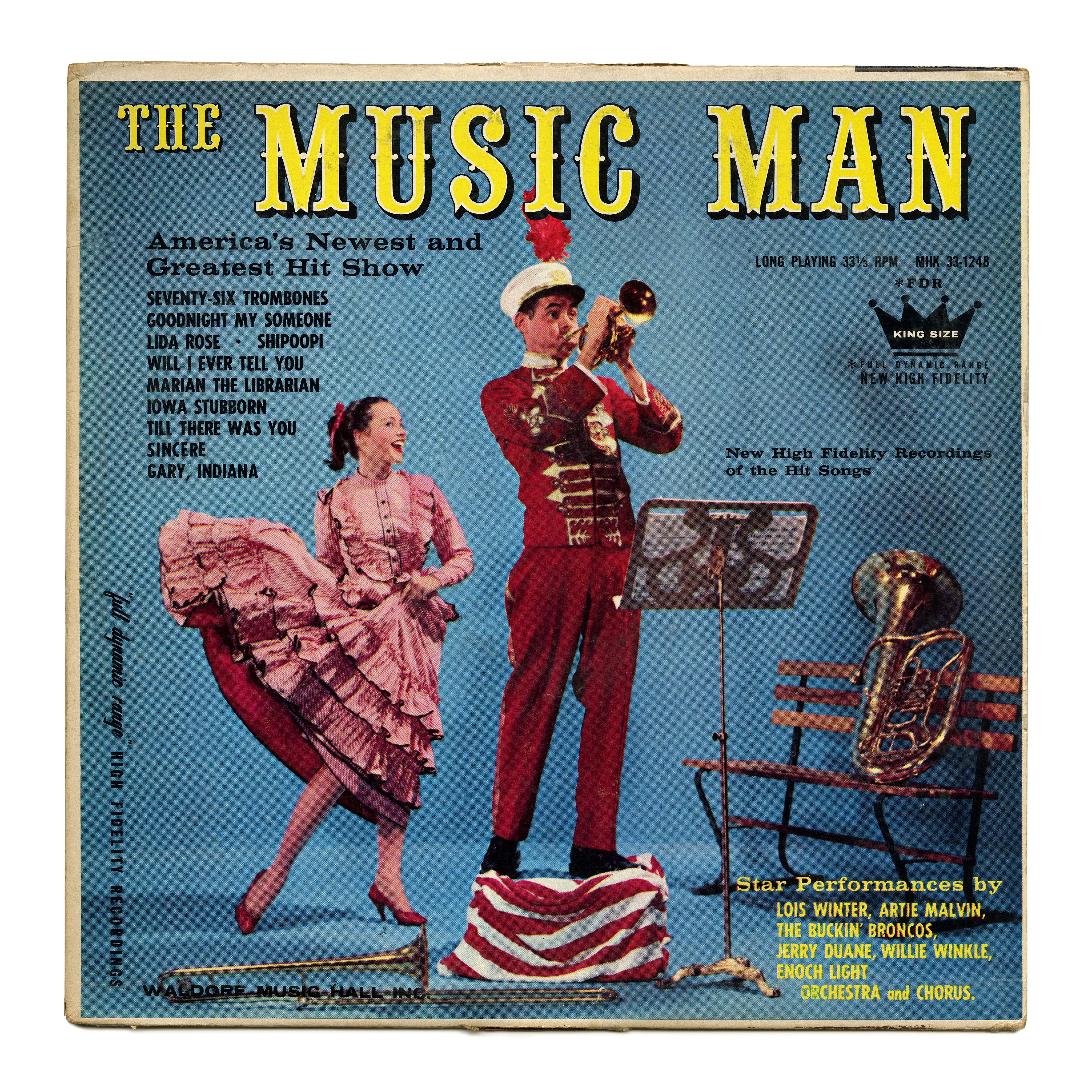Released by Waldorf Music Hall Records in 1958, this “King Size” LP includes recordings of The Music Man, a musical with book, music, and lyrics by Meredith Willson, based on a story by Willson and Franklin Lacey. In 1957, the show became a hit on Broadway. The cover typography features a bichromatic setting of Filmotype Quentin and a relatively early use of Volta (1956). The track listing and credits are set in all-caps Futura Condensed.