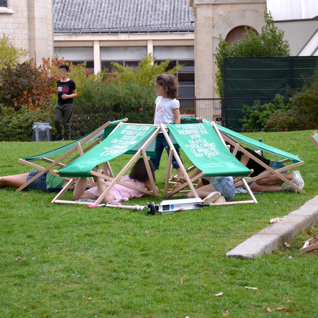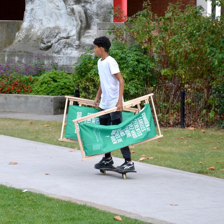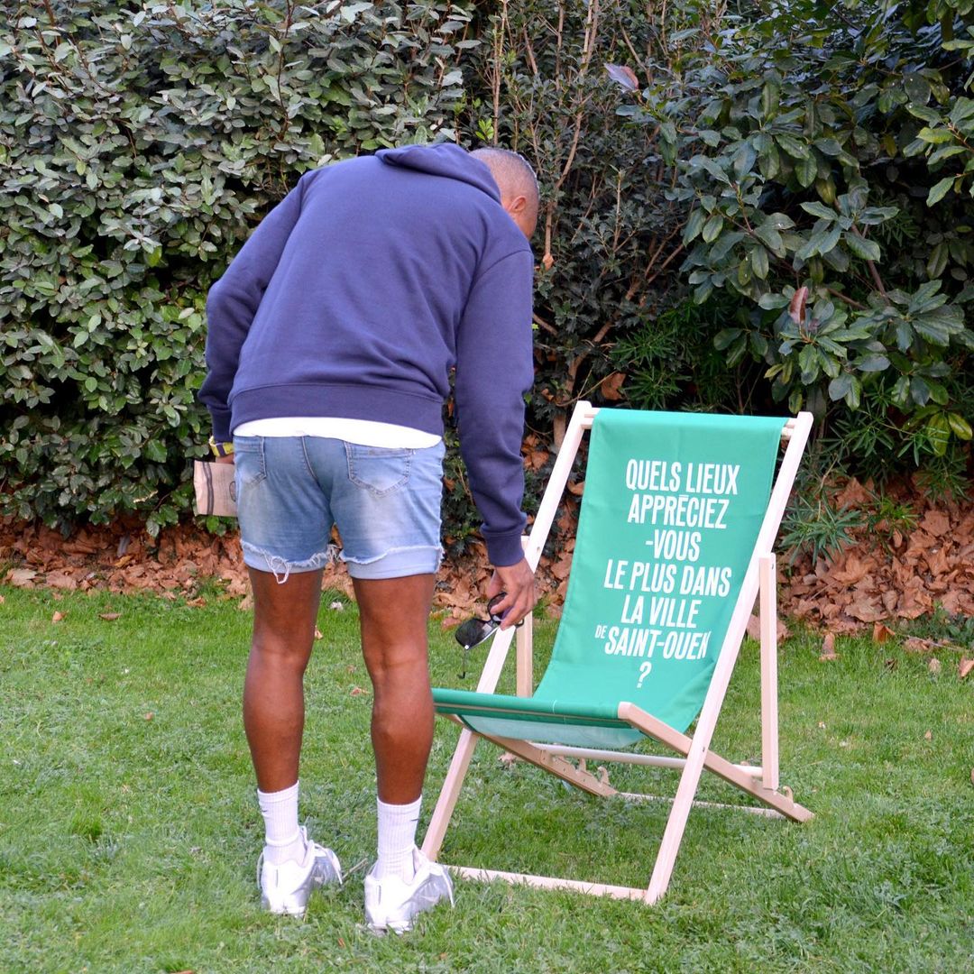 This also led to the design of custom deckchairs, where we can read different questions directly asked to anyone who comes across the square and wants to enjoy a relaxing time in the park. We can read questions such as “What places do you like most in the city of Saint-Ouen?” or “How many different languages can you hear in the streets of Saint-Ouen?”: these questions are already reflexions of the city and are incitations for people to share their experiences with each other.