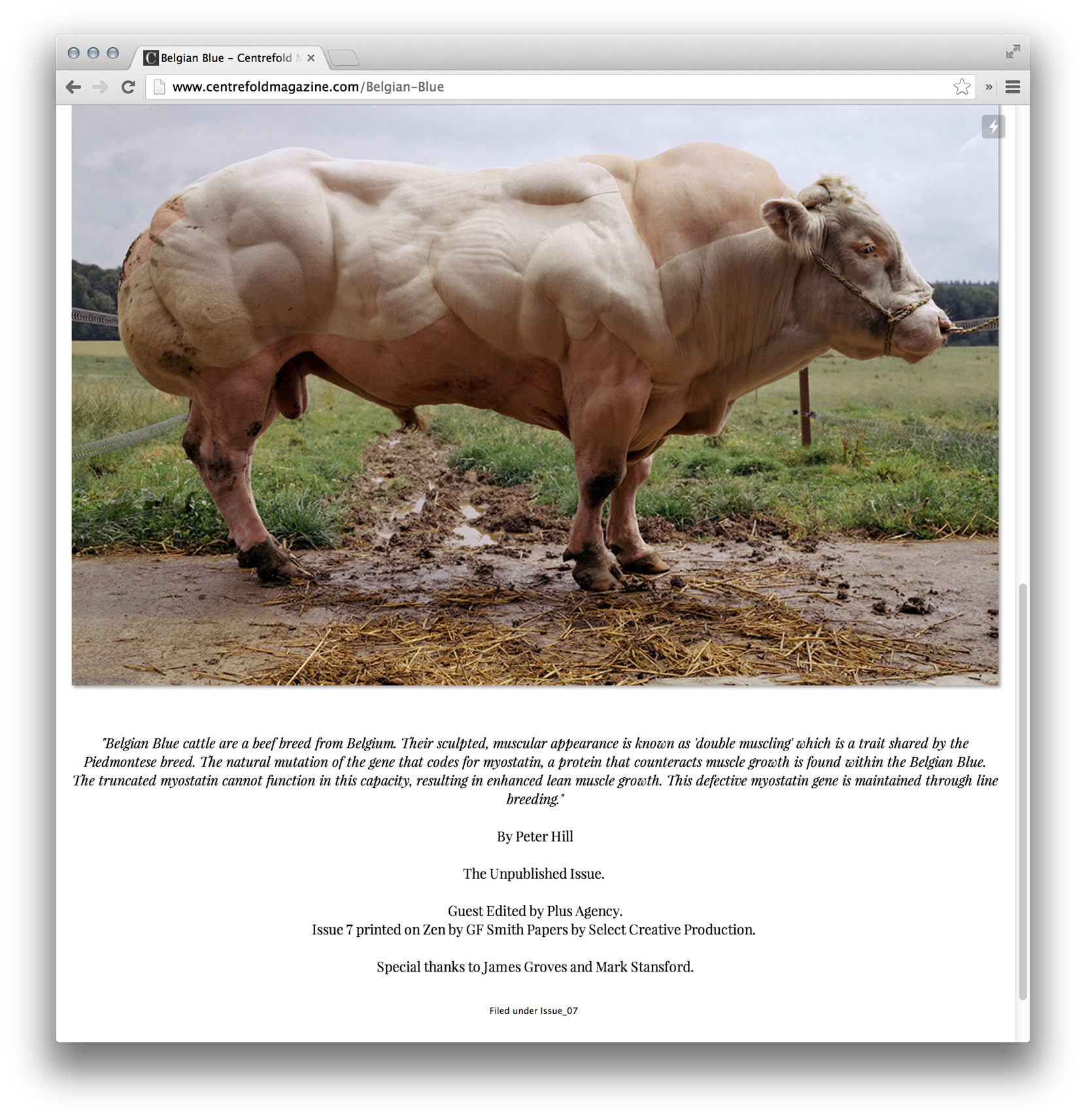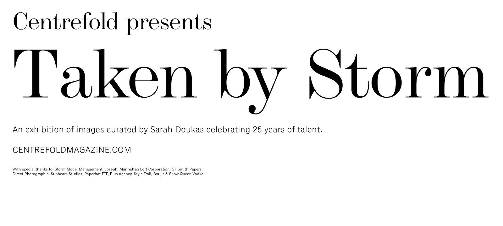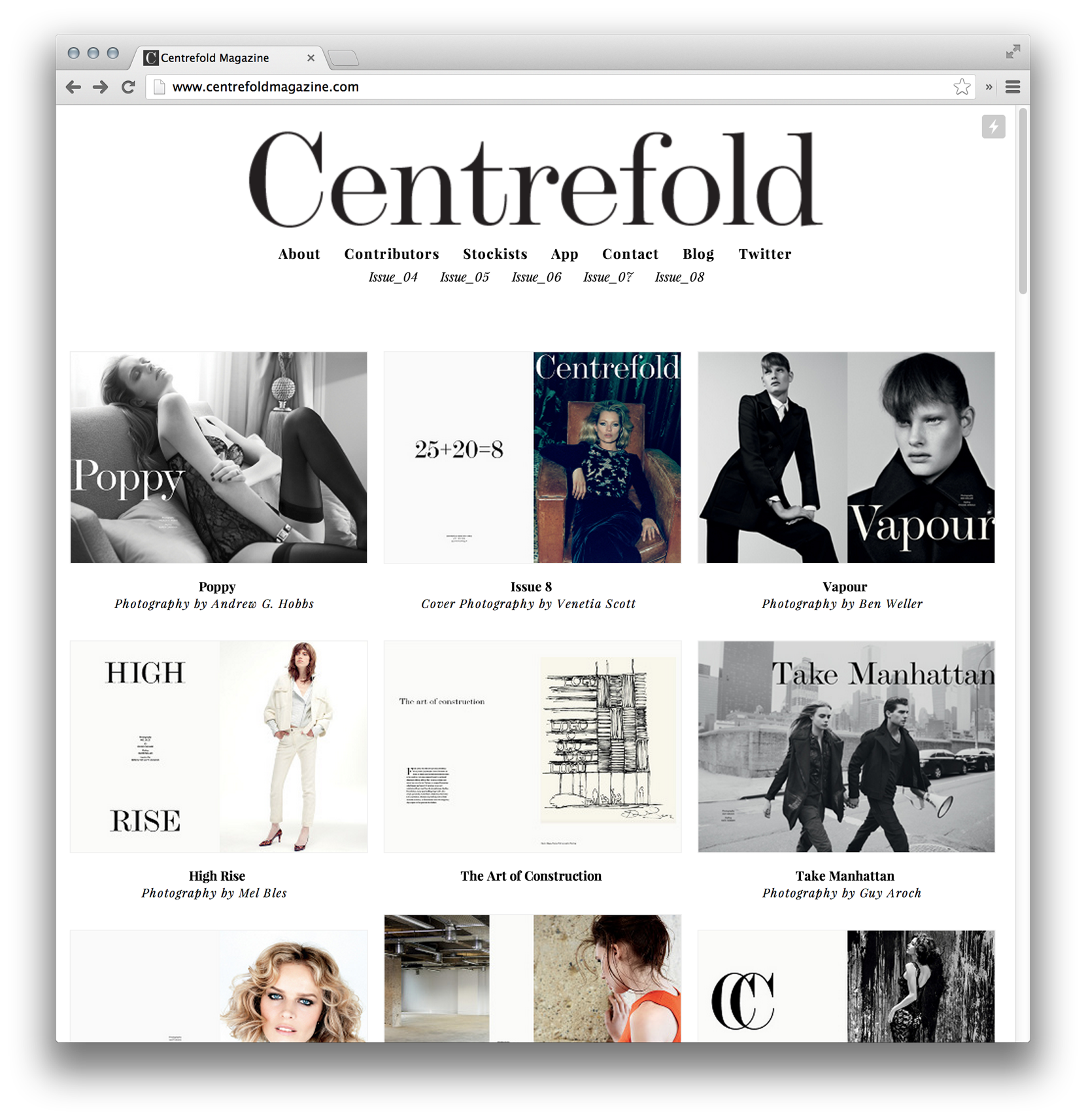 Centrefold uses Monotype Modern Display (a custom cut of Monotype Modern) for their logo and throughout this issue of the print magazine. The turn-of-the-century typeface sets a striking, classical tone for the publication and brand. Monotype Grotesque is a fitting companion from the same era. The website designers could have simply gone with the webfont version of the typeface (available at MyFonts and Fonts.com), but they chose Playfair Display instead. Playfair is a fine alternative with a similarly high stroke contrast, and its large lowercase helps it work for the midsized copy on the web, but its readability is really stretched at small sizes. I would consider bumping up the text or using a family like Benton Modern RE that is specifically for screen text.