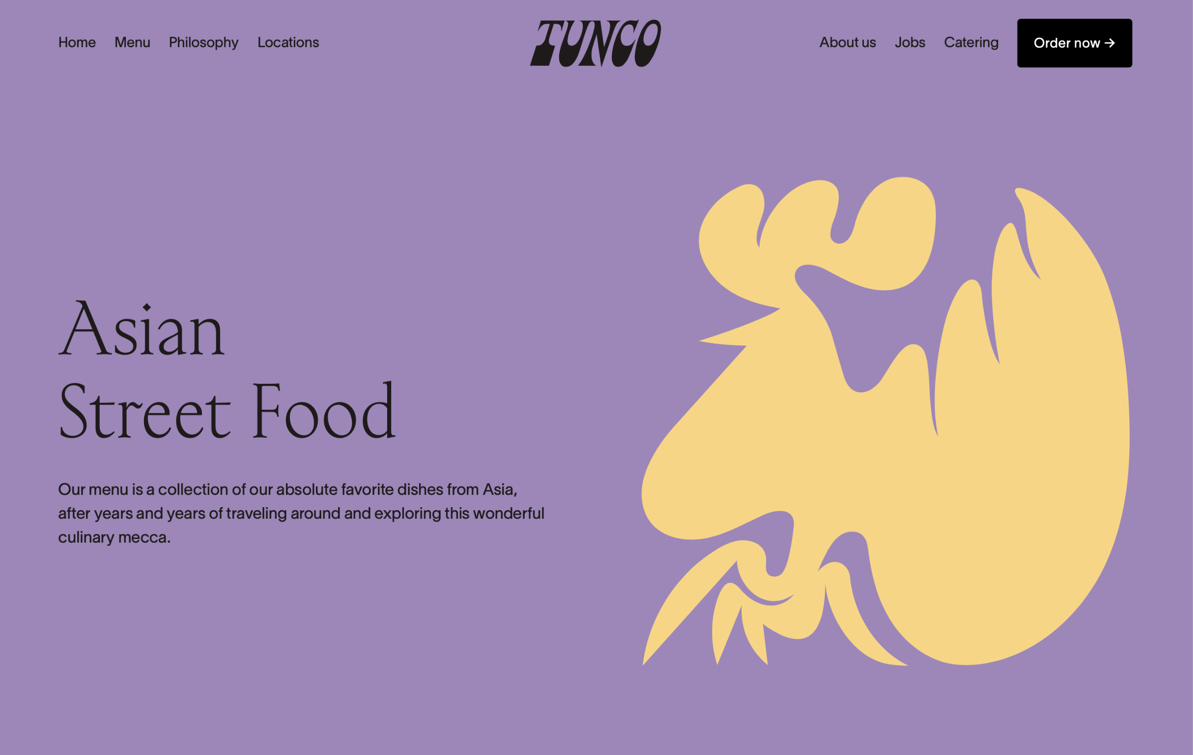Visual identity by Try Design for Tunco, an Asian Street Food Restaurant in Oslo. The restaurant logo is set in Funkford. On the website, Kessler is used for headlines. Lausanne is used throughout for information.