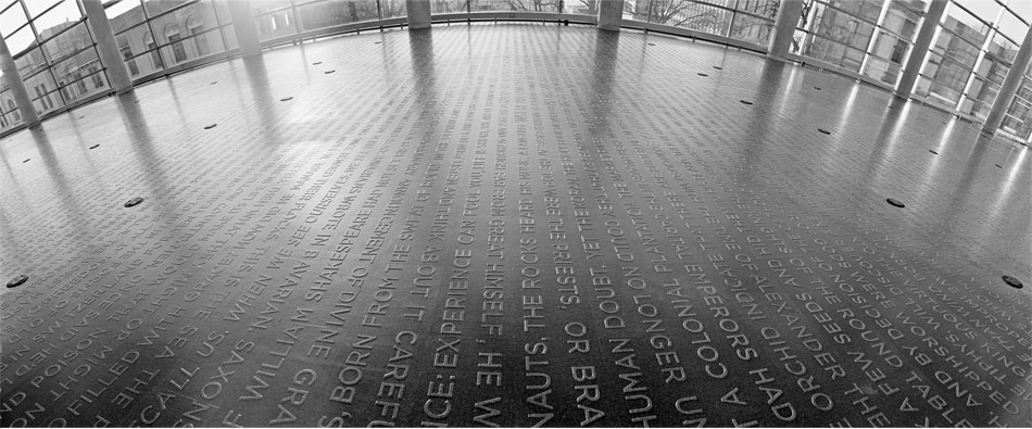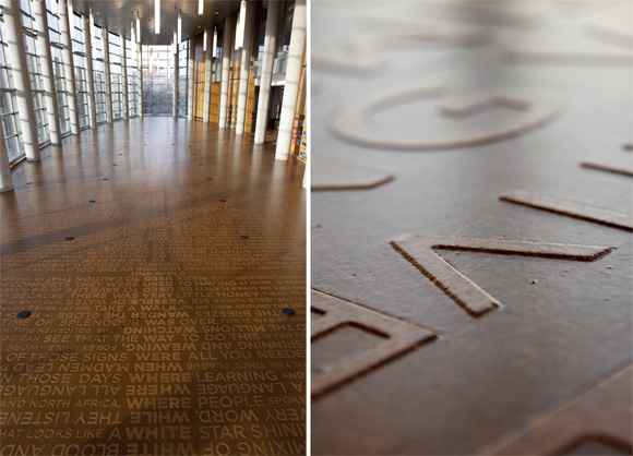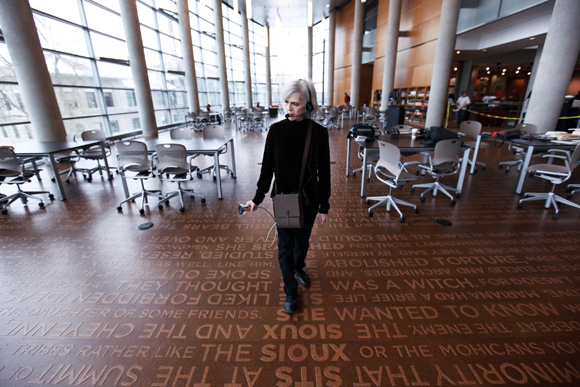 Ann Hamilton’s public art project is a two-color cork floor laid as a field of words set in relief and located in the Thompson Library Buckeye Reading Room. The text is created by an alphabetic intersection and line-by-line weaving of three different accountings of world history that are arranged in a literary concordance. The spine along the north-south axis is composed of 299 words in A-Z order and adapted from The End of the World – a White River Sioux tale. The east west lines of text intersect this story with prose fragments from A Little History of the World by E.H. Gombrich (1936) and Mirrors: Stories of Almost Everyone by Eduardo Galeano (2009).