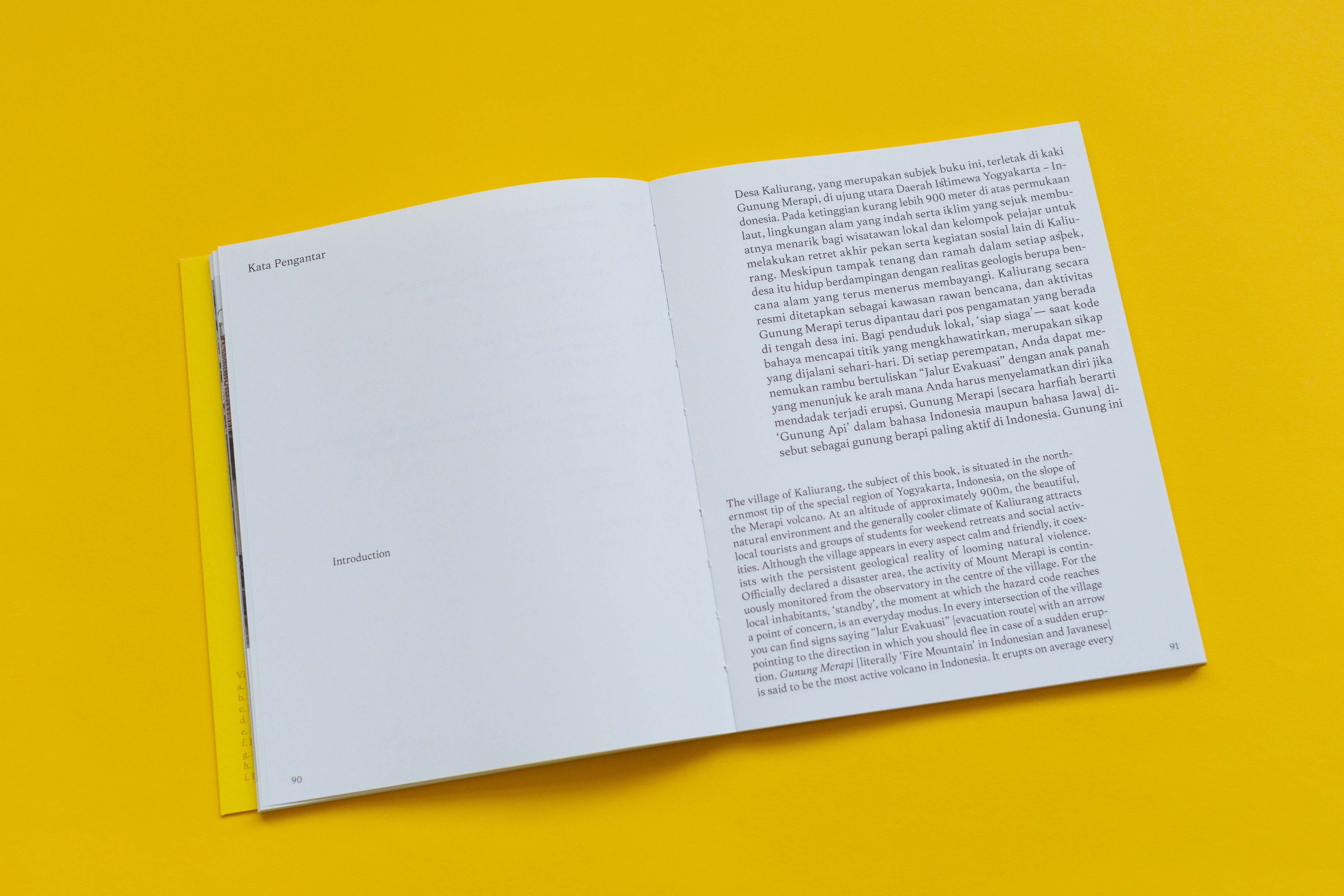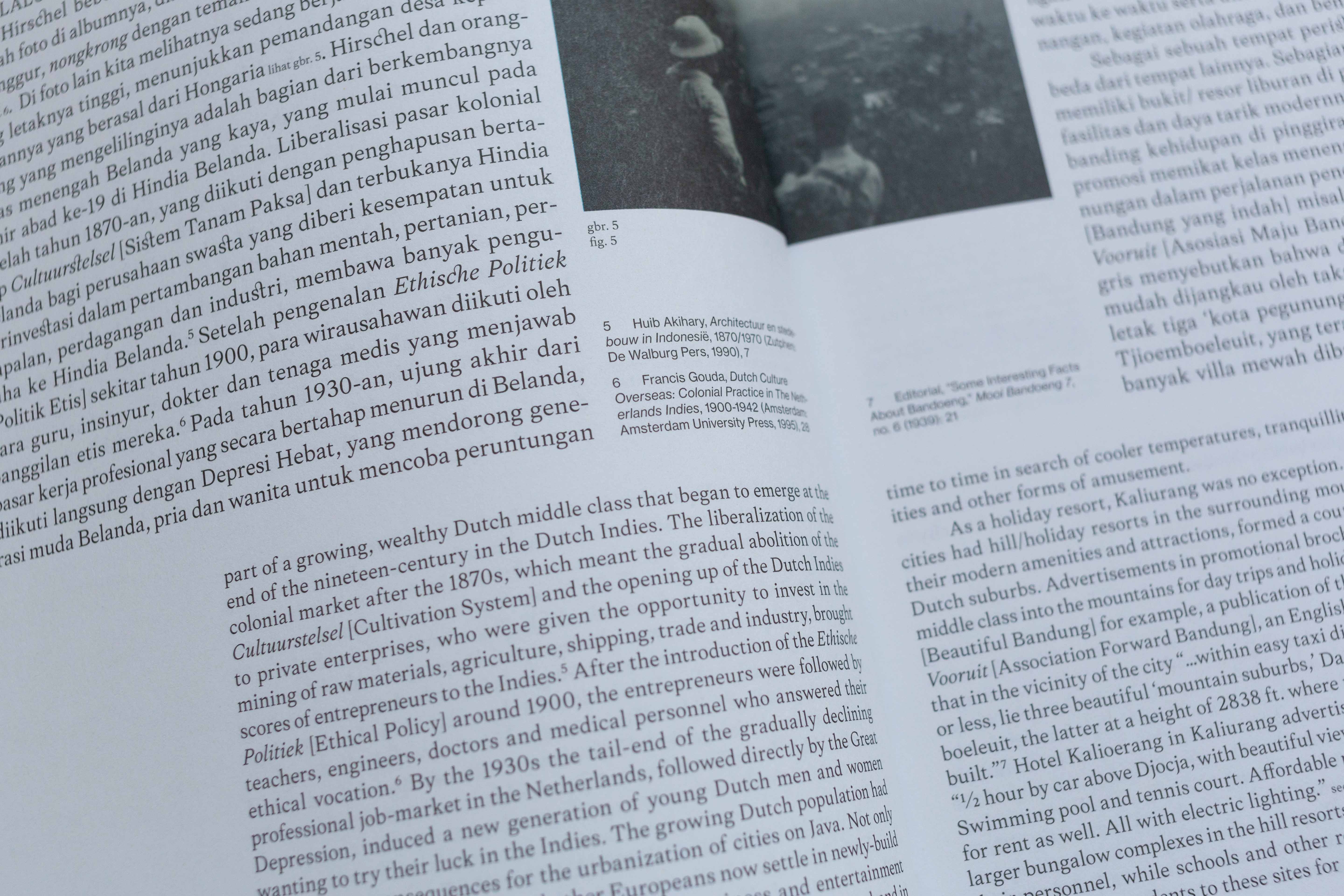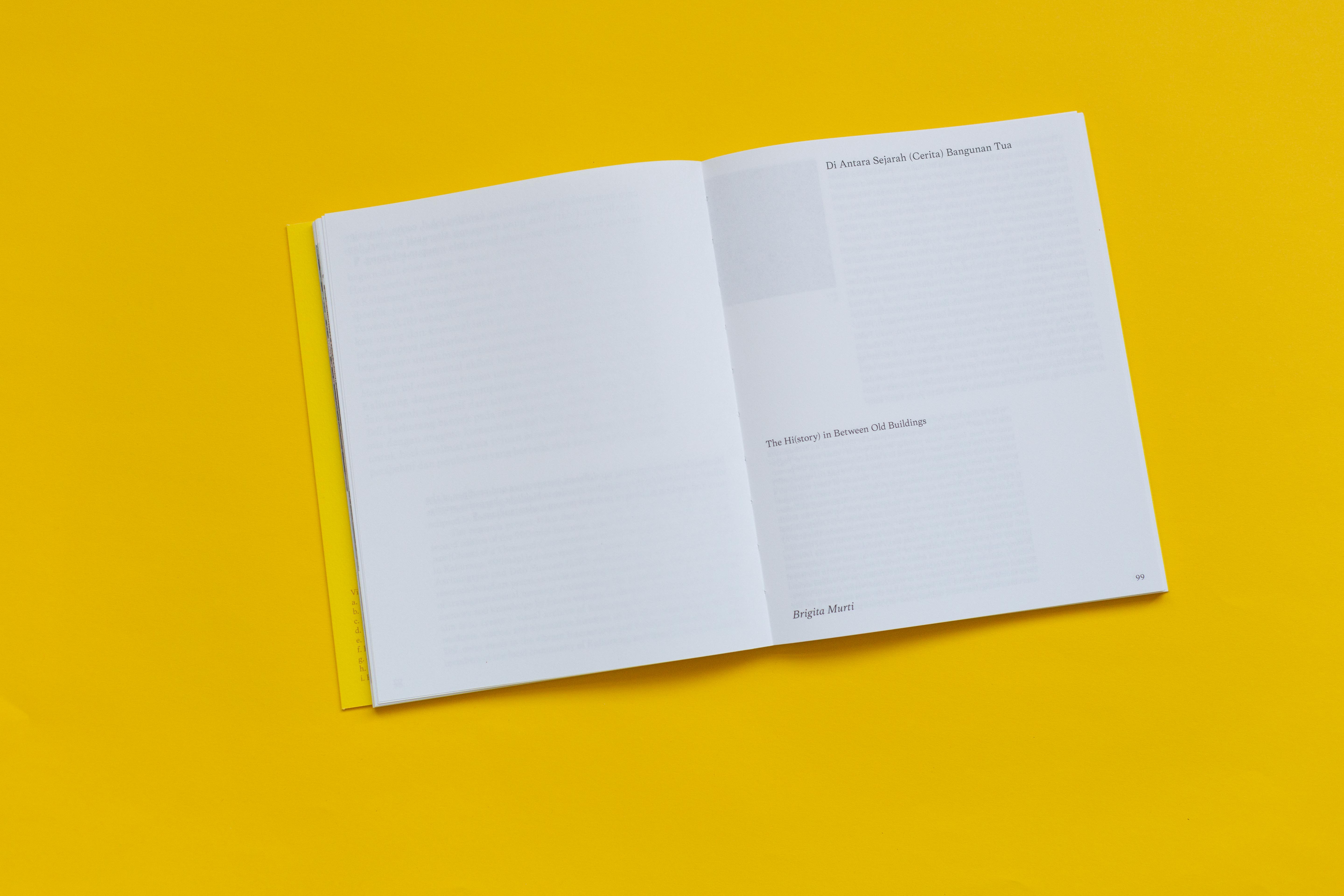 The essays are written in Indonesian and English. The main typeface used, Frasa, was made by Tokotype — an Indonesian type foundry. For us it was important to not split the two languages but to have them run next to each other, with highlighting the Indonesian text as the main language.