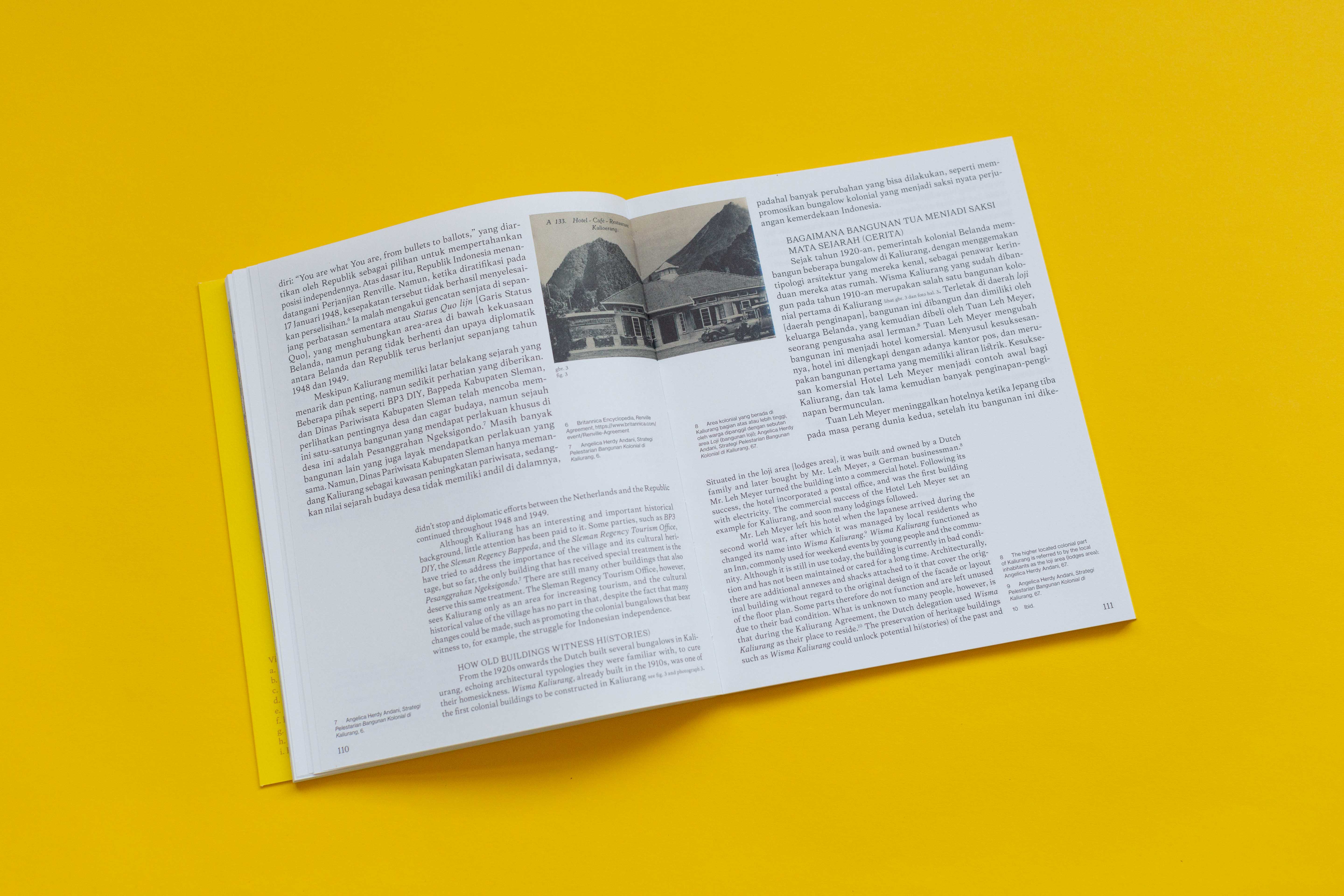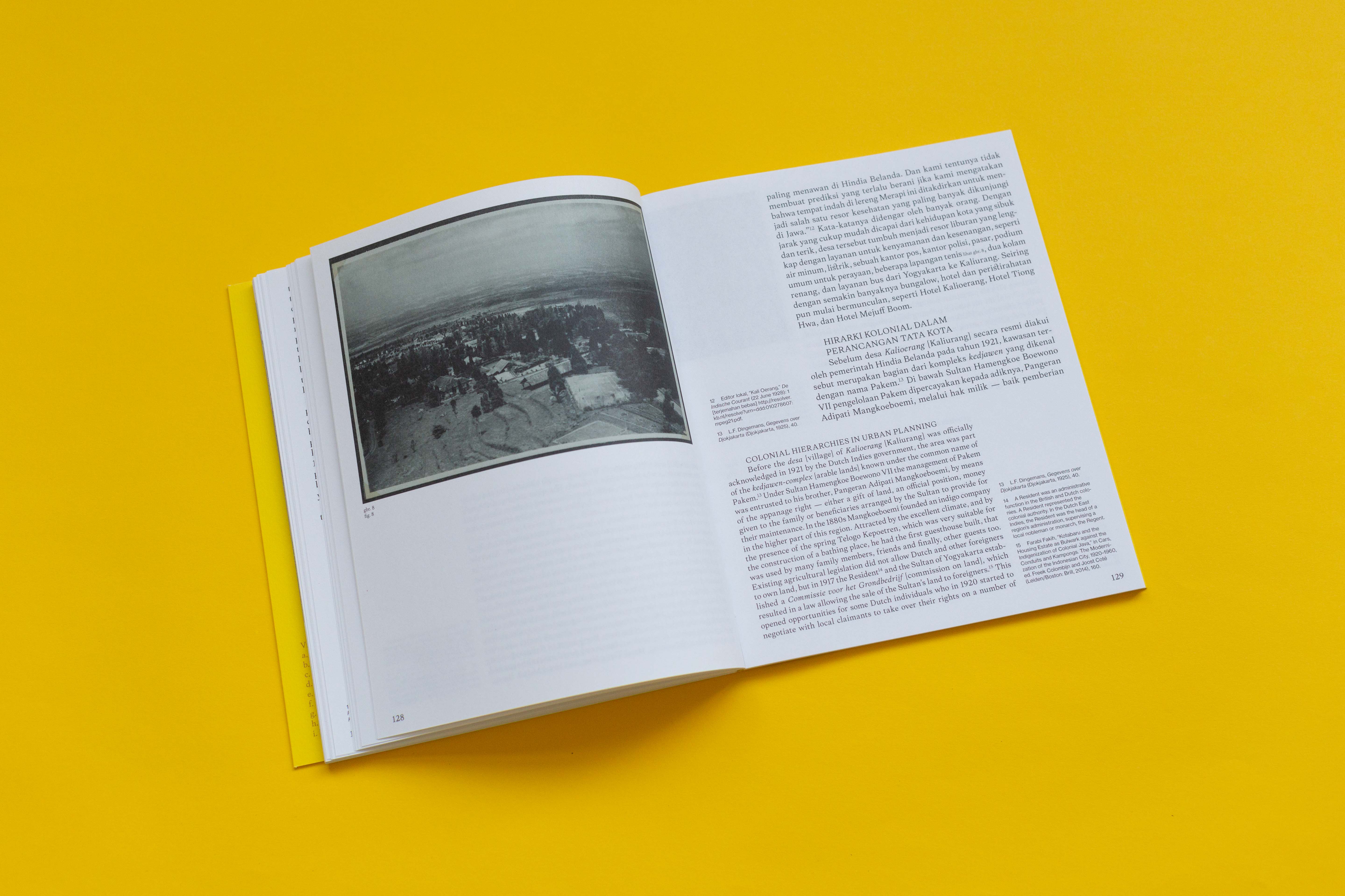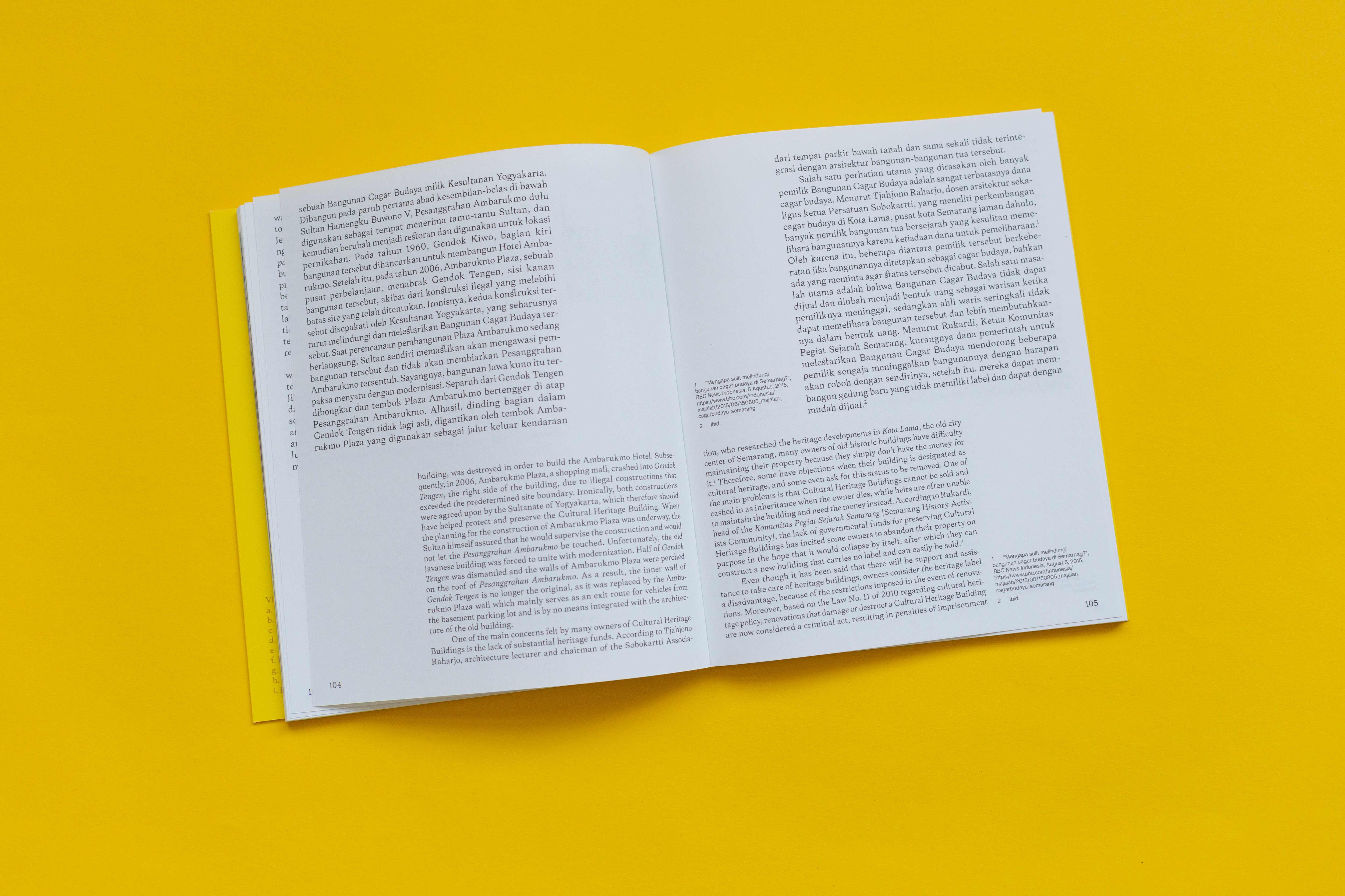 The essays are written in Indonesian and English. The main typeface used, Frasa, was made by Tokotype — an Indonesian type foundry. For us it was important to not split the two languages but to have them run next to each other, with highlighting the Indonesian text as the main language.