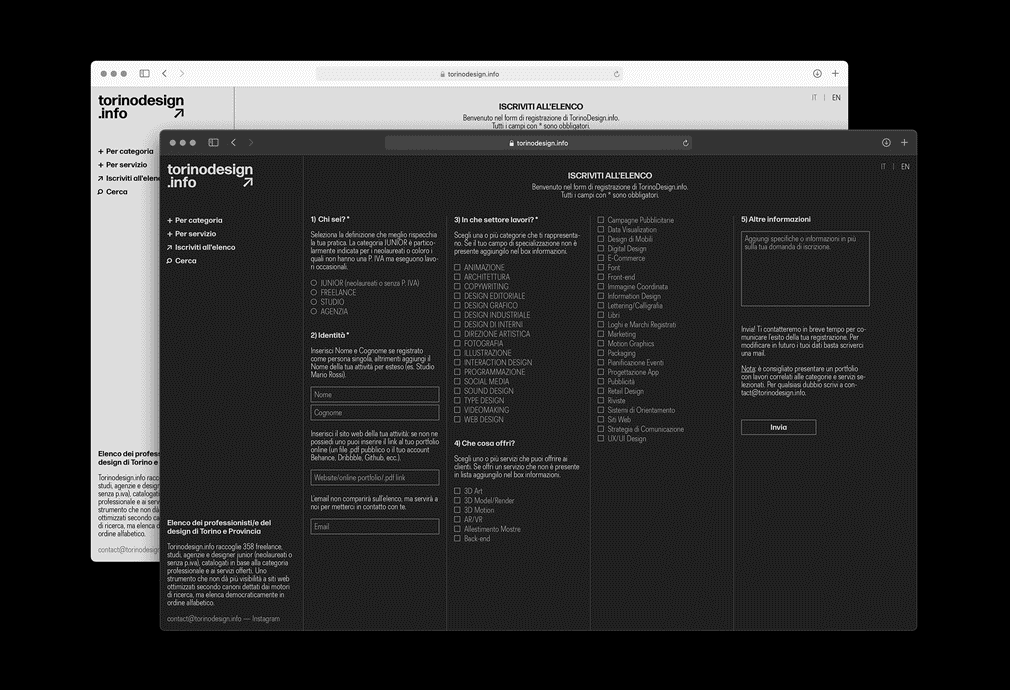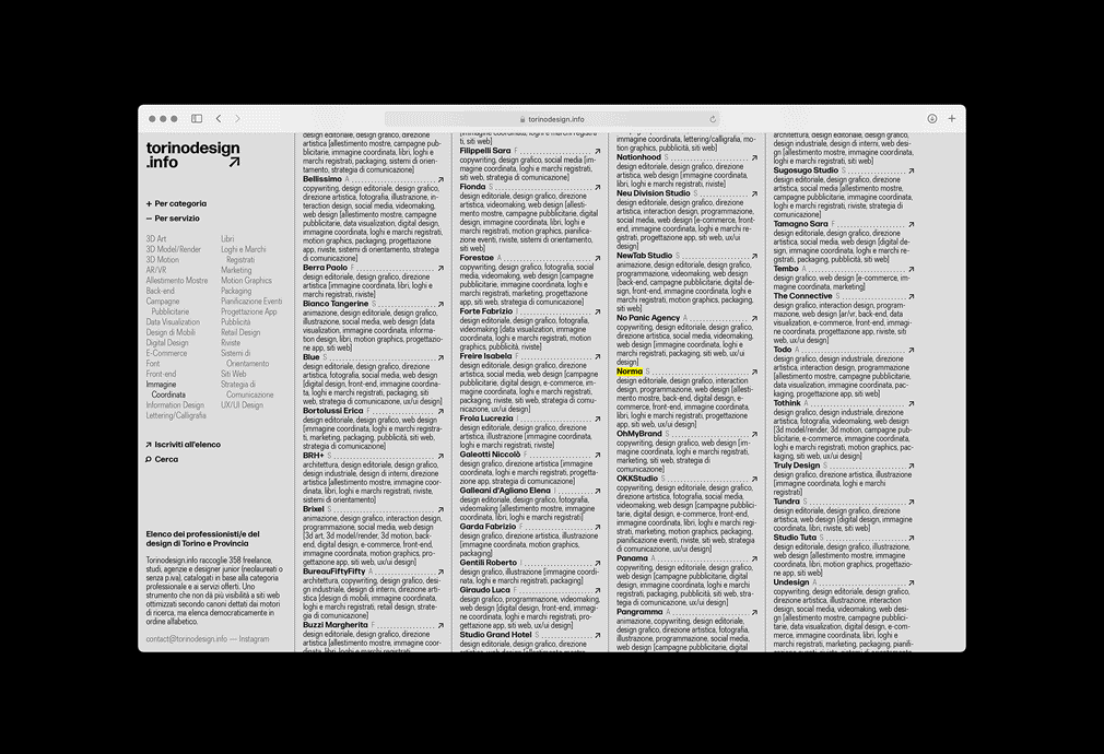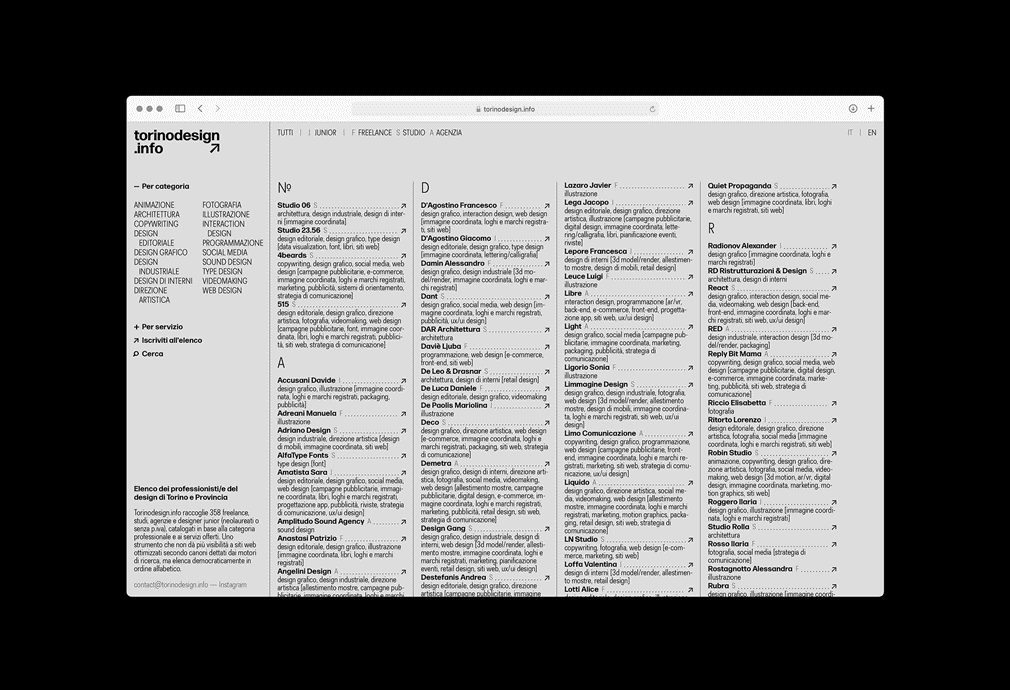 TorinoDesign.info is a list of design professionals from Turin (Italy) and its province. Much like a paper phone book, it collects over 360 freelancers, studios, and junior designers (recent graduates or without VAT), listed based on the professional category and the services offered.