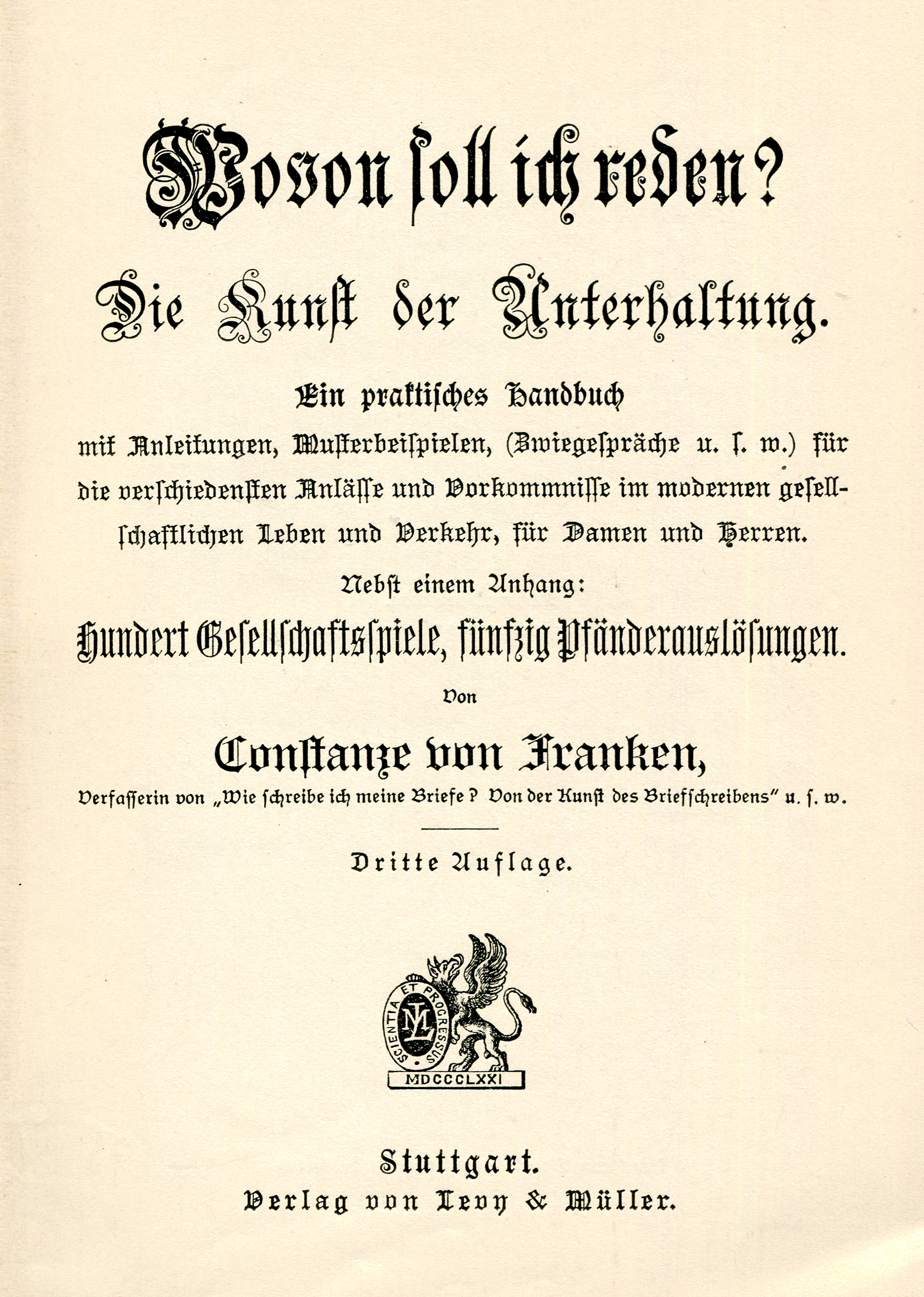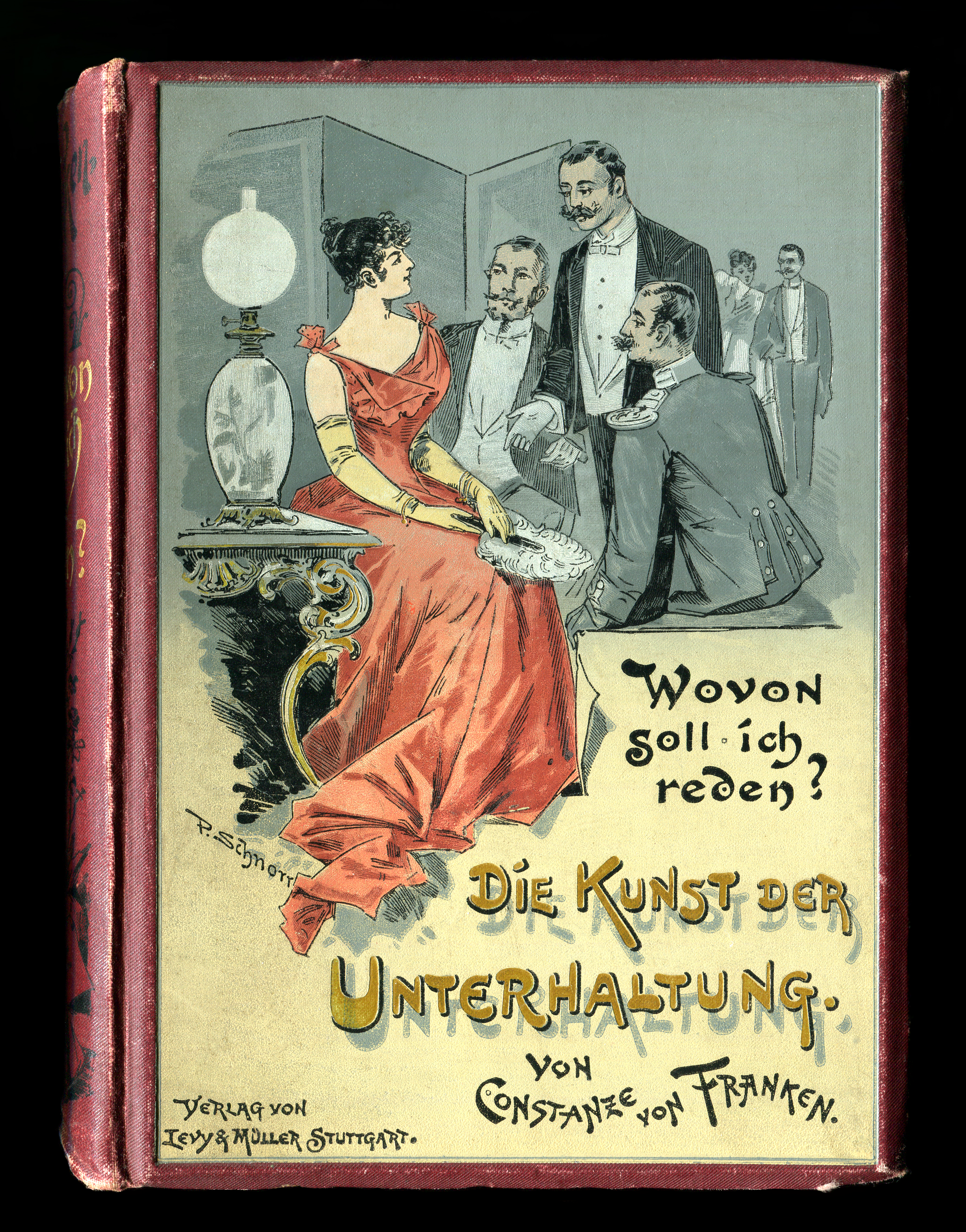 “What should I talk about? The art of entertainment” is a manual for conducting a conversation, written by Helene Stökl (1845–1929) under her pen name, Constanze von Franken. First published in 1894 by Levy & Müller in Stuttgart, with the second edition following in 1896, this is the third edition, probably from around 1898.