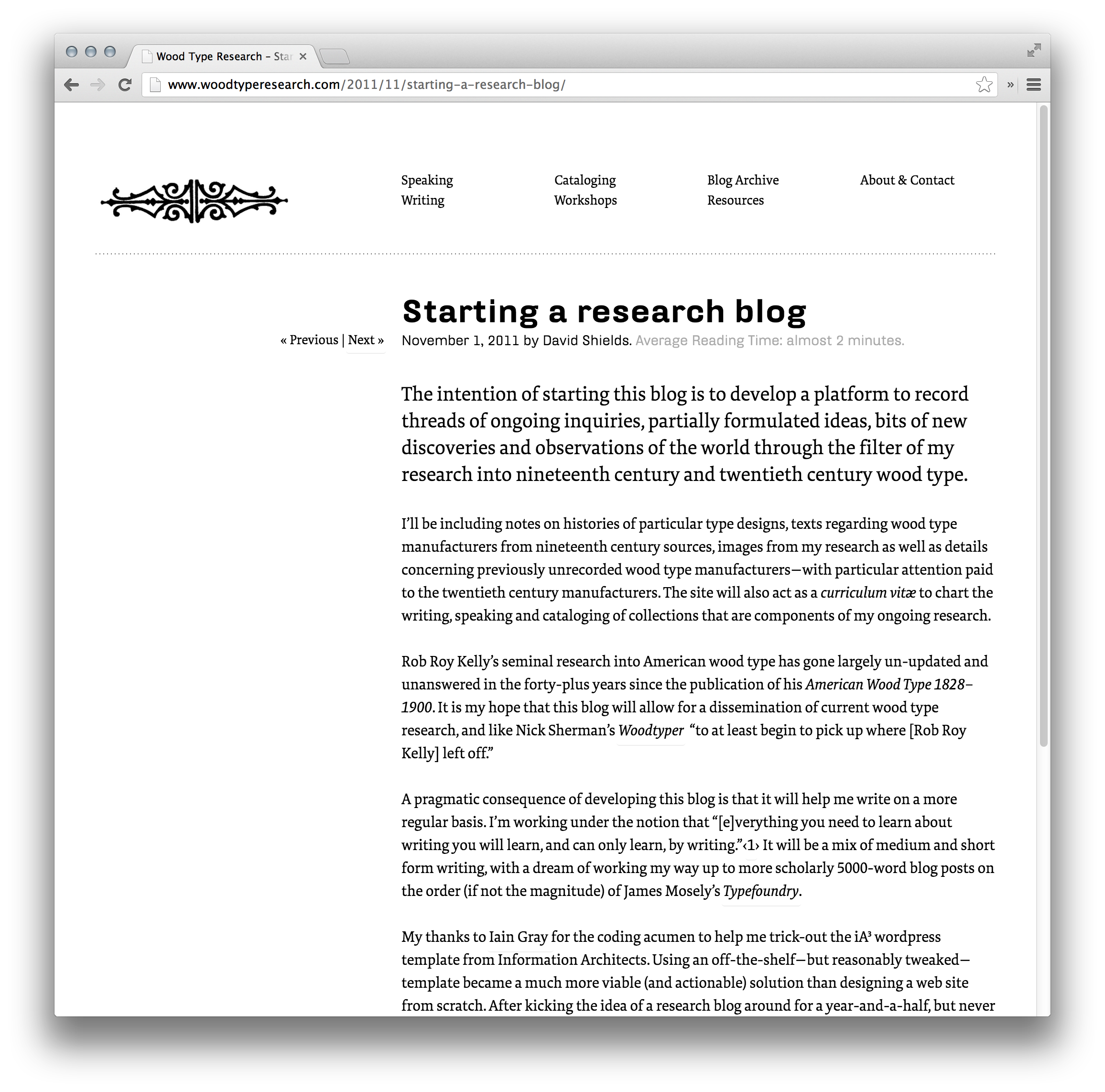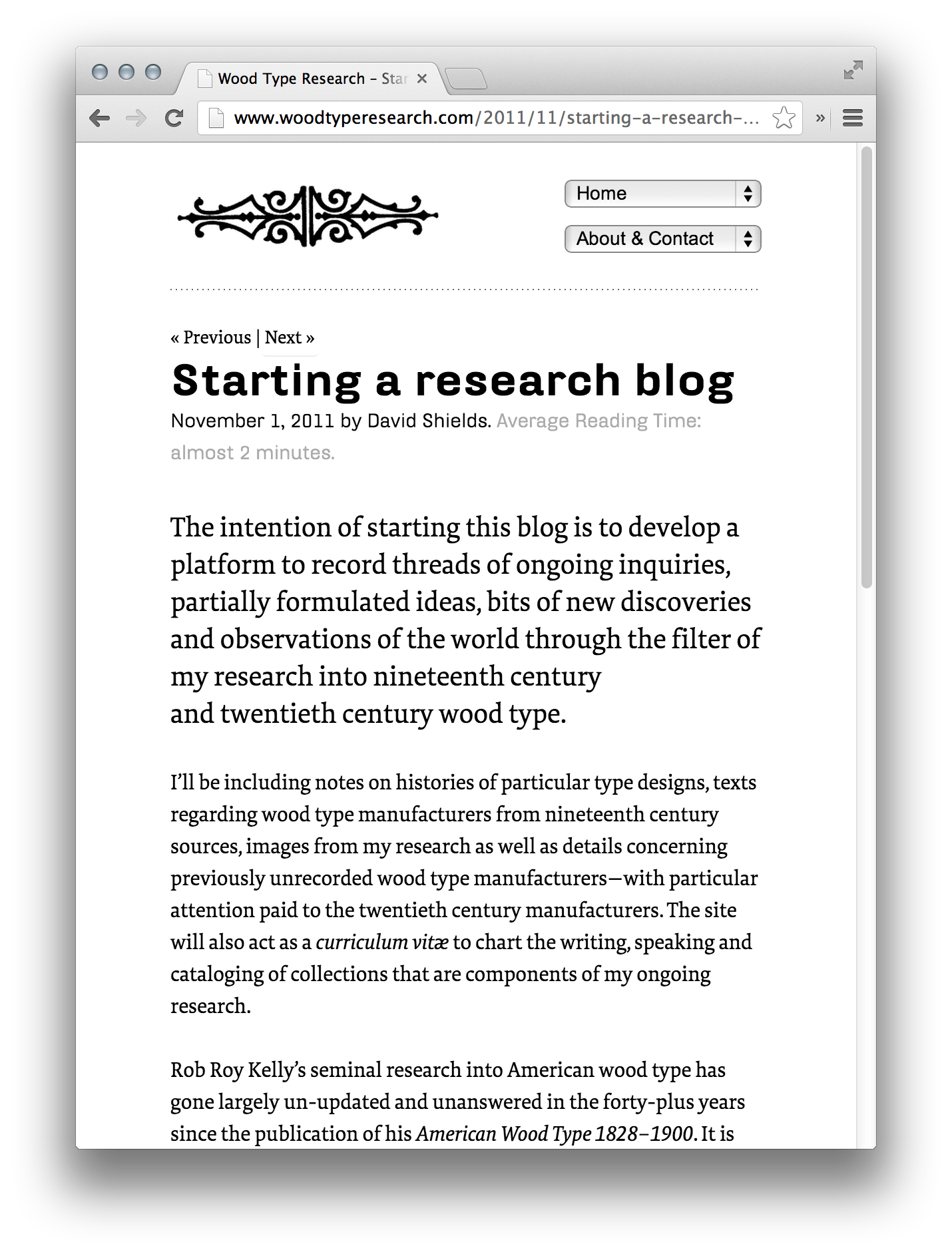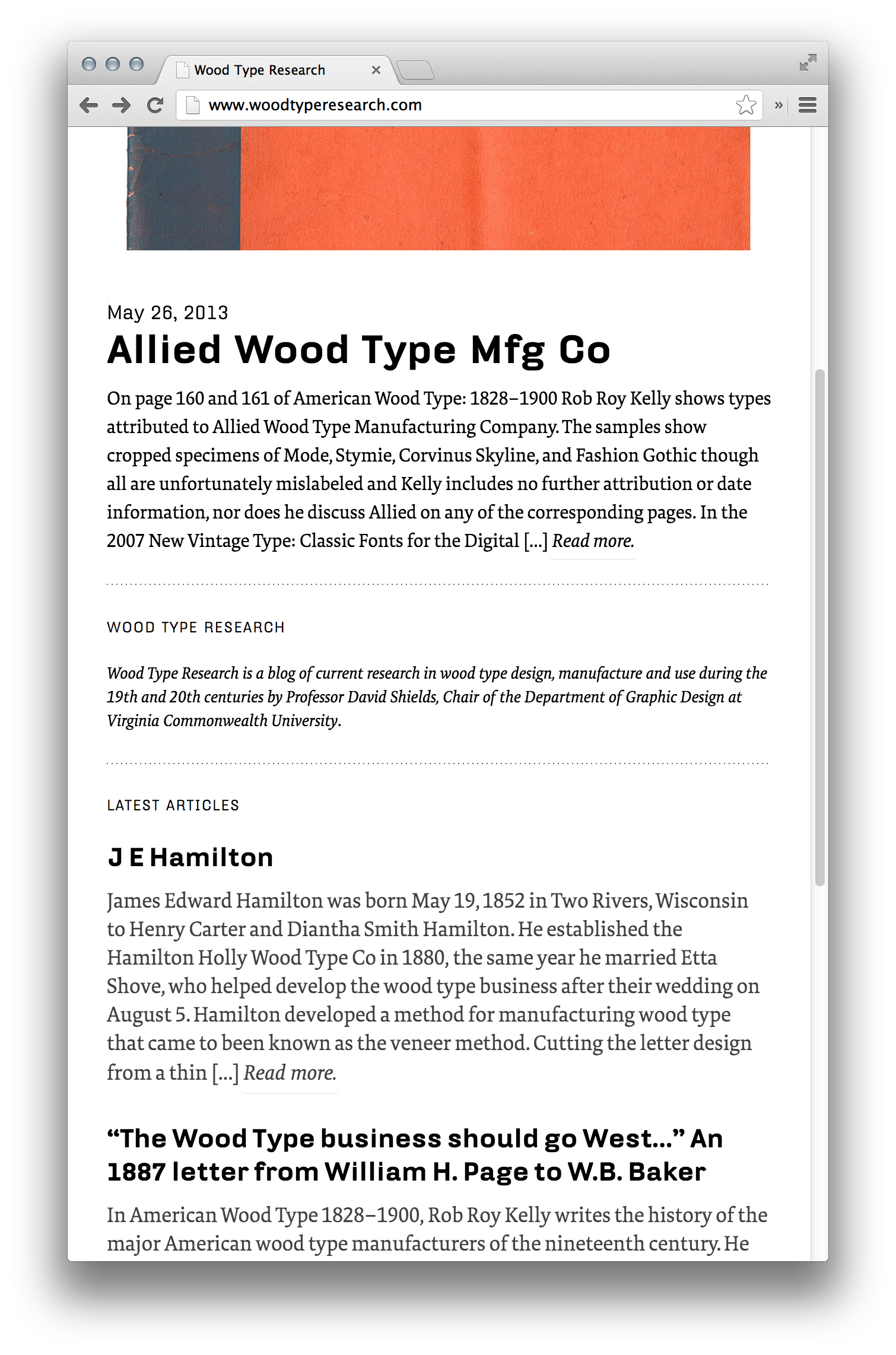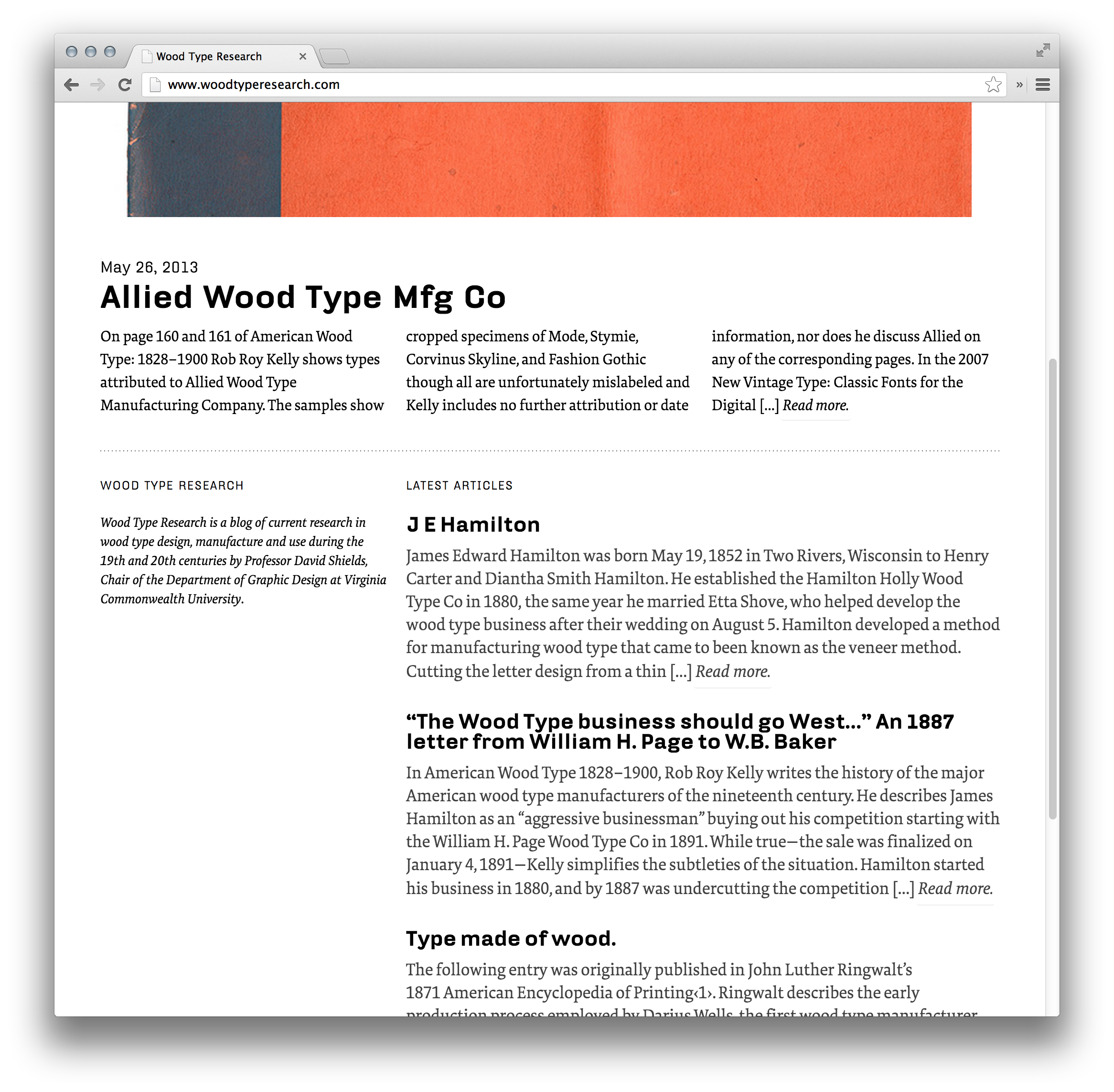 Wood Type Research website Contributed by Stephen Coles on May 29th, 2013. Artwork published in 2011. Source: www.woodtyperesearch.com License: All Rights Reserved. The blog of Professor David Shields, Design Custodian of the Rob Roy Kelly American Wood Type Collection. A modified version of the iA³ WordPress template. FF Hydra, a typeface inspired by 19th-century type, is a great pick for headlines. Source: www.woodtyperesearch.com License: All Rights Reserved. Source: www.woodtyperesearch.com License: All Rights Reserved. Source: www.woodtyperesearch.com License: All Rights Reserved. Typefaces More about FF Hydra TextMore about FF Tundra Formats Web (5628) Topics Graphic Design (3011) Designers/Agencies David Shields (2) Tagged withhistory (390)US history (69)wood type (62)blogs (121)Rob Roy Kelly (1)responsive (165)RWD (11)webfonts (449) Post a comment Name Email – will not be published Website Your response Submit Comment More FF Tundra in use TYPO Berlin 2013, “Touch”2013studio adhocContributed by Florian Hardwig TYPO conference branding2011studio adhocContributed by Stephen Coles Jesus Magazine2014Luca PitoniGiacomo TraldiContributed by Giacomo Traldi Sponsor More in Graphic Design Macao Design Week 20202020Untitled MacaoContributed by VJ-Type Staff Pick Poster for Exhibition about the Corporate Design Olympic Games Munich2012Jochen SpeidelContributed by Indra Kupferschmid Staff Pick Porodica i domaćinstvo: lepršava svakodnevica Dušana Bekara exhibition catalog2024Dušan BekarAlira Hrabar BekarBEKAR HAUSContributed by BEKAR HAUS SPREAD – Yale School of Art Graphic Design MFA ’24 thesis catalog2024Daedalus Guoning LiLobbin LiuContributed by LOBBIN LIU More in Web Learning Digital websitec. 2020Anita EvtuchContributed by Julien Fincker Leah Downing portfolio website2020Leah DowningContributed by Alain Papazian artguide.com2014CharmerContributed by kmalykh k VŠVU Website2013Martin KahanContributed by Florian Hardwig Staff Pick More Fonts In Use JUFA Hotels2016En GardeContributed by Darden Studio Staff Pick All Will Be Well at V&A Museum2020Boris MeisterV&A DesignContributed by Boris Meister Staff Pick Friedrich Rumpfkeil & Söhne invoice, 1919c. 1919unknownContributed by Florian Hardwig Staff Pick An Ode to Homemade Pizza2013Martin WenzelContributed by Martin Wenzel Staff Pick