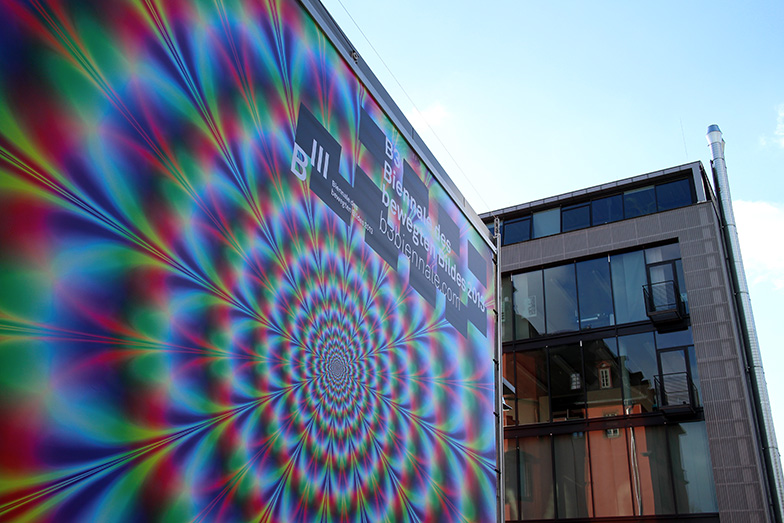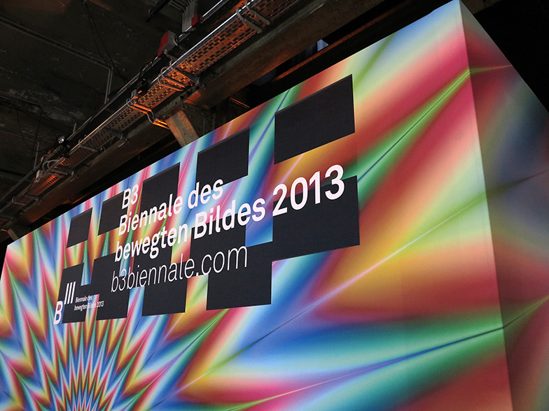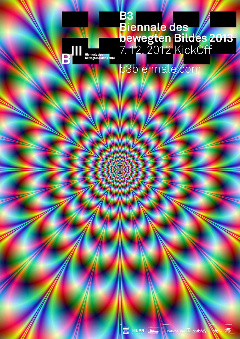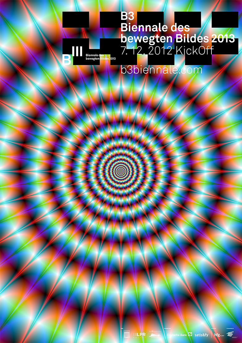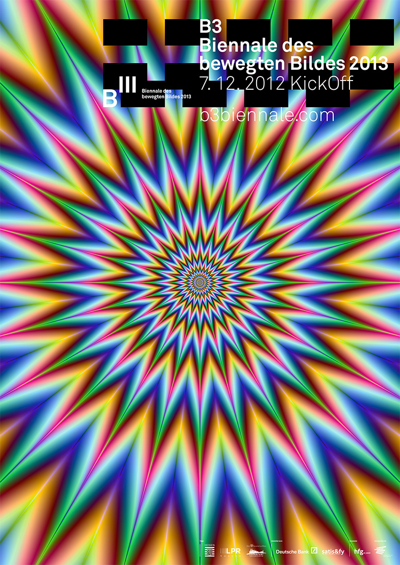 Graphic identity for the upcoming B3 Biennale des bewegten Bildes (Moving Image Biennial) in Frankfurt/Main. The still image creates the illusion of being animated through the use of pulsating imagery. — sure.is
