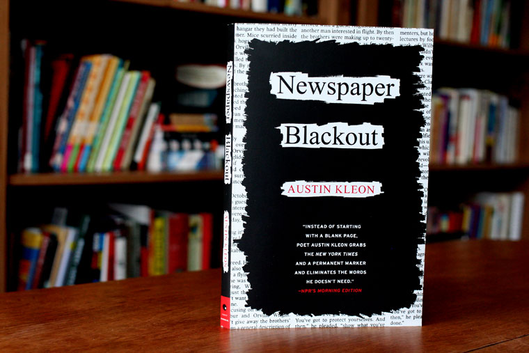 Newspaper Blackout by Austin Kleon Contributed by Stephen Coles on May 30th, 2013. Artwork published in 2010. Source: austinkleon.com License: All Rights Reserved. Newspaper Blackout is a best-selling book of poetry made by redacting newspaper articles with a permanent marker. Given that Kleon’s work is mostly made from the New York Times maybe the cover should be set in Cheltenham, not Times. Typefaces More about Times New RomanGet Times New RomanMore about InterstateGet Interstate Formats Books (6459) Topics Literature (3000) Tagged withbook covers (5800)suggested alternative typefaces (25)poetry (383) Post a comment Name Email – will not be published Website Your response Submit Comment More Times New Roman in use Funhouse magazine issue 05, 2018c. 2018Leo FieldContributed by Leo Field An & Verkauf Fundgrube, StralsundunknownContributed by Florian Hardwig The Secret of St. Brides text adventure game by The Games Mistresses1985unknownContributed by D Jones Sponsor More in Literature Sula by Toni Morrison (Alfred A. Knopf, Allen Lane)1973Wendell MinorR.D. ScudellariContributed by Florian Hardwig Faber Poetry titles2001PentagramJustus OehlerContributed by Chris Purcell Staff Pick Collection “Écrivains de Toujours”, Éditions du Seuilc. 1954unknownContributed by Florian Hardwig Staff Pick TIME: 85 Years of Great Writing2008Arthur HochsteinContributed by Jeremy Tankard More in Books Maserungen by Maria Jansenc. 2021Johannes StollContributed by Johannes Stoll Cute Accelerationism by Amy Ireland and Maya B. Kronic2024Maya B. KronicContributed by Maya Kronic Damaskuserlebnis by Luise Charlotte Klett2022Luise Charlotte KlettContributed by Luise Charlotte Klett Staff Pick Beauroma Books2022Lola Giffard-BouvierContributed by WrittenShape Type Foundry More Fonts In Use Quand Soudain2023Studio DoubleContributed by 205TF Staff Pick Midnight Sailing1936unknownContributed by Florian Hardwig Staff Pick Interview magazine (2018–)2018Richard TurleyKurt WoerpelJack VhayContributed by Garrison Martin Staff Pick Fermé2020Anjela FreyjaContributed by Anjela Freyja Staff Pick