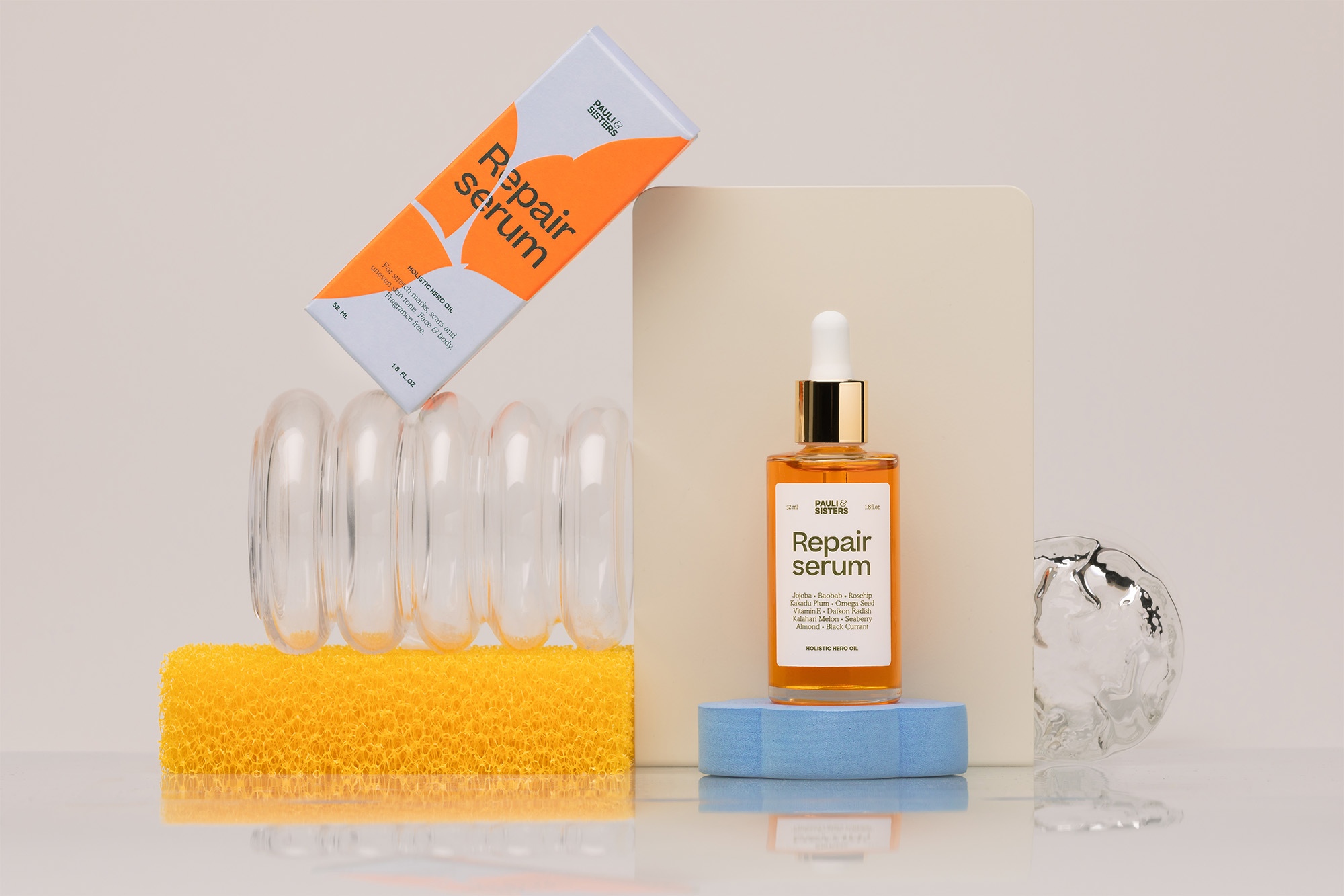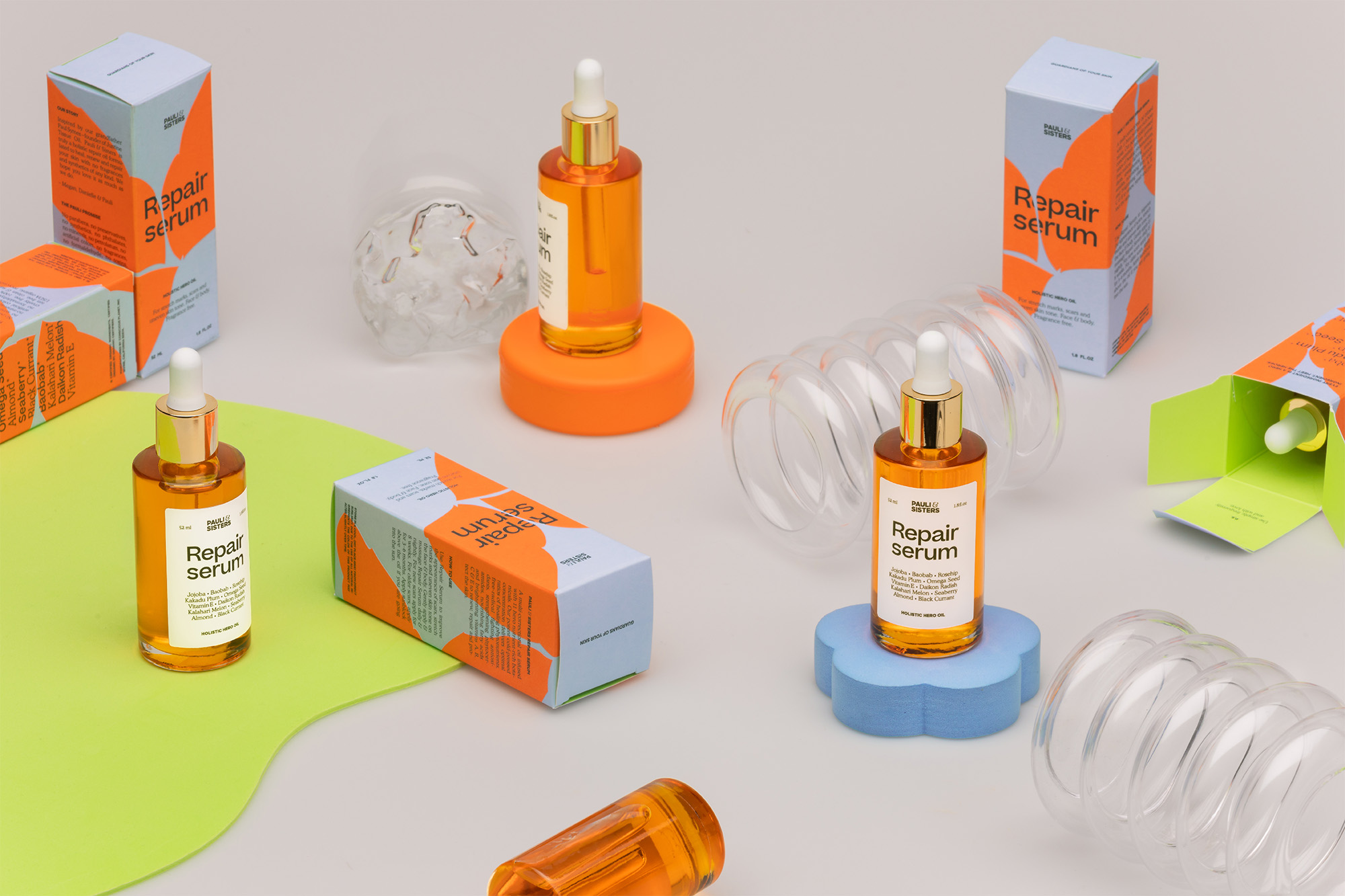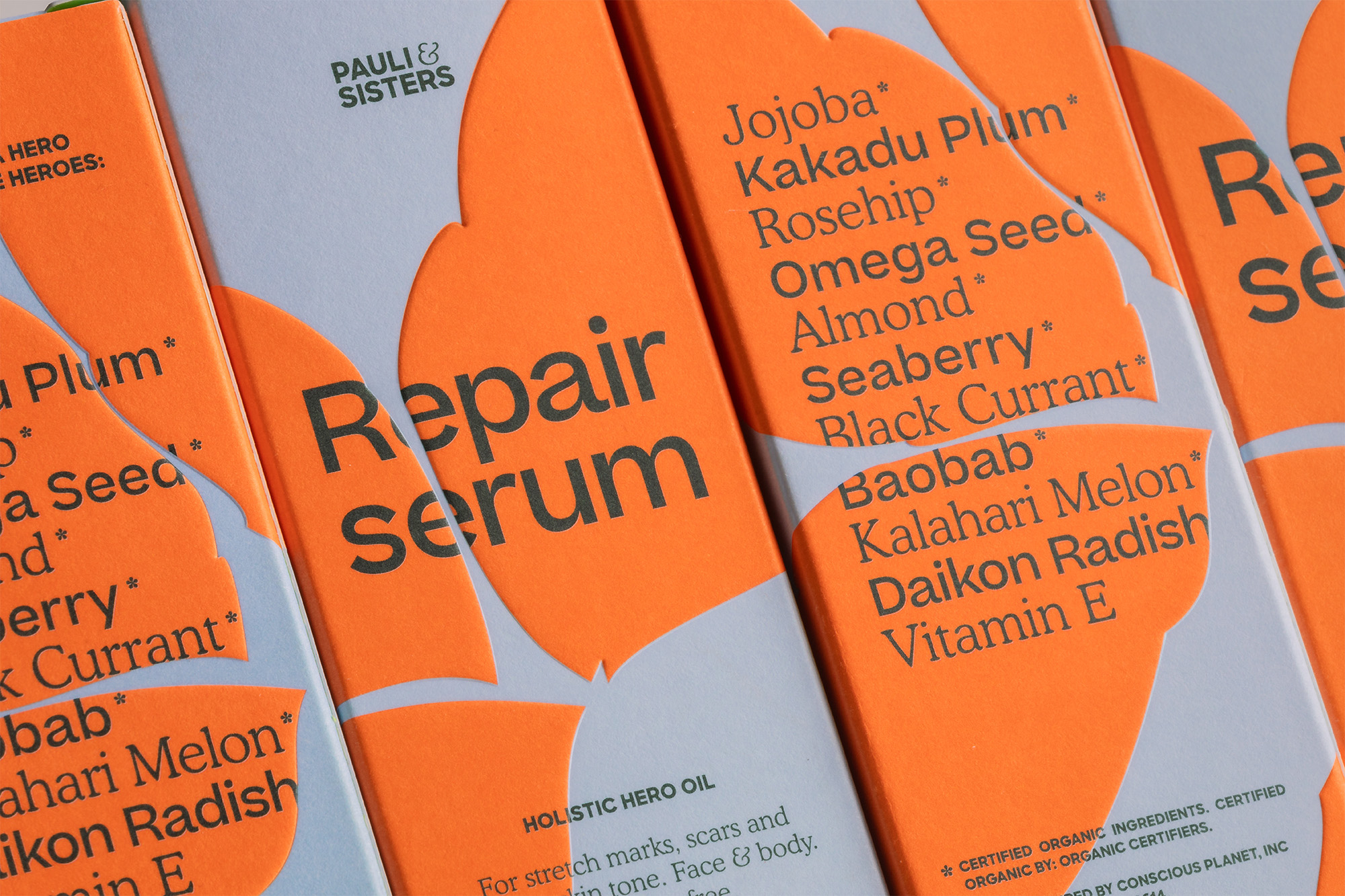 Pauli & Sisters is a family-owned skincare brand based in California whose main product is a plant-based Repair Serum that boosts cell and collagen production, eases inflammation, heals scarring, and evens the hyper-pigmentation and circulation to the skin. The brand’s packaging uses a mix of Sharp Sans, Beatrice, and Cooper BT. The logotype uses the extra bold capitals from Sharp Sans and pulls the whimsical, light-weight ampersand from Cooper to contrast.