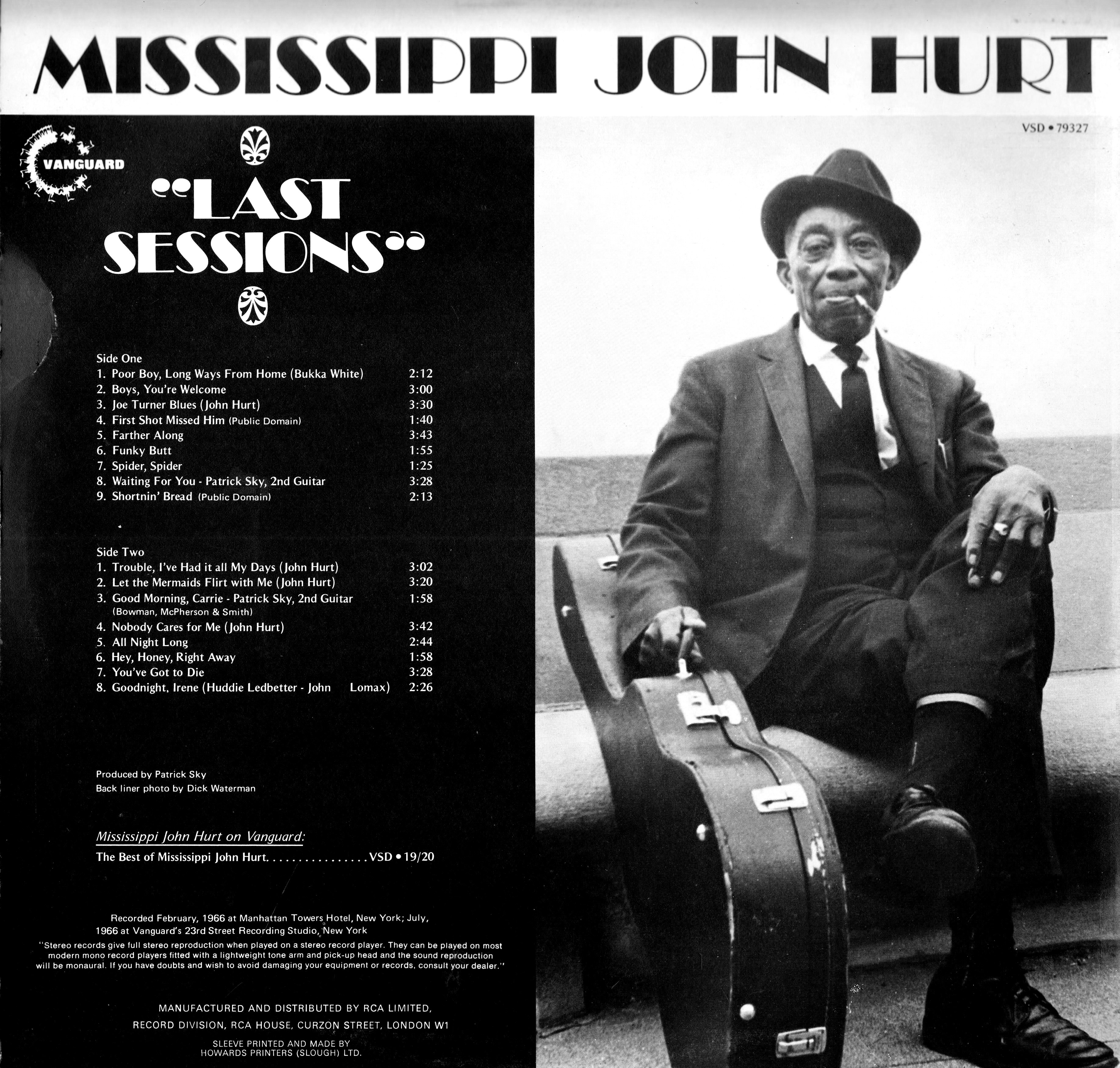 Last Sessions is an album by country blues singer and guitarist Mississippi John Hurt (1893–1966). It was recorded at a Manhattan hotel in February and July 1966, and released in 1972 by Vanguard Records. Design by Jules Halfant, with photography by David Gahr (cover) and Dick Waterman (back).