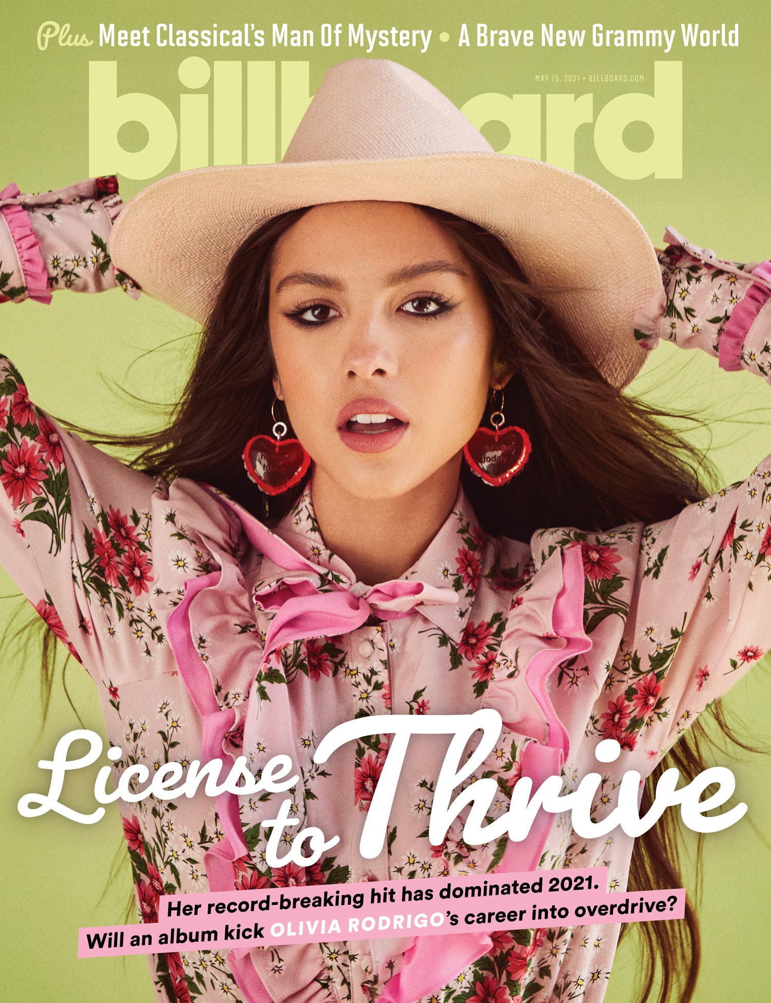 The cover was likely designed by Billboard creative director Andrew Horton. The photograph was taken by David Needleman. Rodrigo wears a floral, ruffled Rodarte shirt, a blush cowboy hat from Gladys Tamez Millinery, and Marc Jacobs drop plastic heart earrings.
