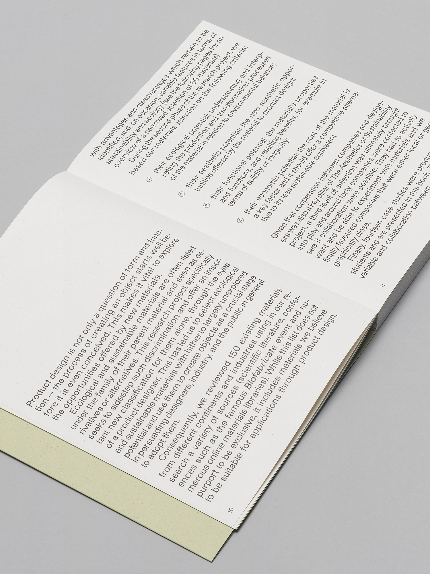 This volume summarizes the results of “The Aesthetics of Sustainability”, a research project led by ECAL/Ecole cantonale d’art de Lausanne. It brought together master’s students of product design, established materials specialists, manufacturers and researchers with the aim of exploring and defining the aesthetic potential of a new generation of sustainable materials.