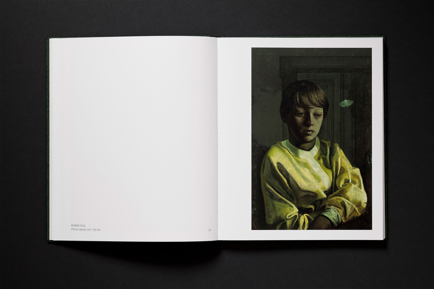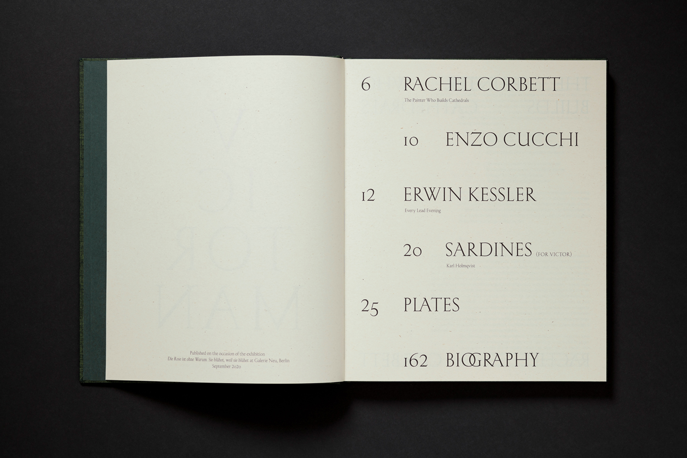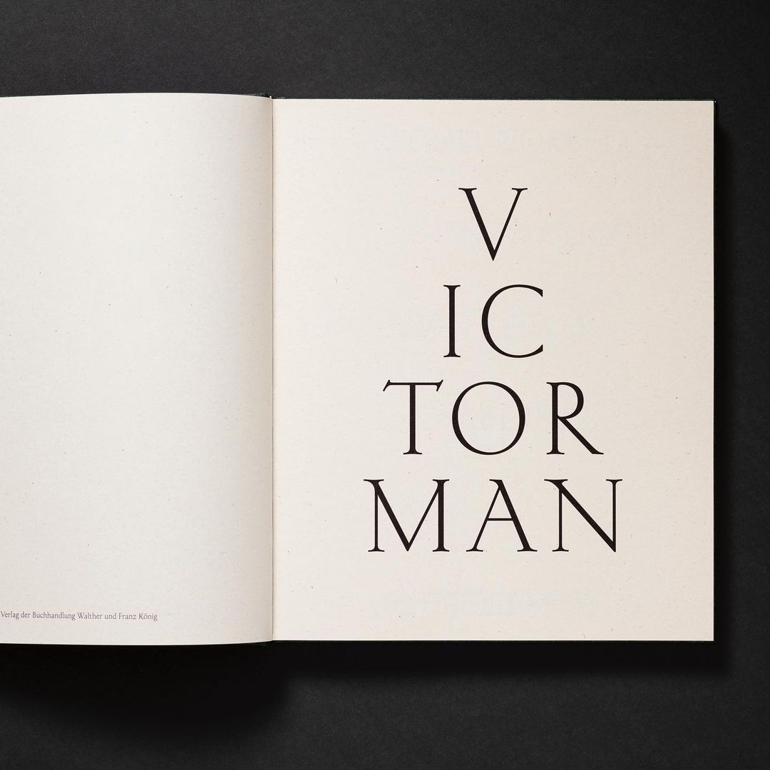 For an exhibition of the artist’s work in Berlin in 2020, Galerie Neu published a monograph and commissioned Atelier Dyakova for the design. Sonya Dyakova picked up the color codes of the paintings for the cover, using a dark green textile to host the black letters of the name of the artist. On the inside, we find a combination of two paper stocks: a cream-colored one for texts that keeps the reader in the imaginary of a classical book from a few centuries ago while adding a soft and sensual touch to the publication, and a white glossy paper to ensure the quality of the reproductions. The book is set in Kessler, designed by Alaric Garnier and produced by Production Type. The use of an inscriptional typeface finds its reason in a painting where Man takes the classical pattern of the mention “A. D.” (Anno Domini), as found inscribed in churches, and turns it into a halo for a reclining portrait. The use of Kessler amplifies the general impression of disturbing strangeness, making the epoch of the paintings even less identifiable.