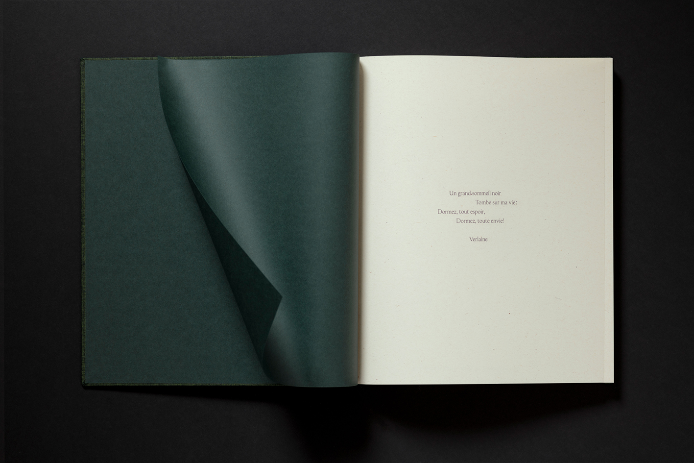 The book closes with a quote from the French poet Paul Verlaine, “Un grand sommeil noir / Tombe sur ma vie / Dormez tout espoir / Dormez tout envie!” (“A big black sleep / Falls on my life / Sleep all hope / Sleep all will”): yet another reference to the galaxy that Victor Man conveys, but that unifies the overall feeling he creates – an obscureness that is echoed in the closing dark green pages.