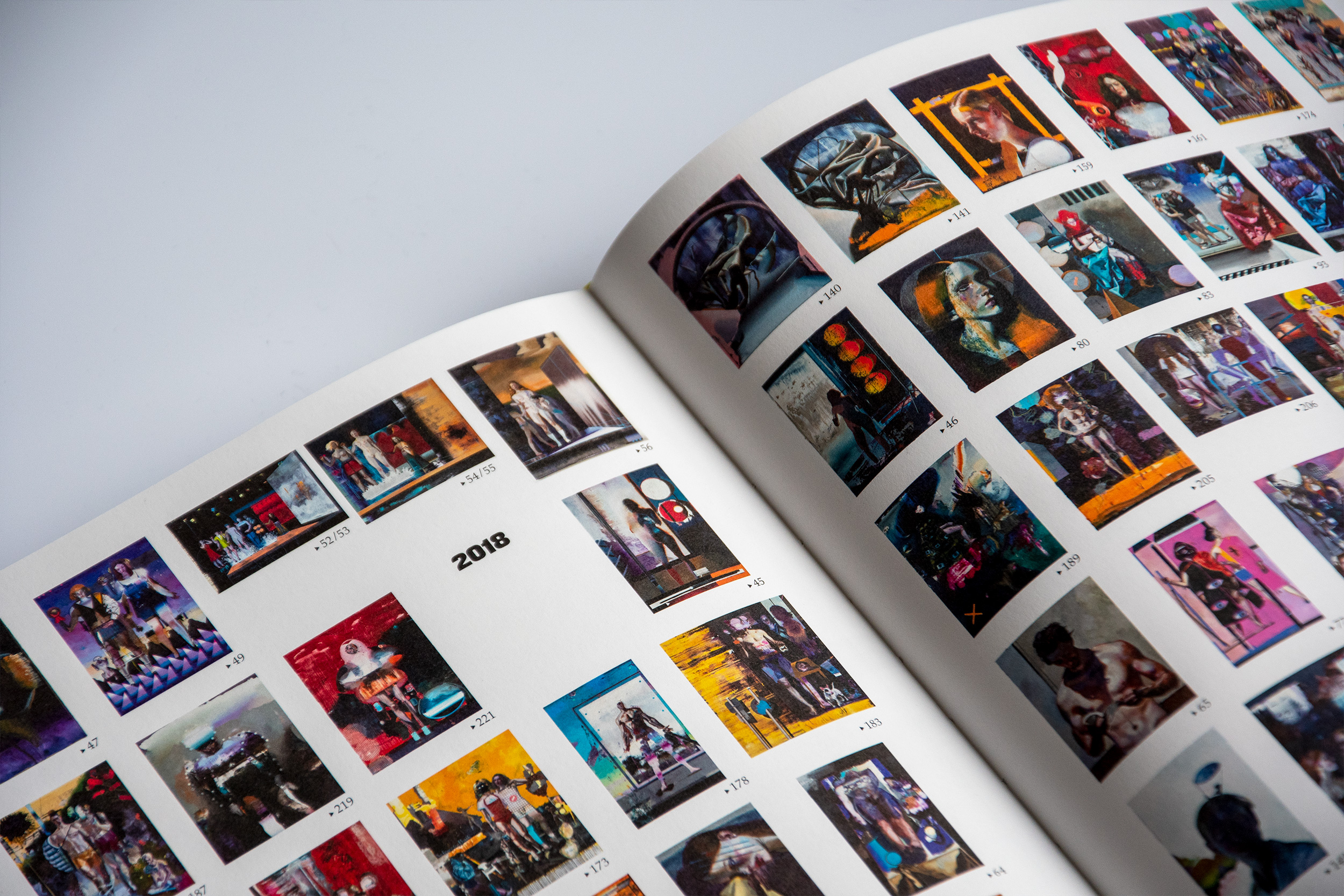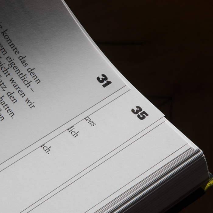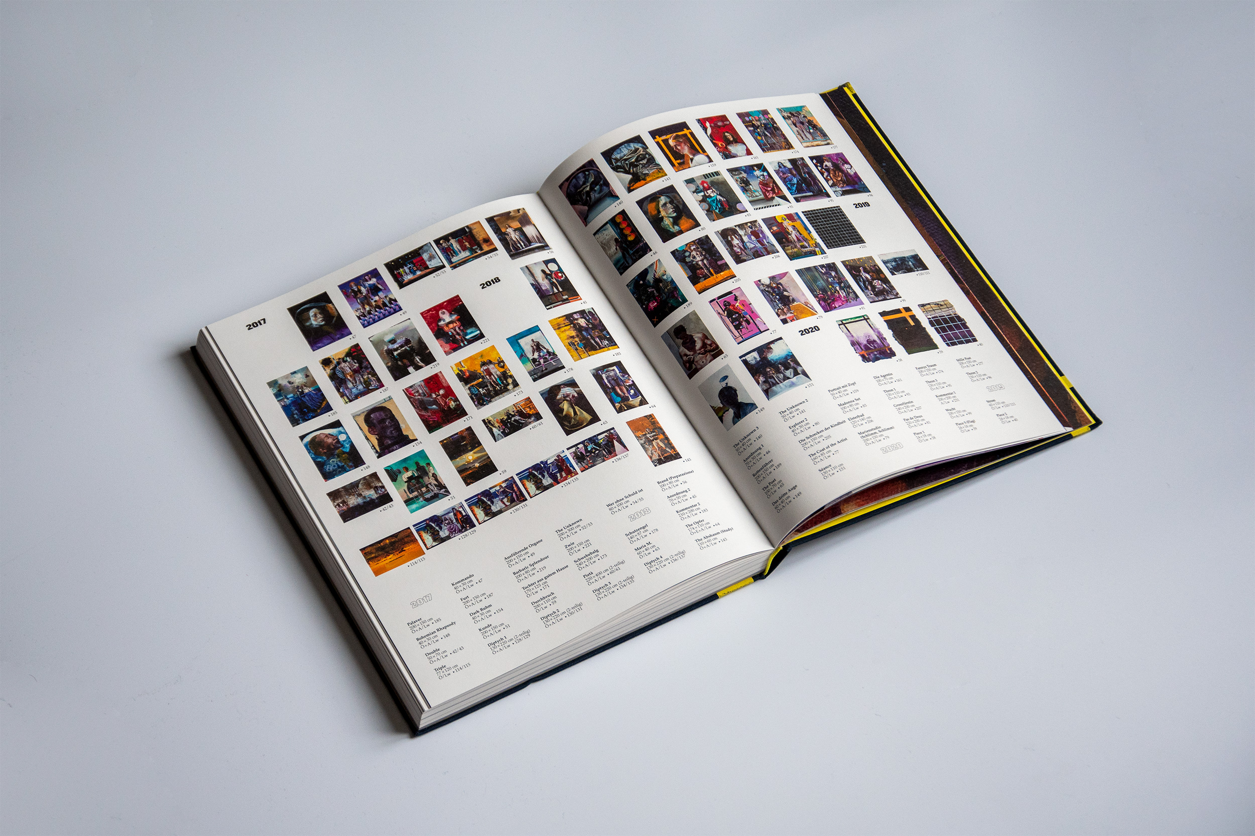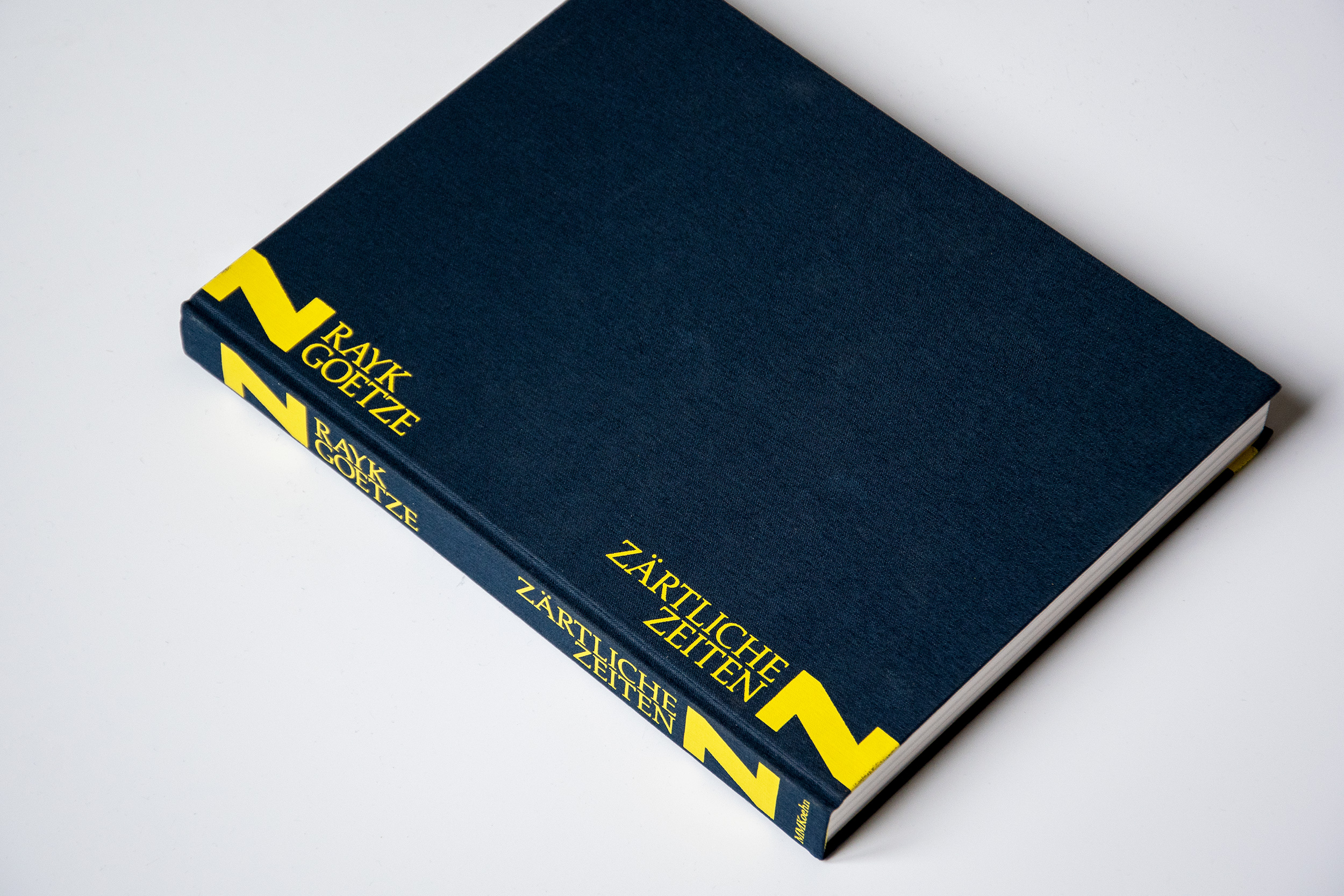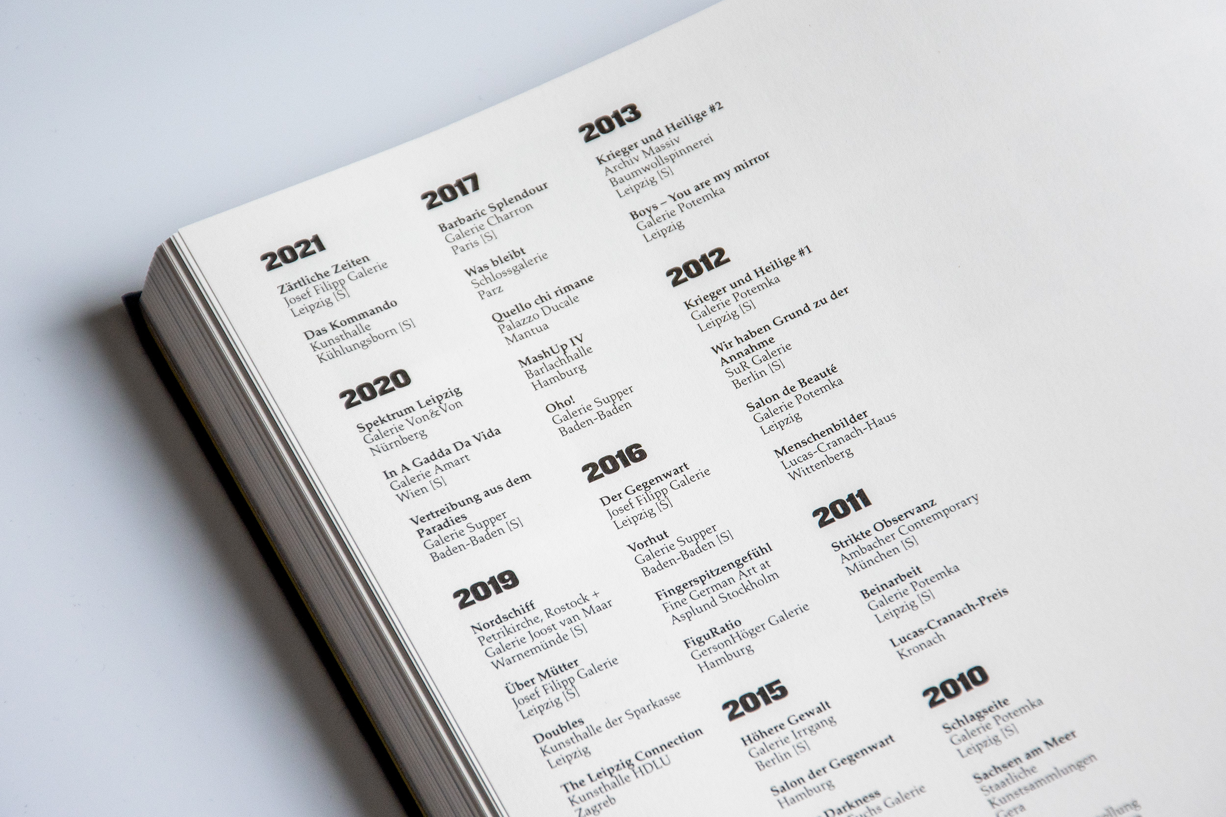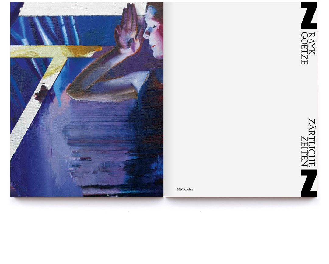 At the occasion of an exhibition at Josef Filipp Galerie in Leipzig, MMKoehn Verlag published a monograph titled Zärtliche Zeiten (literally “tender times”). The book designed by Simone Vollenweider shows productions spanning from 2017 to 2020, and is introduced by an essay written by Heike Geißler. The catalog is structured around a stylistic duality, represented by the typographic choices of brand new Tempel Grotesk (2021) from Production Type and Palatino (1950) from Linotype. Tempel Grotesk was designed by Reymund Schröder and is a black sans that plays on the heaviness of block-like letters on the page. This association makes sense when it faces the paintings: we see immediately how the large solid-color brush strokes give structure to the figurative detailed sceneries and how it disturbs the spatial perception of the paintings, where background and foreground merge. The two capital Z’s from Tempel Grotesk’s most condensed width, screen printed on the corners of the cloth cover, look like two abstract touches of paint that punctuate the format of the object. Besides, the layout of the book mixes horizontal and vertical text, then again, reminding us of the dynamics of the paintings’ compositions.
