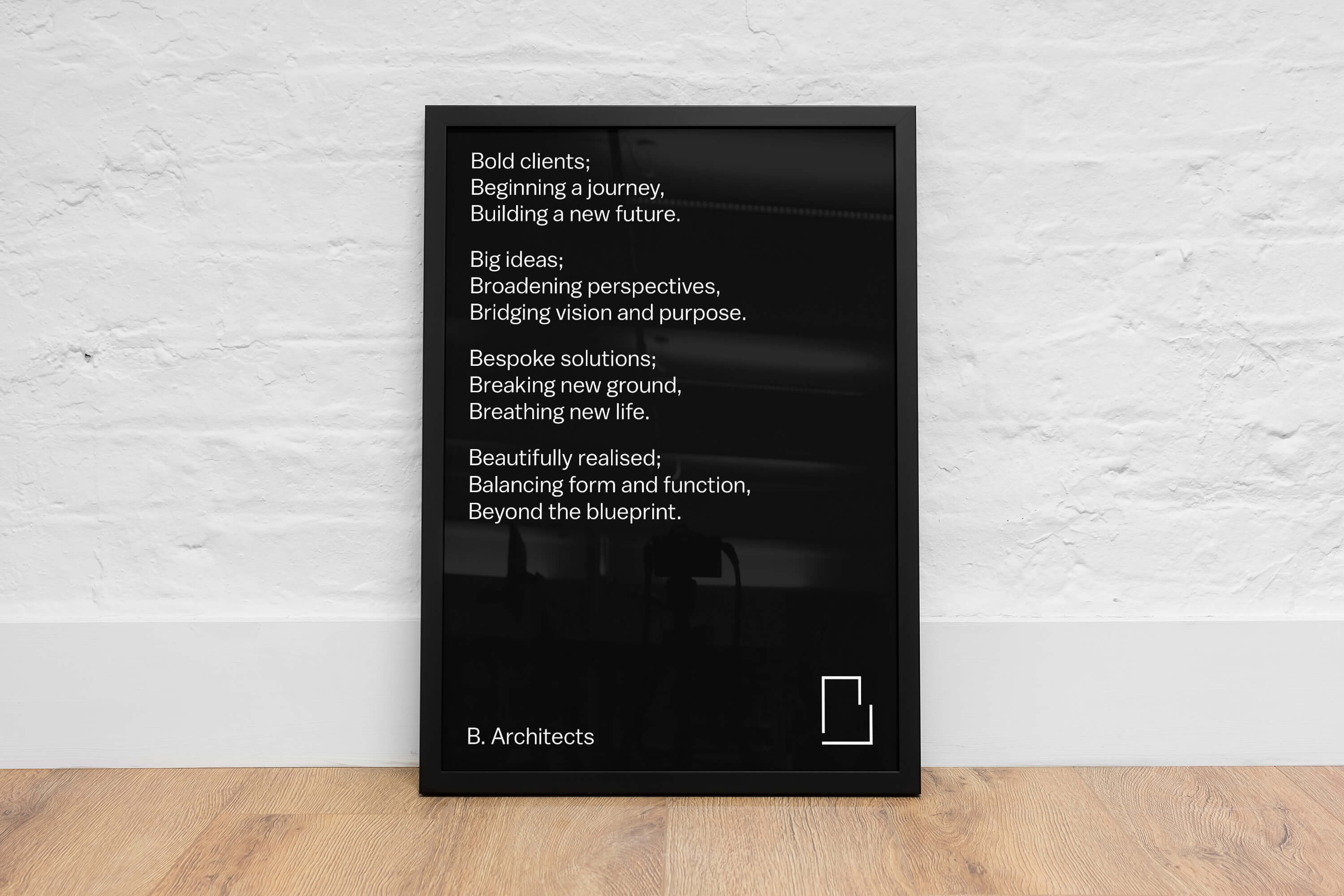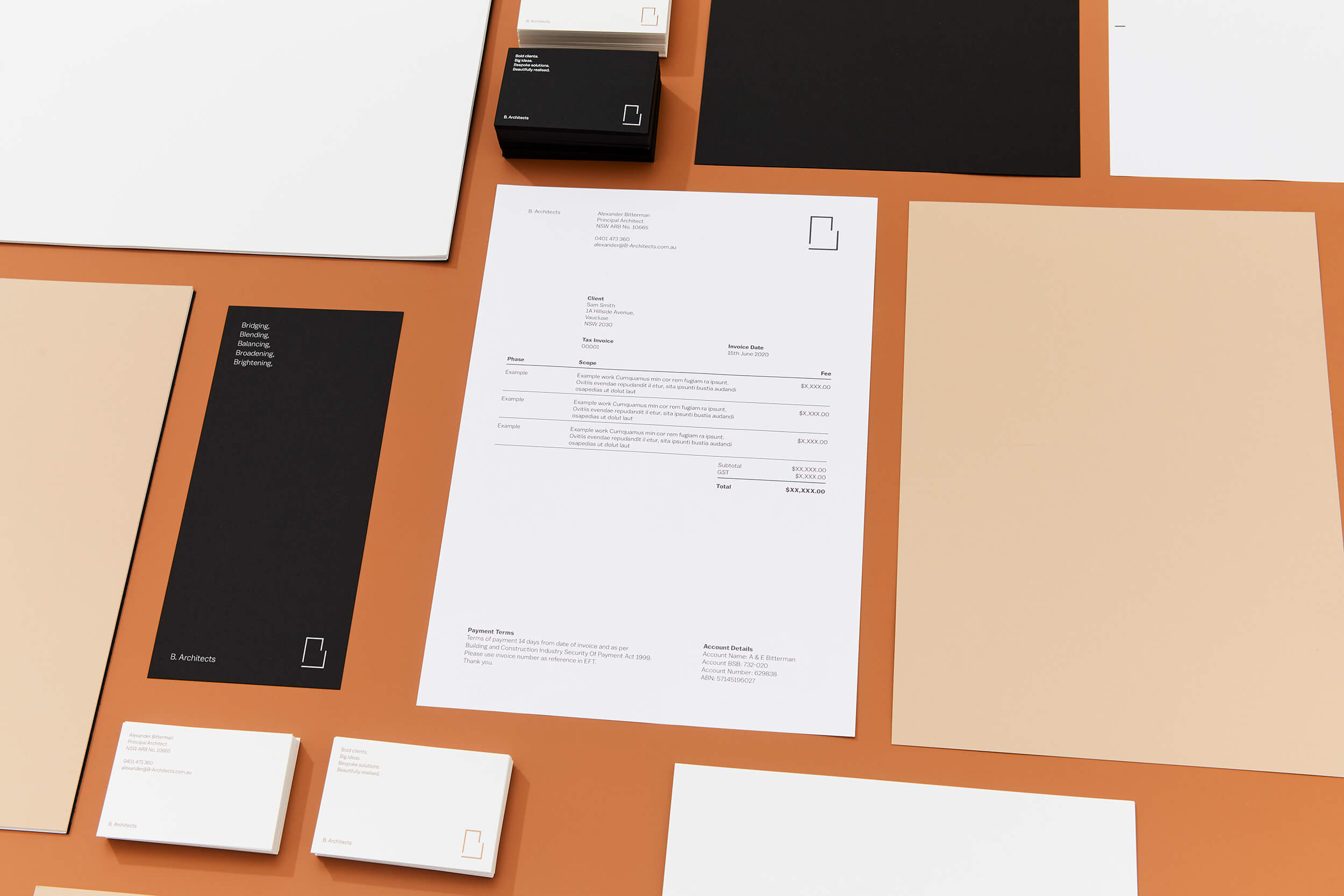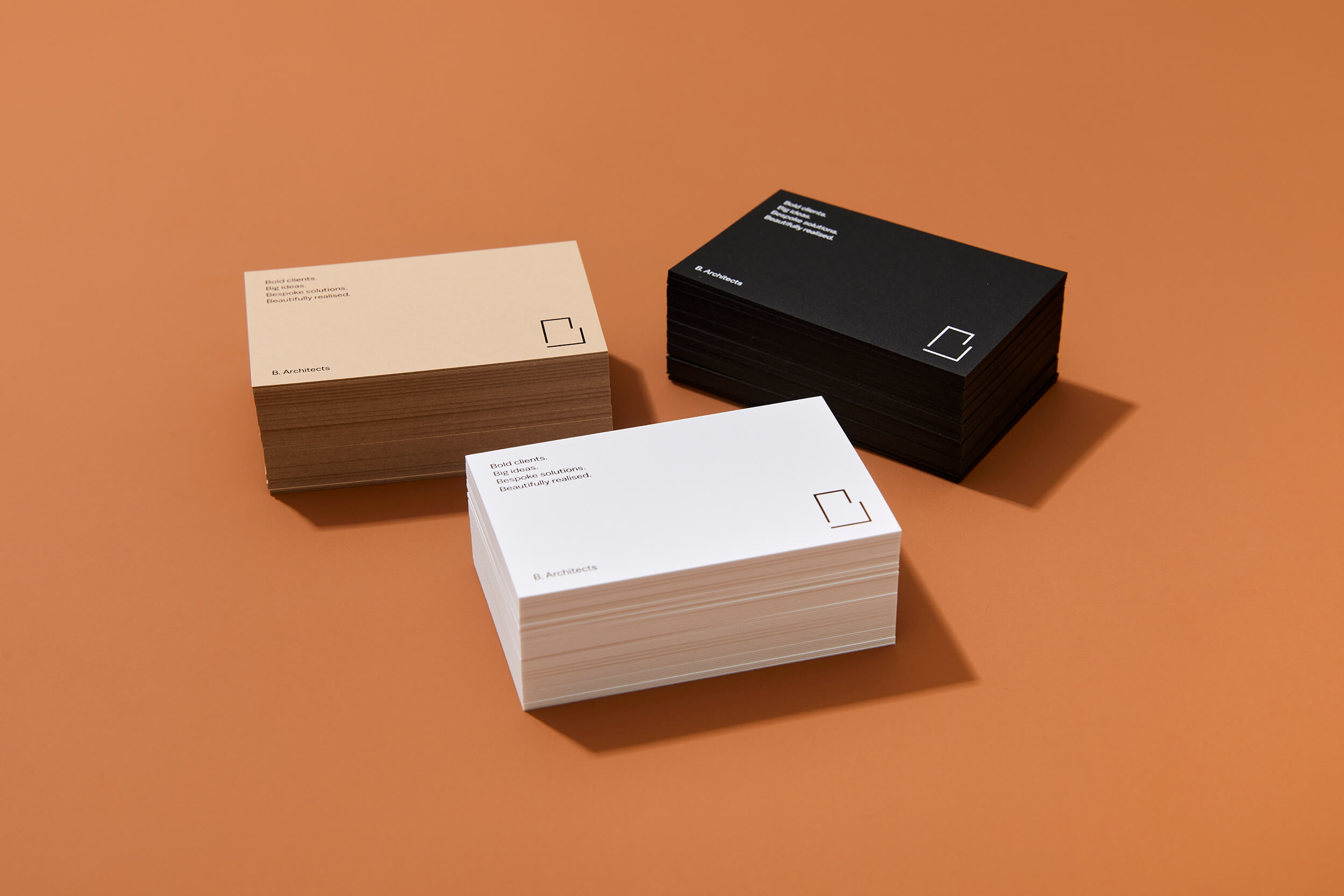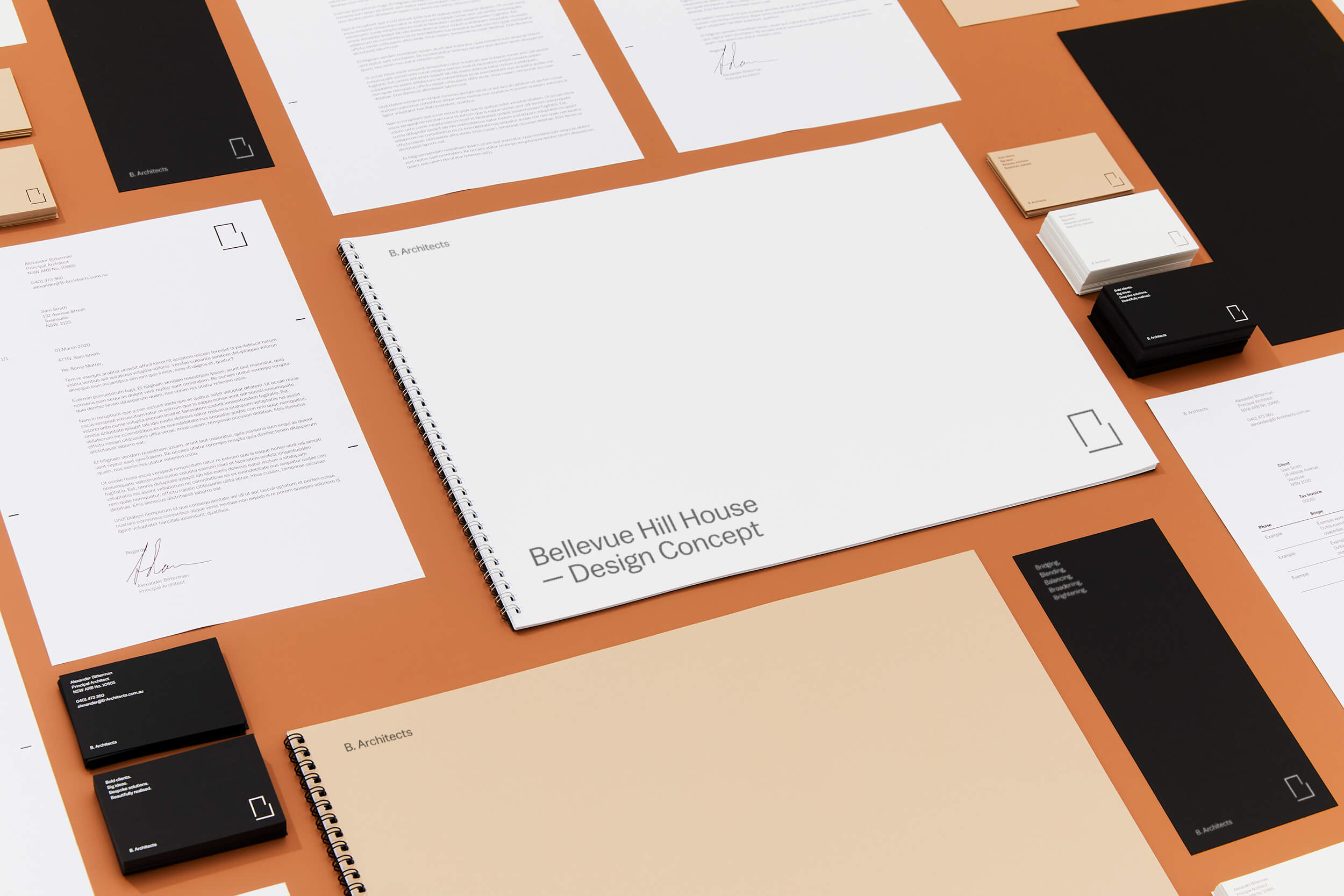 Alexander Bitterman is an experienced architect who works with commercial and residential clients. He was looking to set up his own practice and approached me to help with naming and brand identity. We discussed name options and opted against the traditional practice of using ones surname or an acronym and instead we chose the first letter of his surname, B. Architects. This then gave me the idea ‘what if we based the whole identity around the letter B?’ This lead to the colours Black, Beige, Blank and Bronze, using the Balto Book and Bold fonts and also the brand outline ‘Bold clients, Big ideas, Bespoke solutions, Beautifully executed’. The B logo was informed by Alexander’s open approach and styled around the forms of floor plans. This was paired with the name set in the brand font at the same scale as the text on the page.