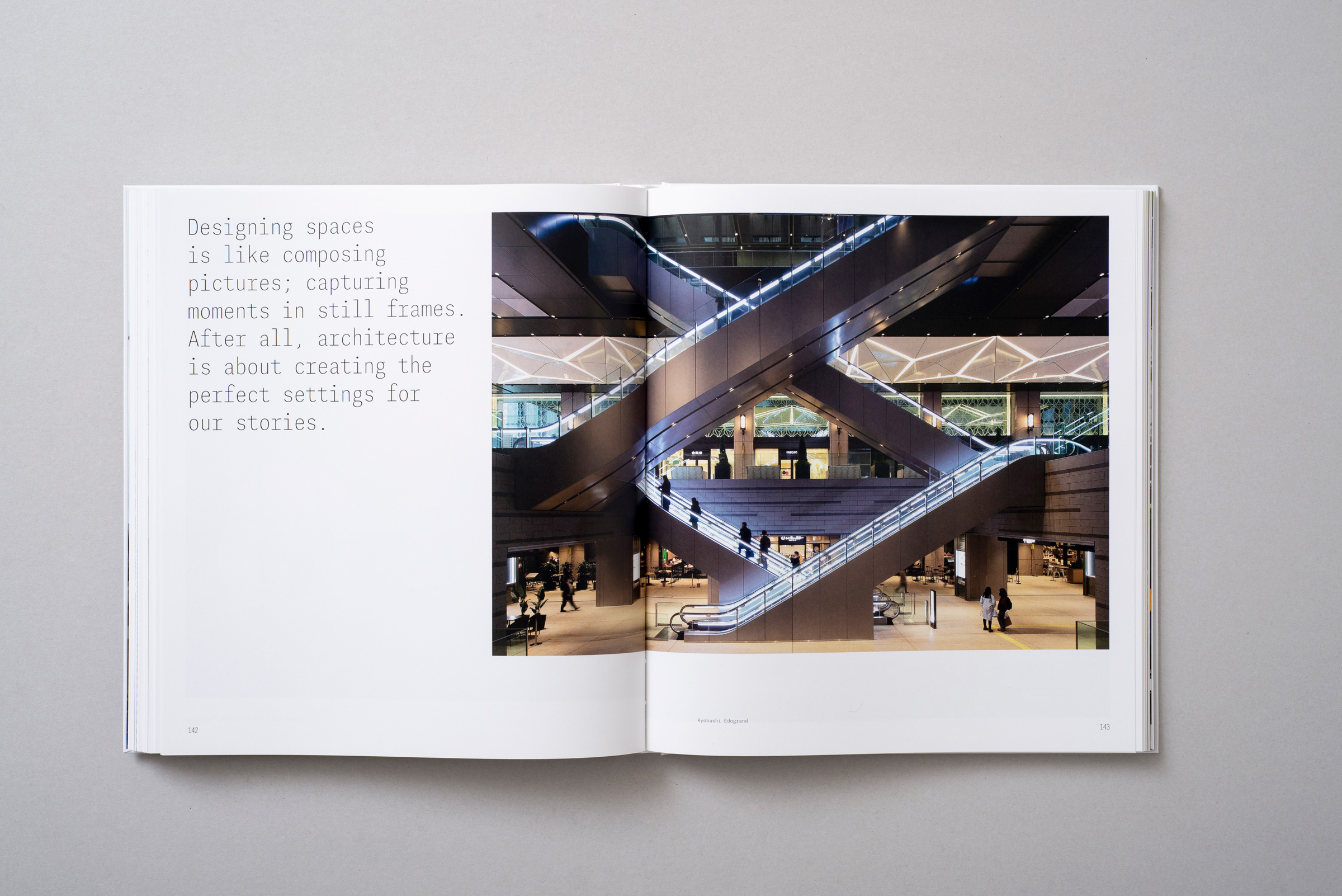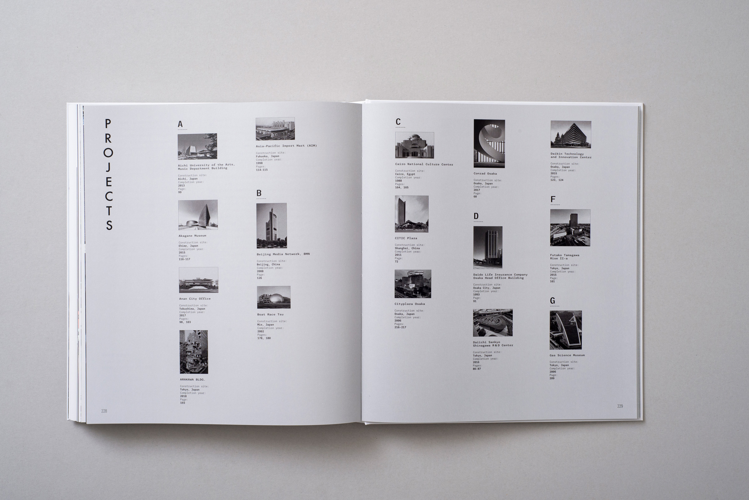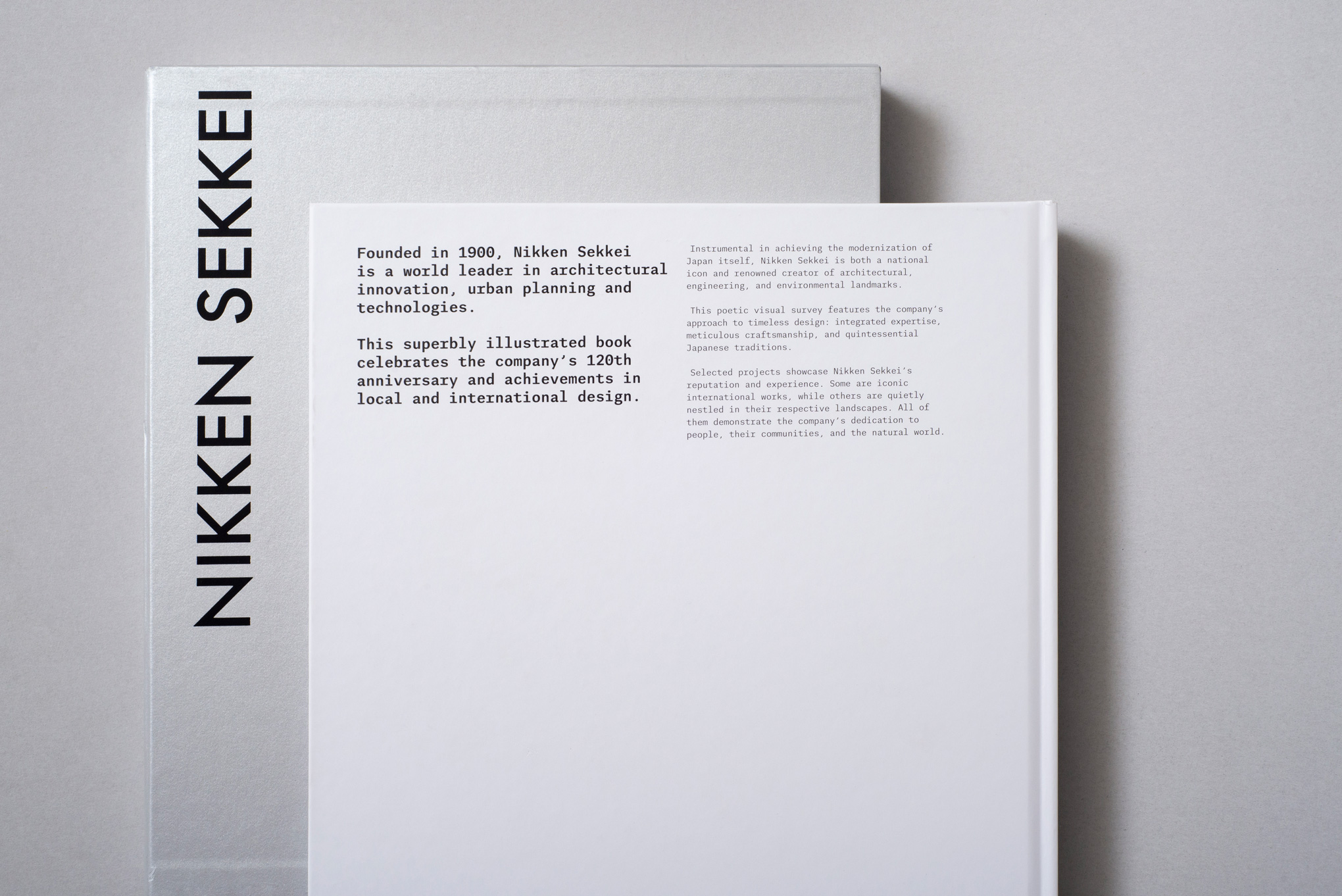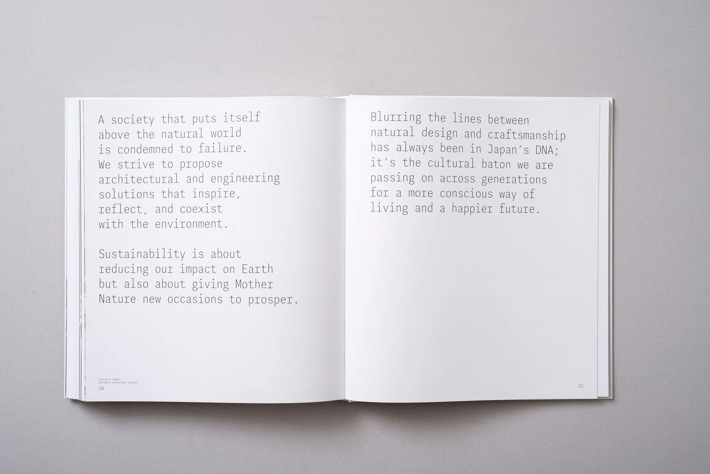 The book’s layout is inspired by Japanese typographic traditions and clean spaces, featuring Futura – Nikken Sekkei’s institutional font – and the monospaced Iki Mono in several weights.