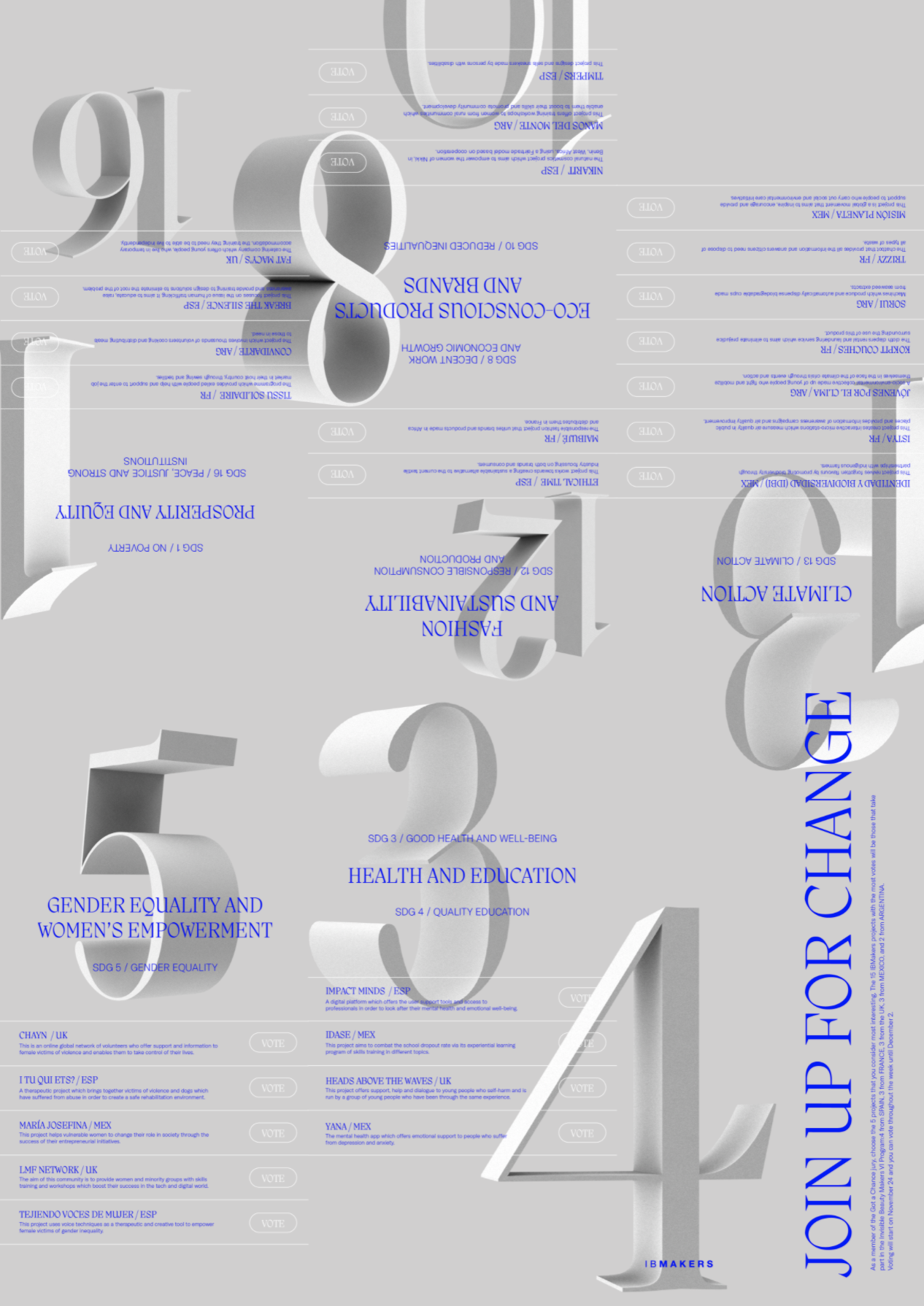 In this proposal we used Saol Text with frugal 3D effects and motion graphics to identify the main SDGs (United Nations sustainable development goals) of each project, an inclusive agenda that inspires IBMakers to promote projects in this direction.