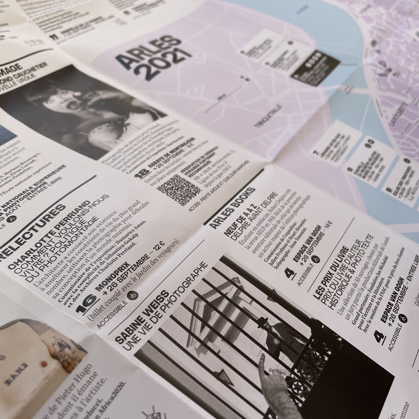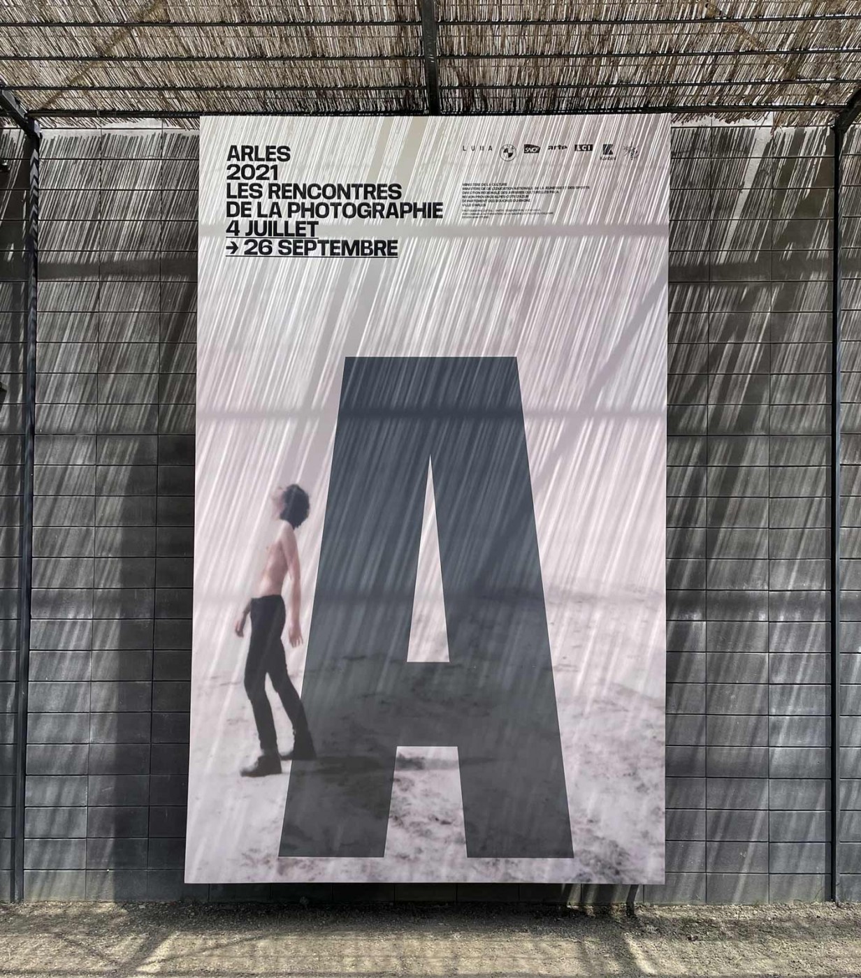 For its 2021 edition, the Rencontres d’Arles gave the responsibility of its identity to ABM Studio, specialized in graphic design for cultural institutions. After two years of Covid crisis that restricted the access to culture, this year’s identity had to be strong to mark the return to museums and galleries. ABM Studio chose to play with a bold capital A as main marker for the festival, whose anchoring in Arles is known to anyone interested in arts in France. The main poster for the festival is therefore only composed of a capital A from Media Sans by Production Type, shown next to a photograph of a dazzled figure coming into light.