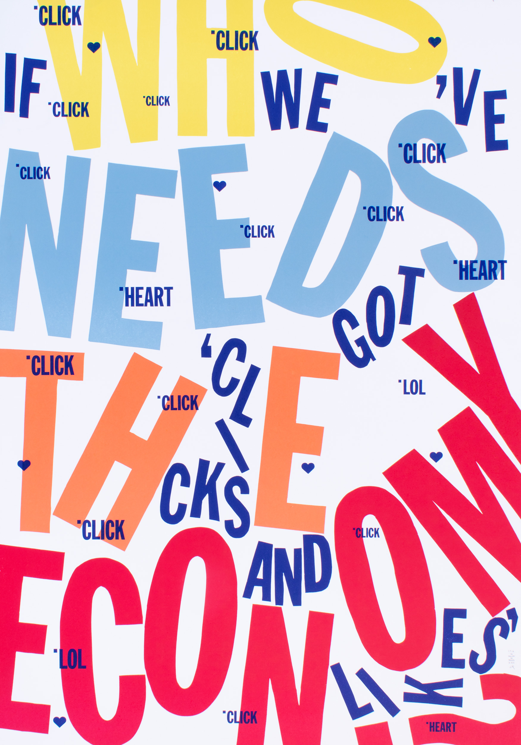“Who needs the economy…if we’ve got ‘clicks and likes’.” Letterpress printed with hand-cut linoleum and freshly set Ludlow slugs of Franklin Gothic Extra Condensed. From the series “The absurdity of the moment”, a visual diary about the 2020/2021 Covid-19 pandemic.