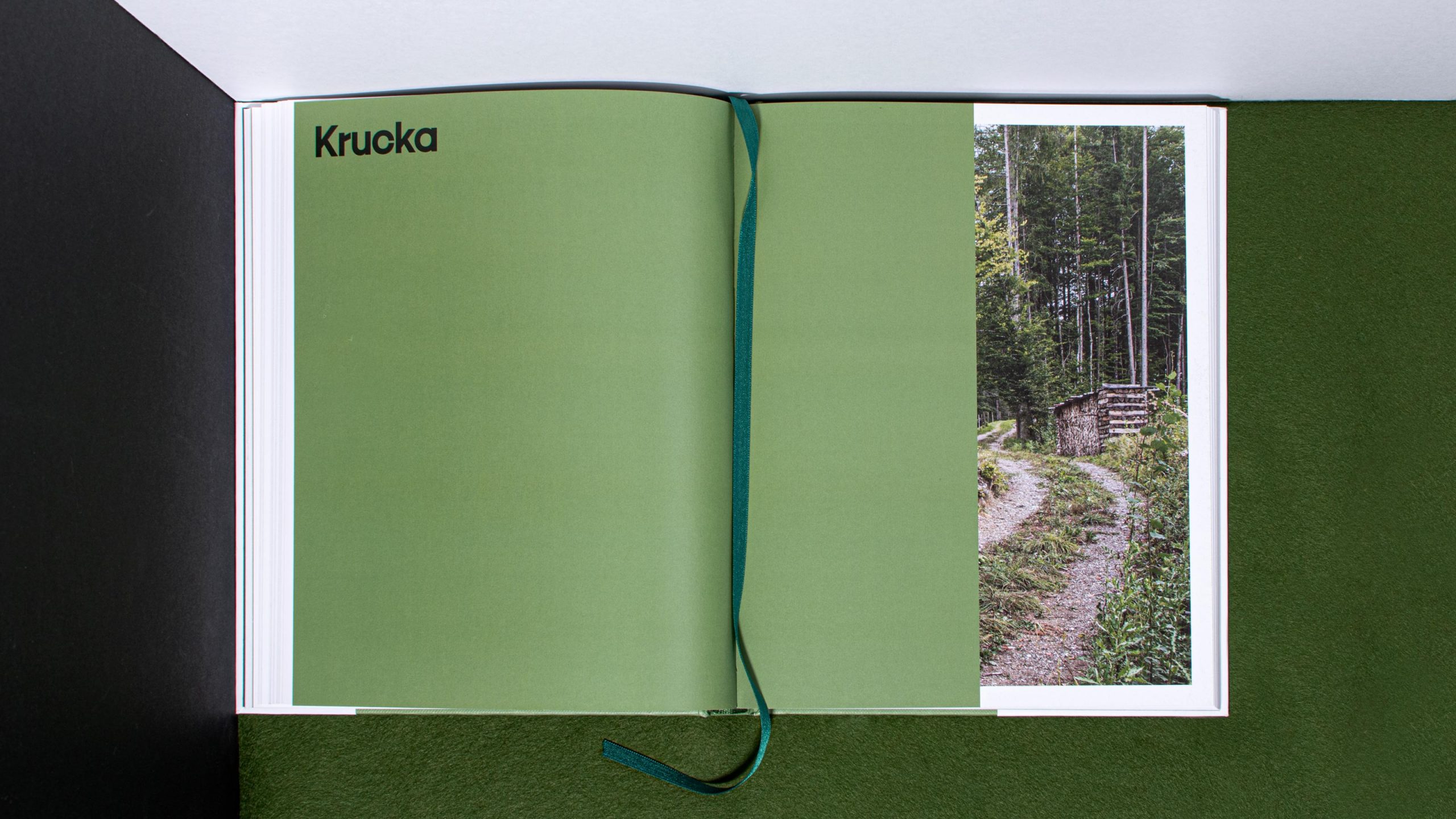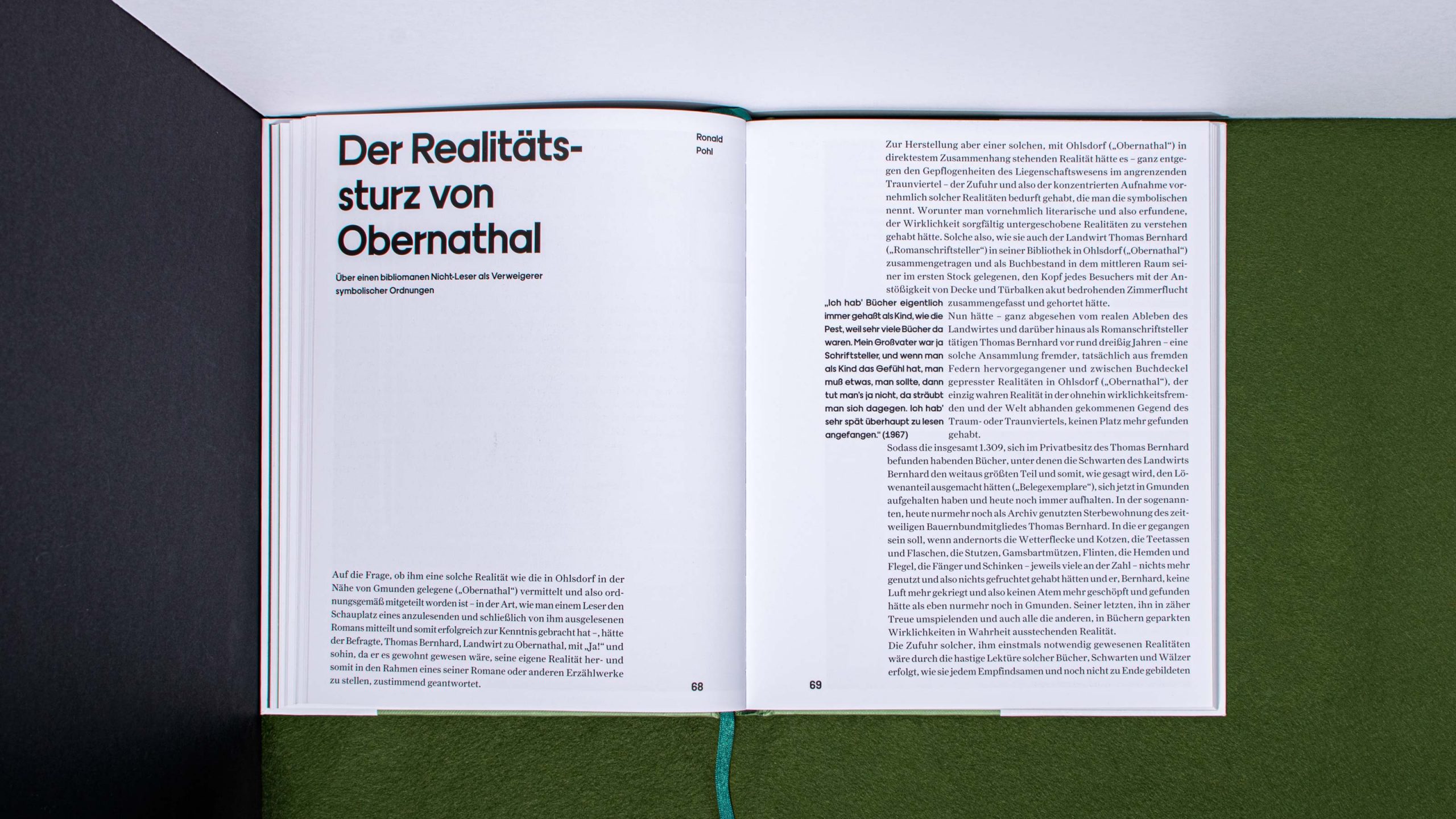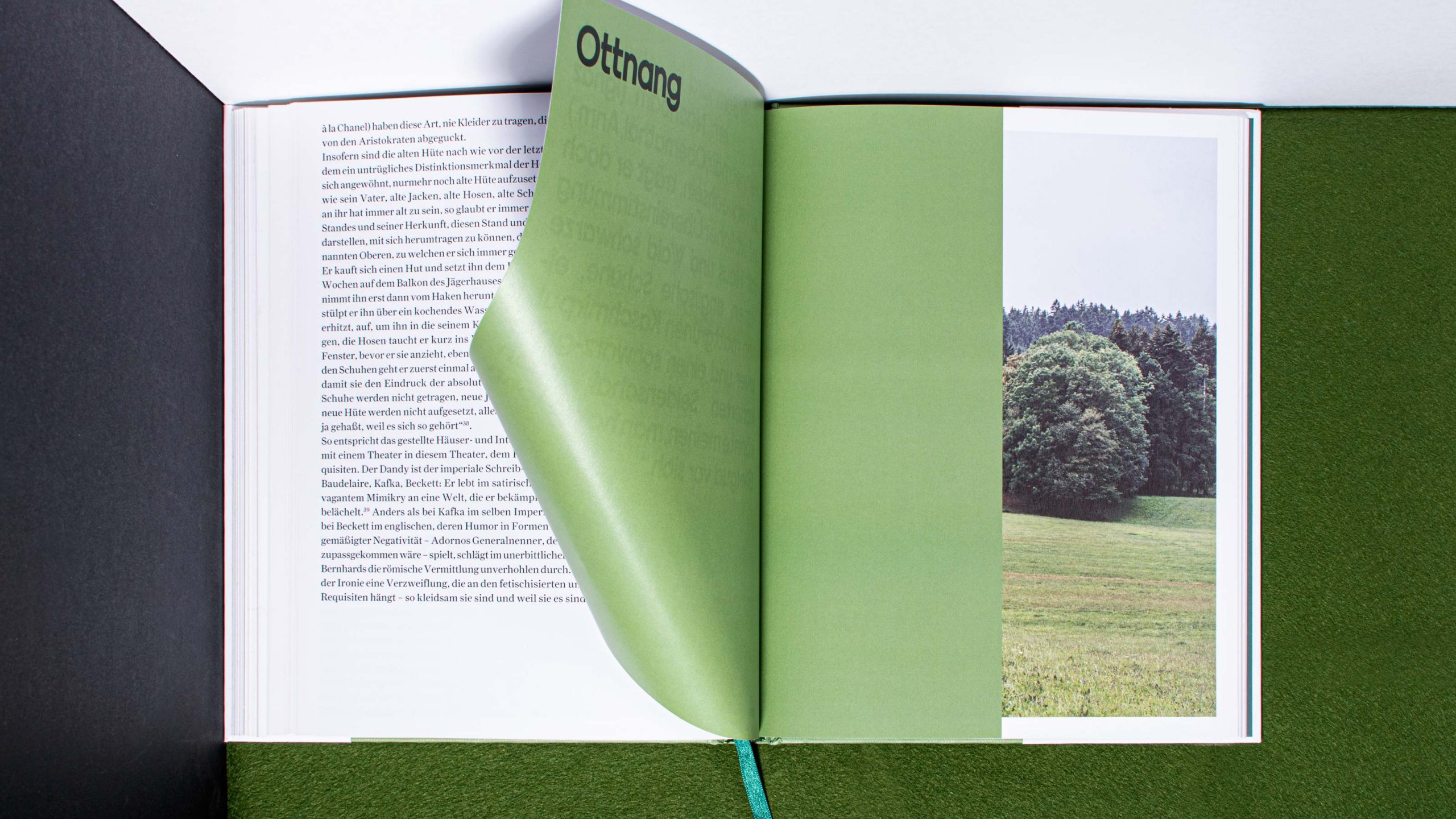 The graphic design of the hardcover publication is the work of Capitale Design Studio, operating in Berlin and Vienna. Their colour scheme of black, white and green might be seen as a reference to the rural sites the book presents. Regarding the layout, the designers chose to emulate the Bernhardian manuscript style, with tight insertions and small margins.