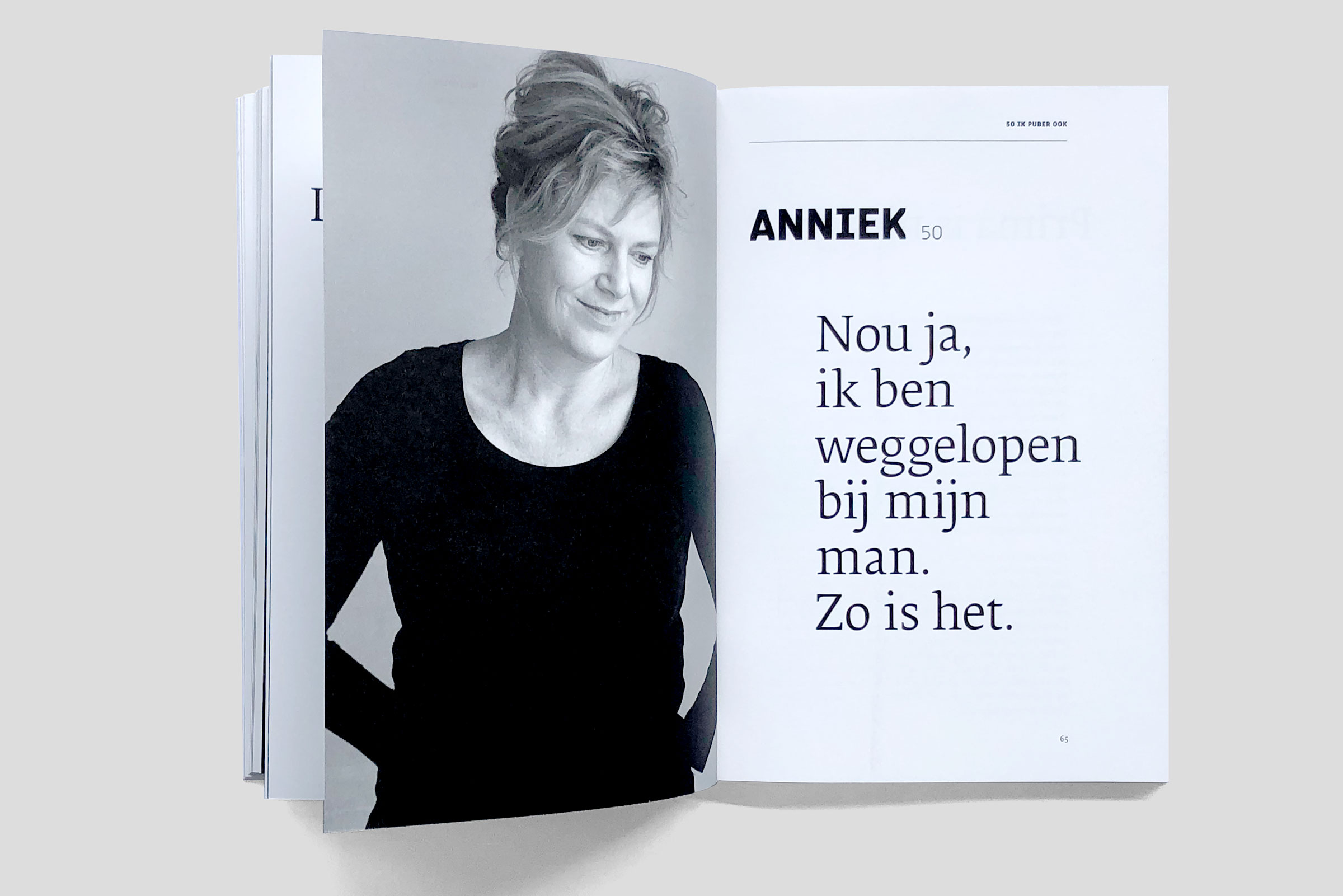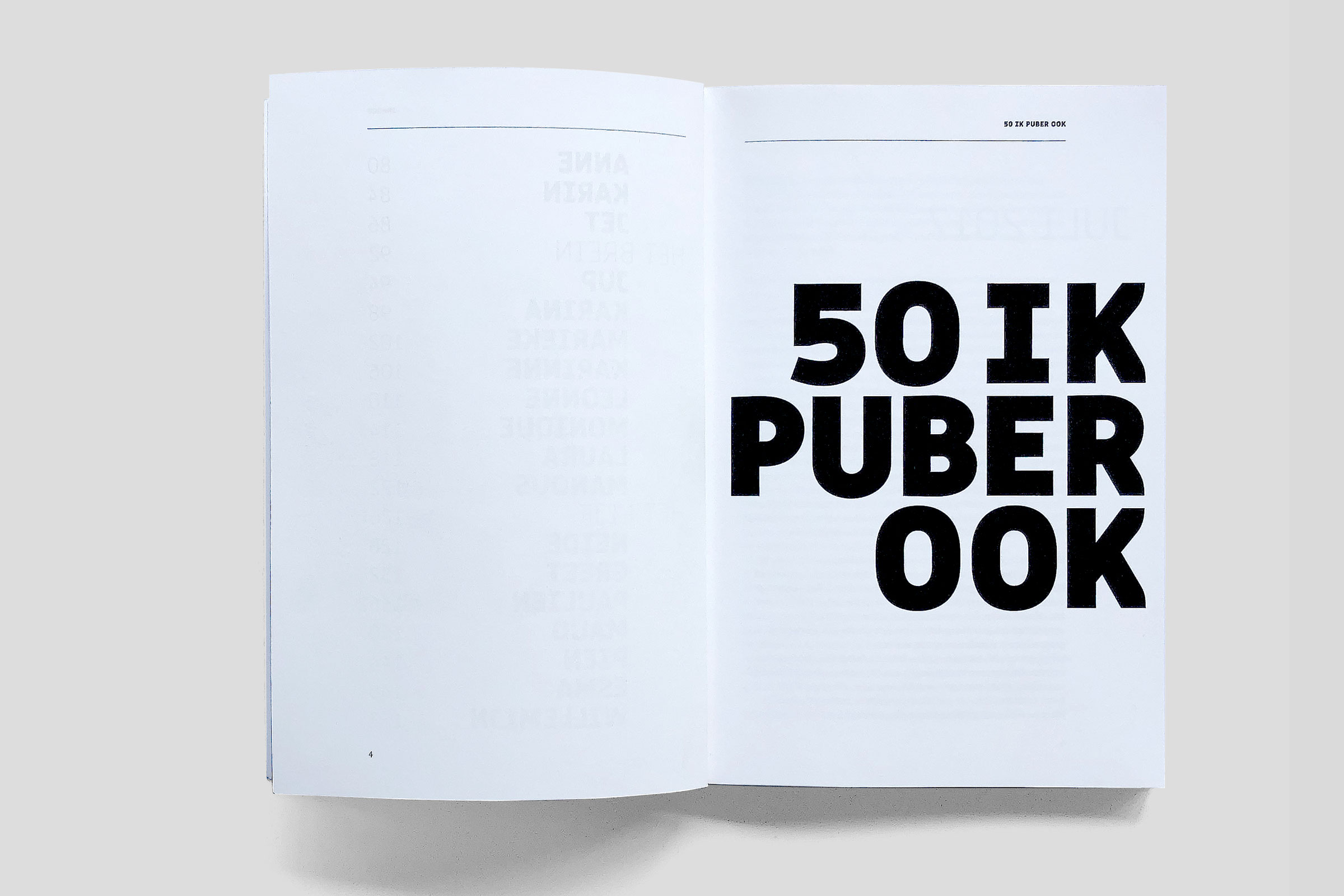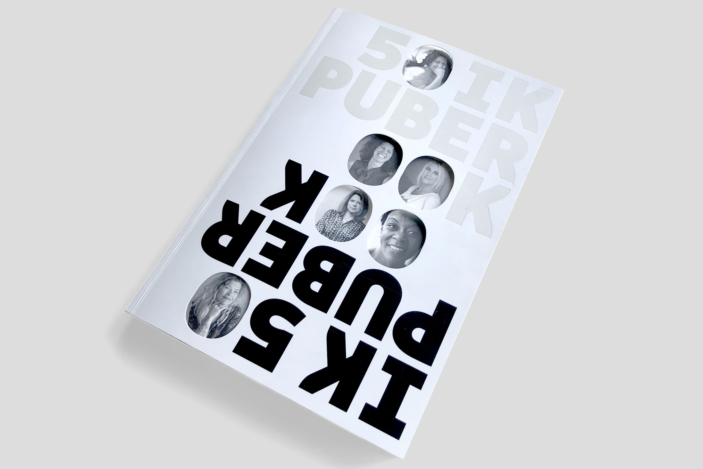 50 Ik puber ook (“50 I reach puberty, too”) is about a turbulent phase of life for women. This becomes clear in the thirty-five portraits included in this book. Thirty-five photos and thirty-five stories. Thirty-five differences and some striking patterns. Four essays provide context.